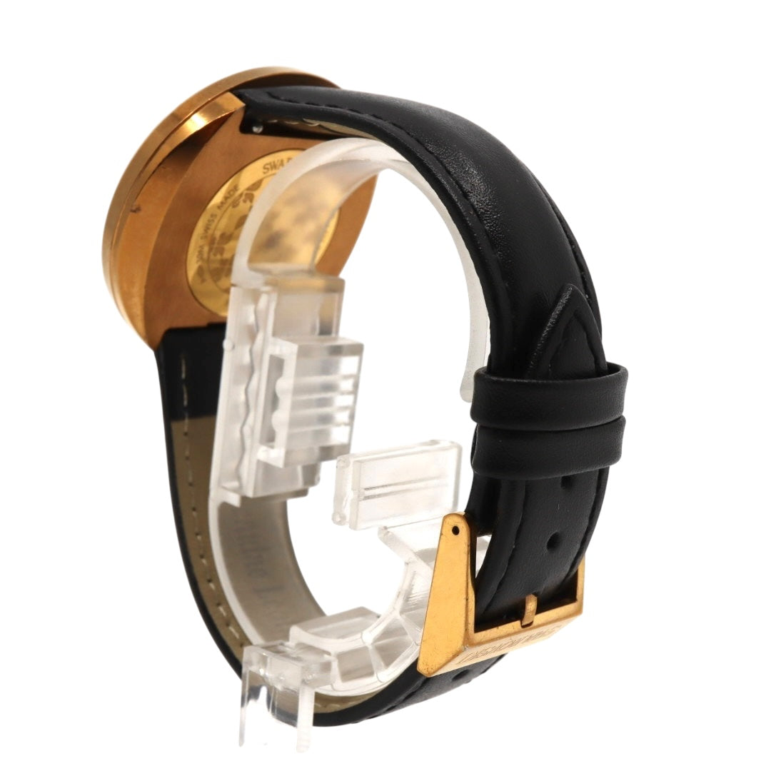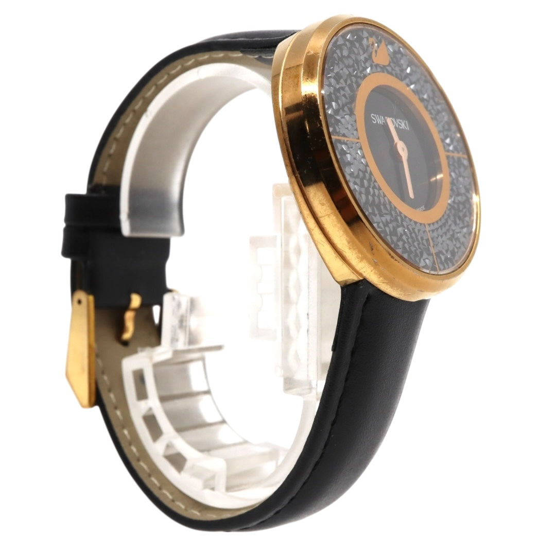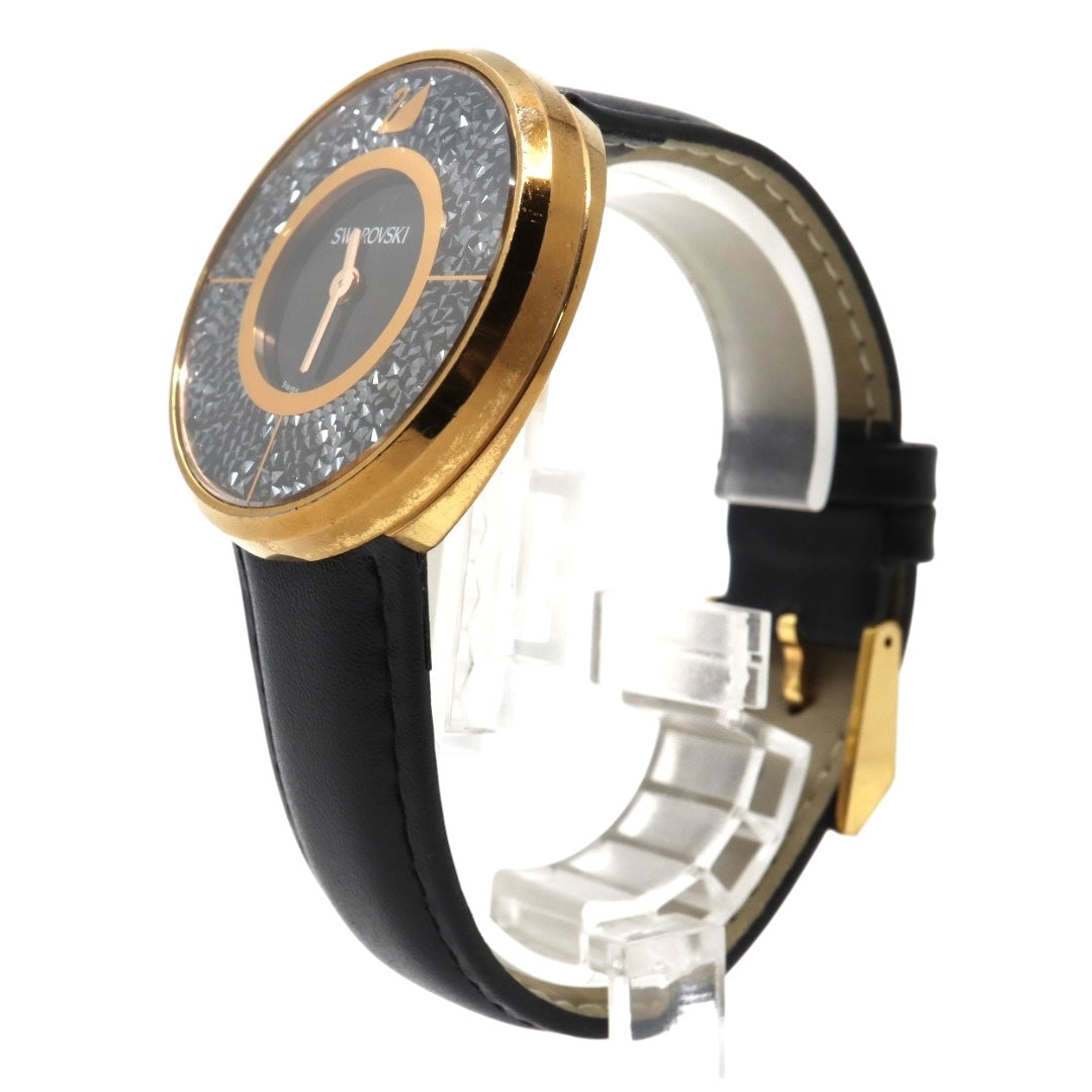 極美品 電池交換済 スワロフスキー 腕時計 5045371 レディース クオーツ ゴールド ブラックレザーベルト クリスタル アナログ ドレスウォッチ エレガント ラグジュアリー スワンロゴ スイス製 クリーニング済み G3