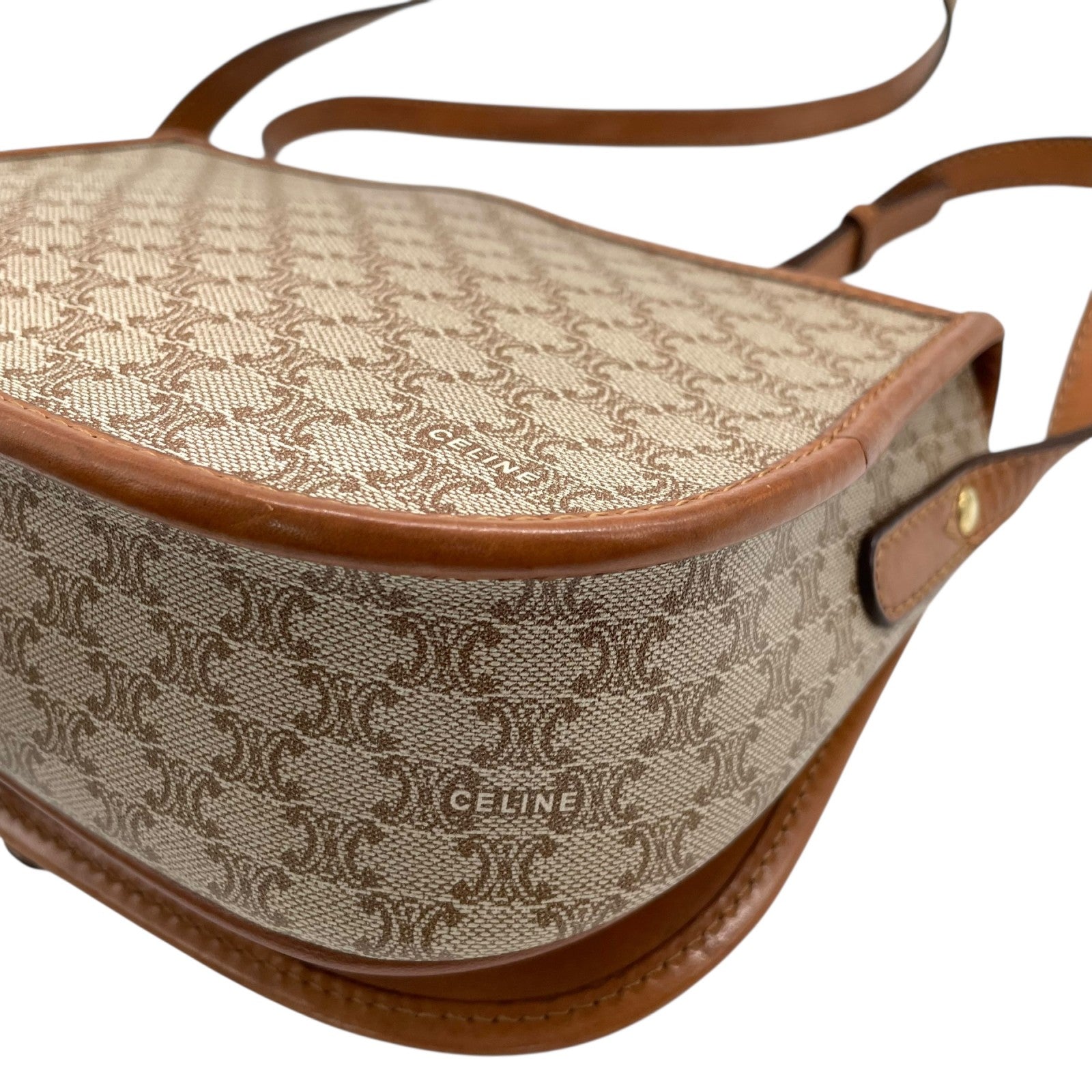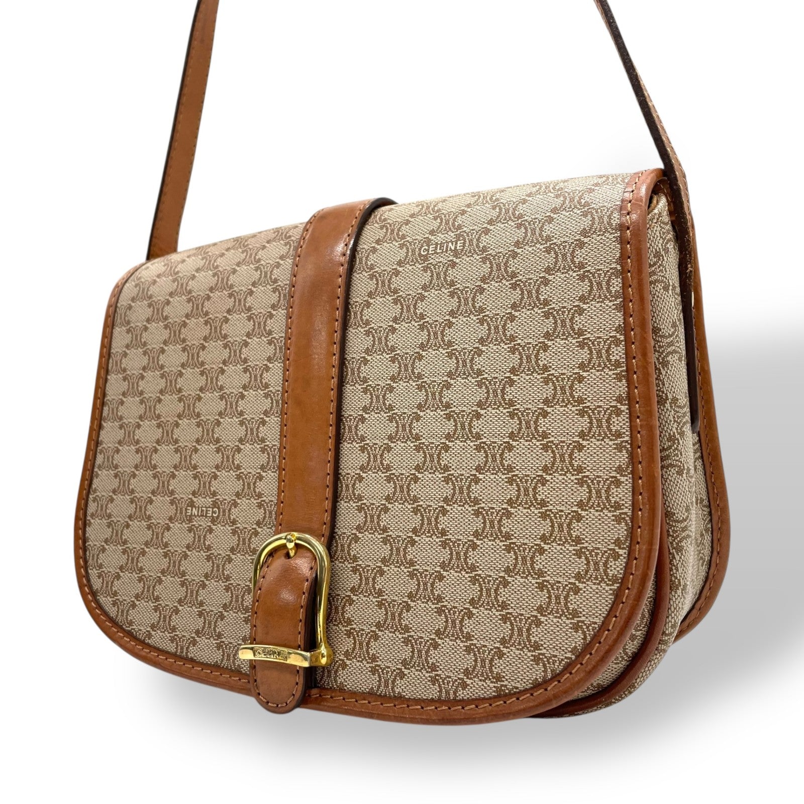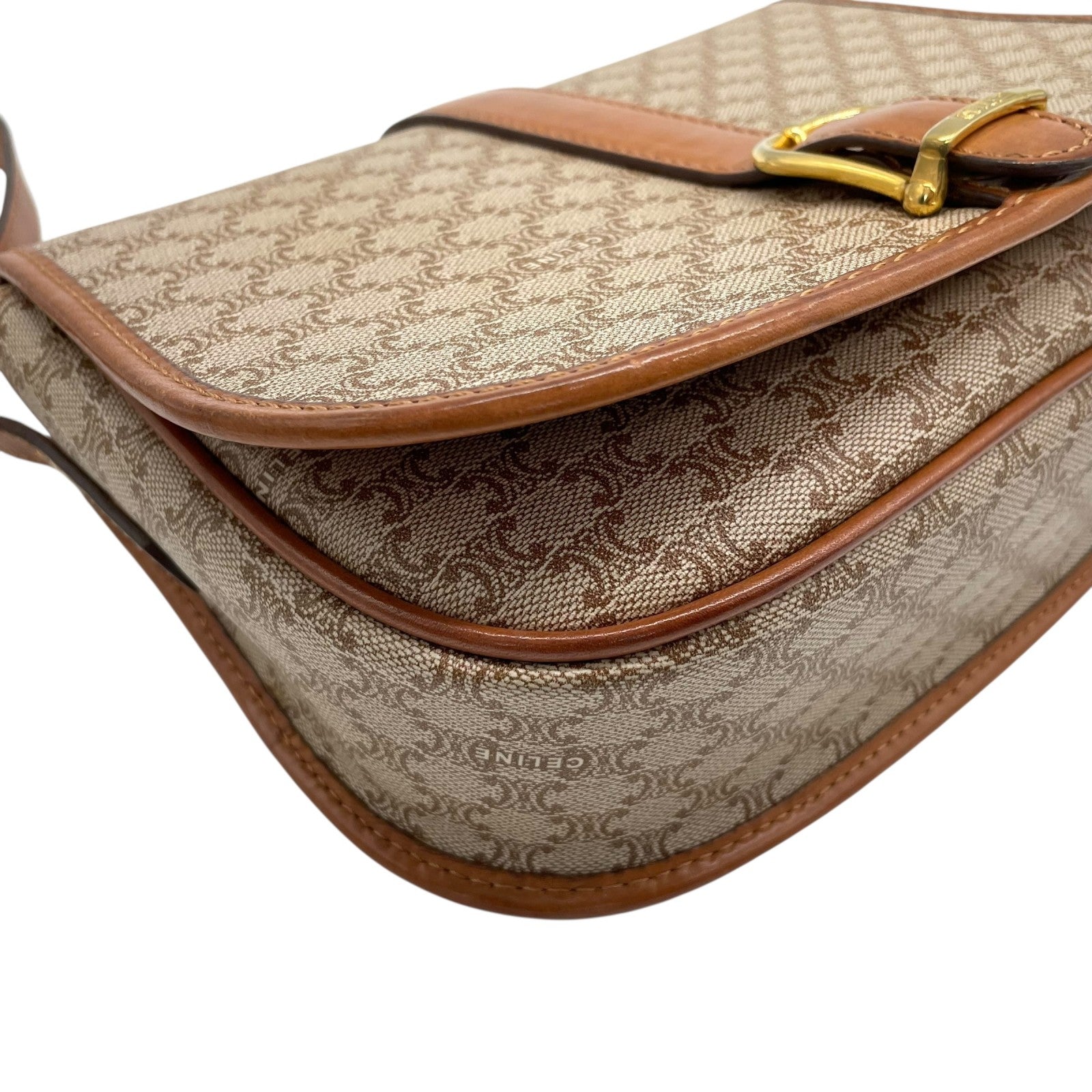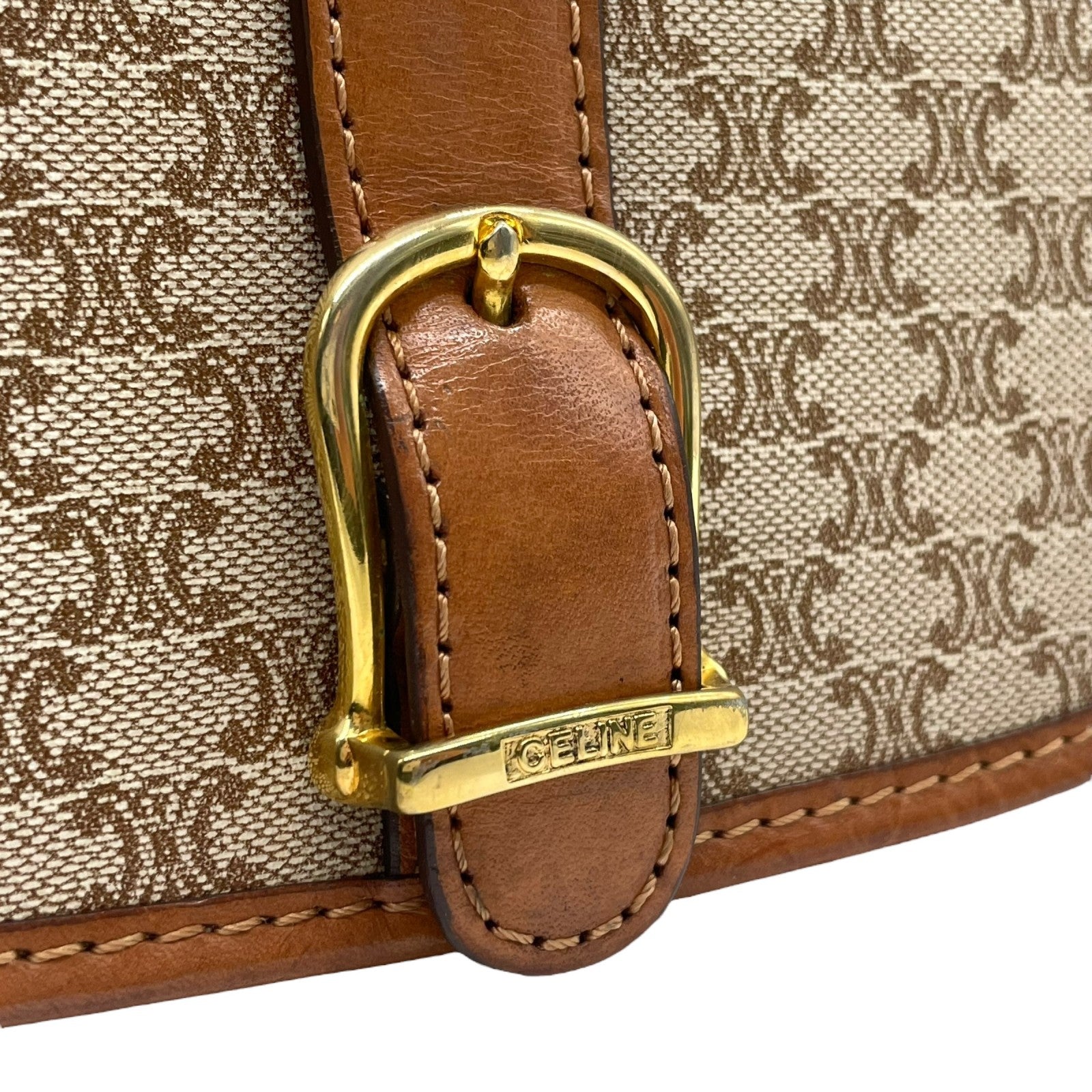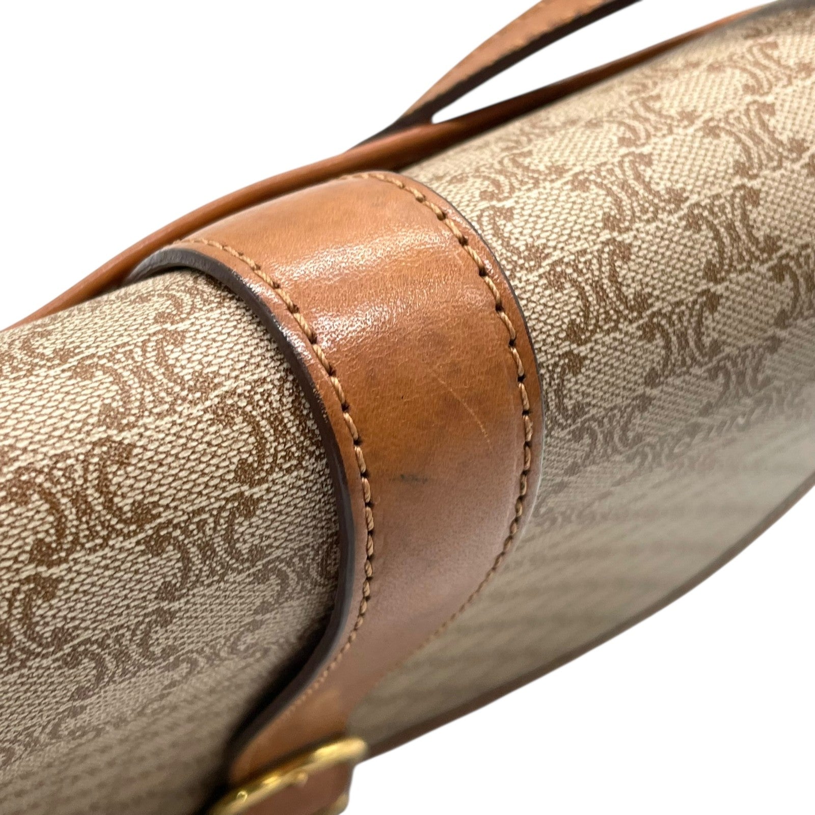 美品 CELINE オールドセリーヌ マカダム柄 トリオンフ ショルダーバッグ PVC レザー ベージュ ブラウン ゴールド金具 斜め掛け可 フラップ開閉 ヴィンテージ レディース K11