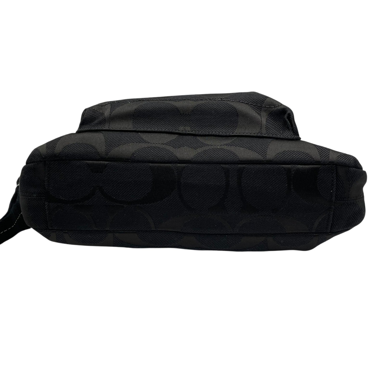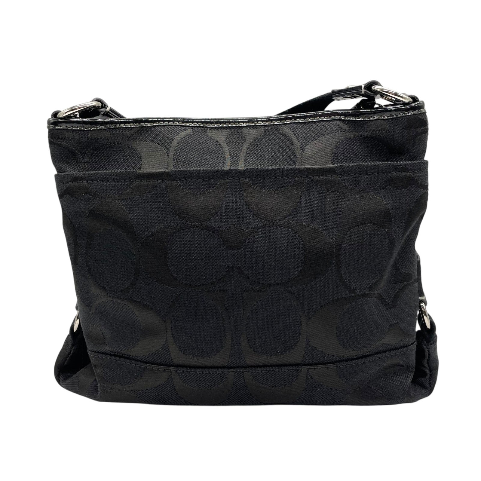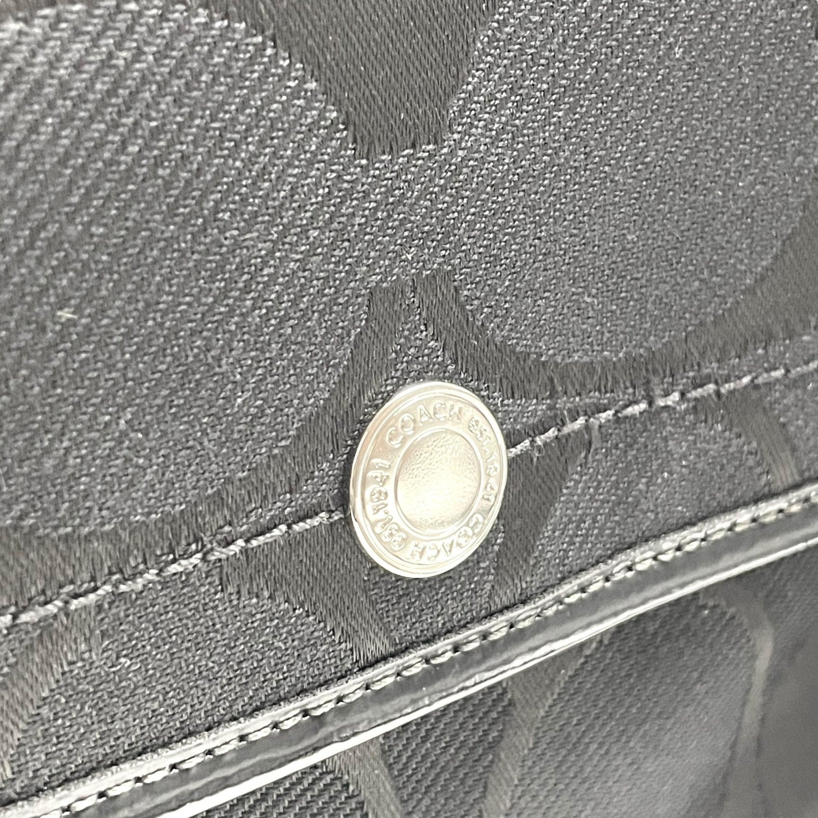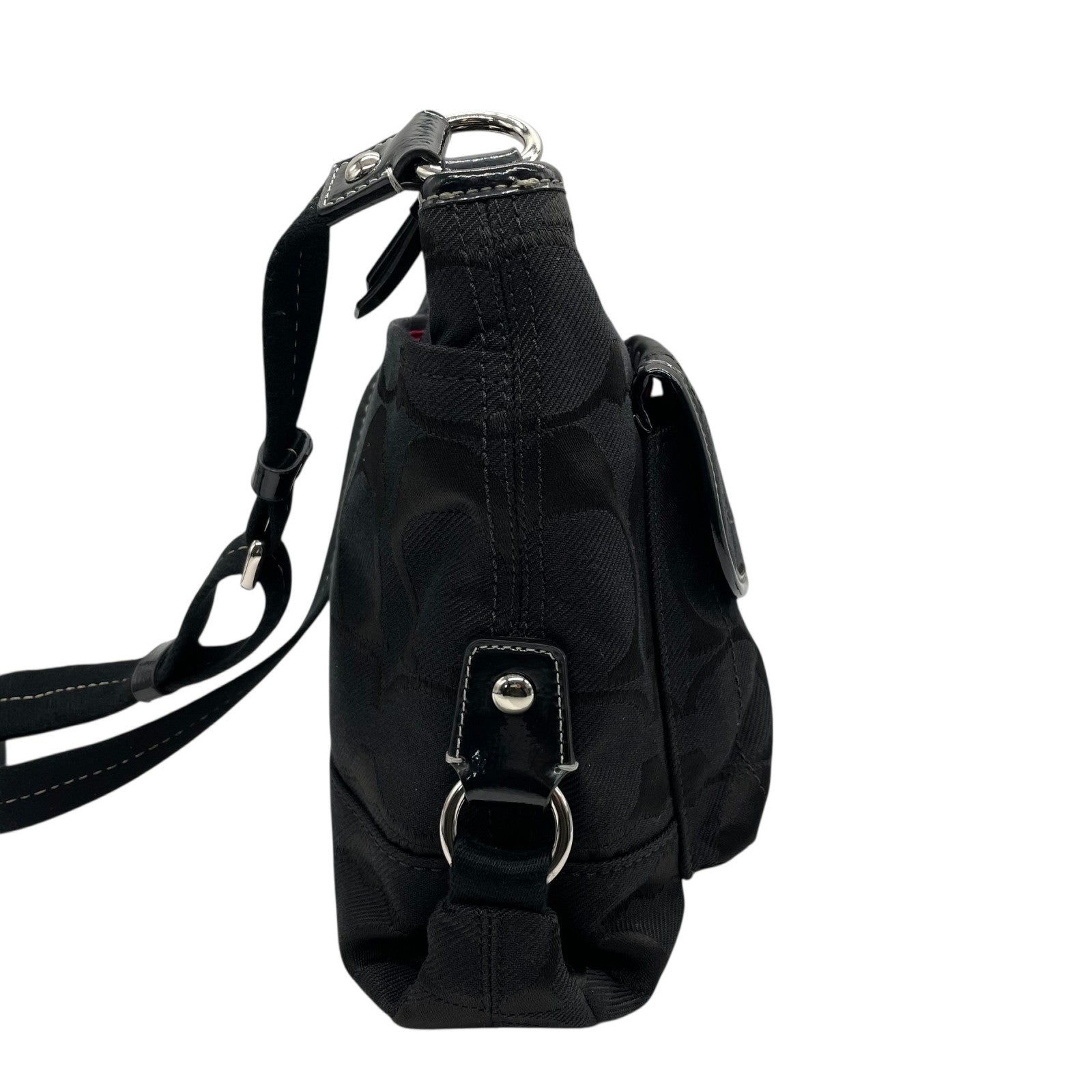 美品 COACH コーチ ショルダーバッグ 黒 ブラック シグネチャー キャンバス パテントレザー シルバー金具 F16550 フラワーチャーム付き 斜め掛け可 レディース E8