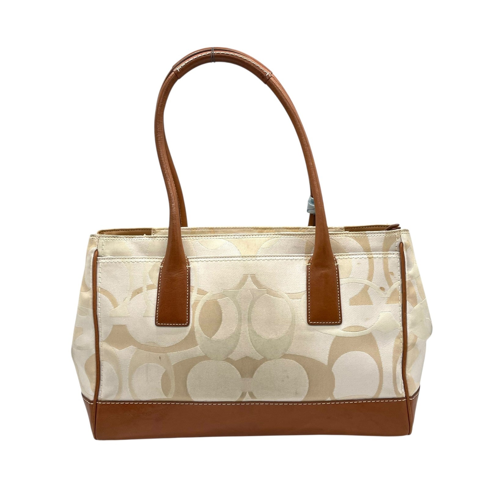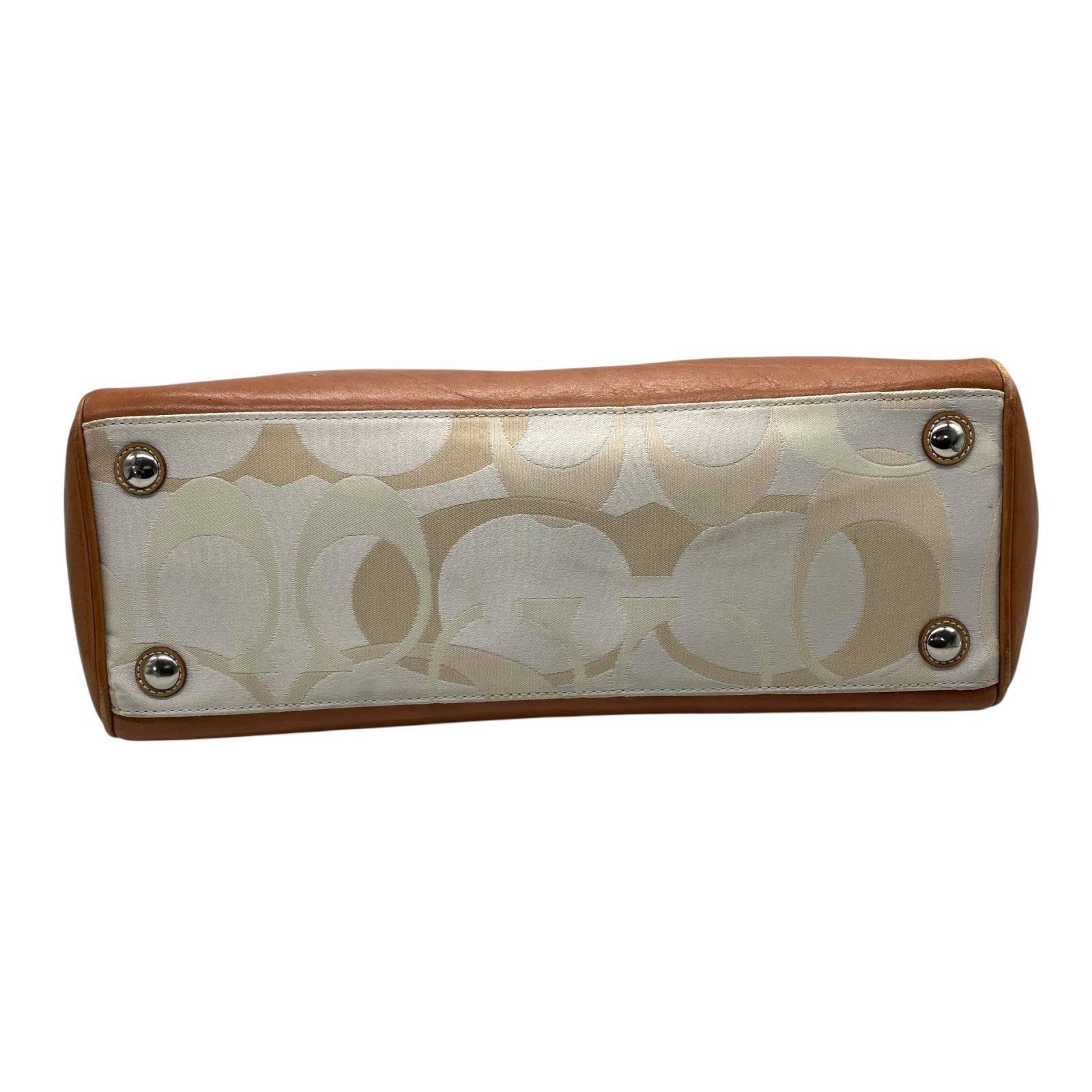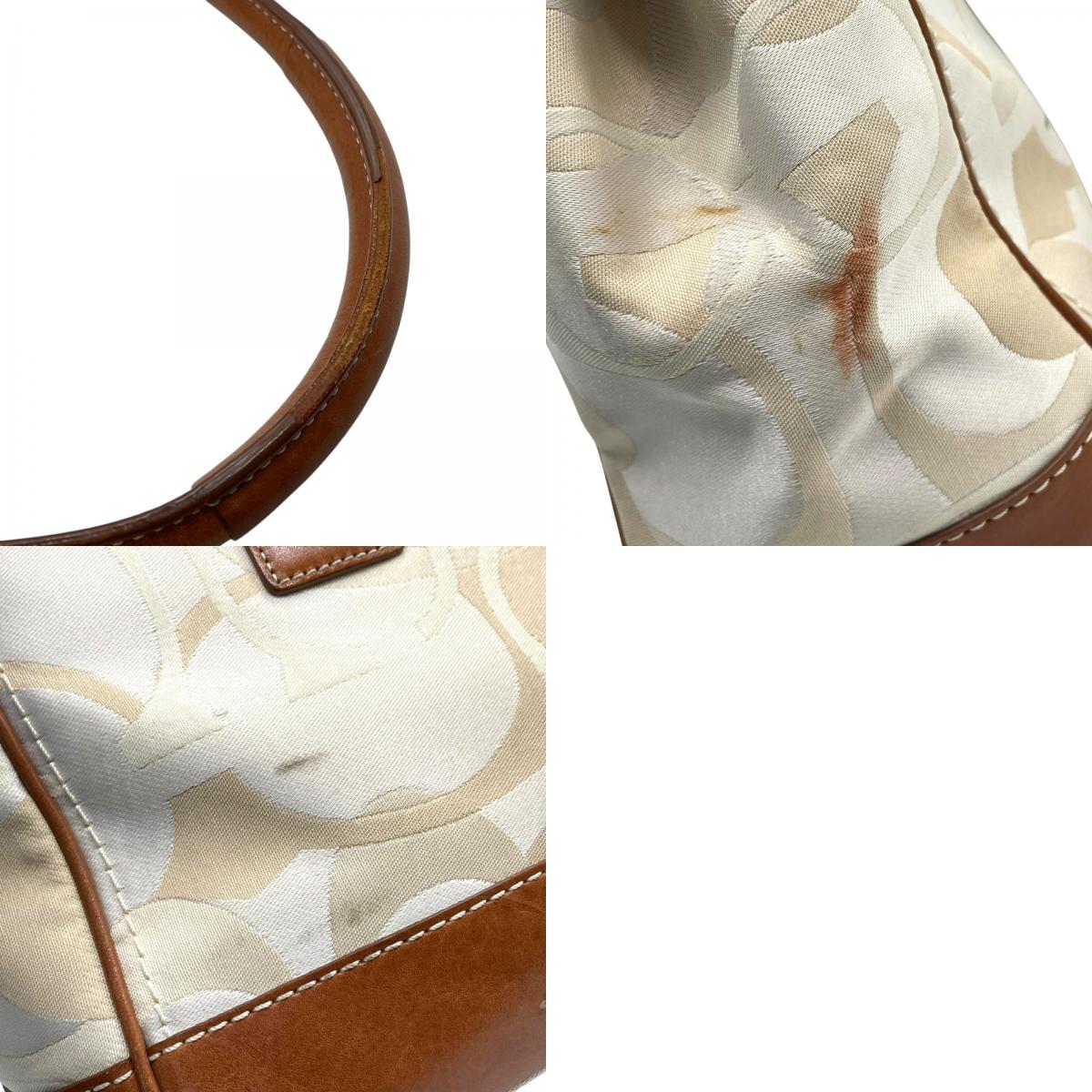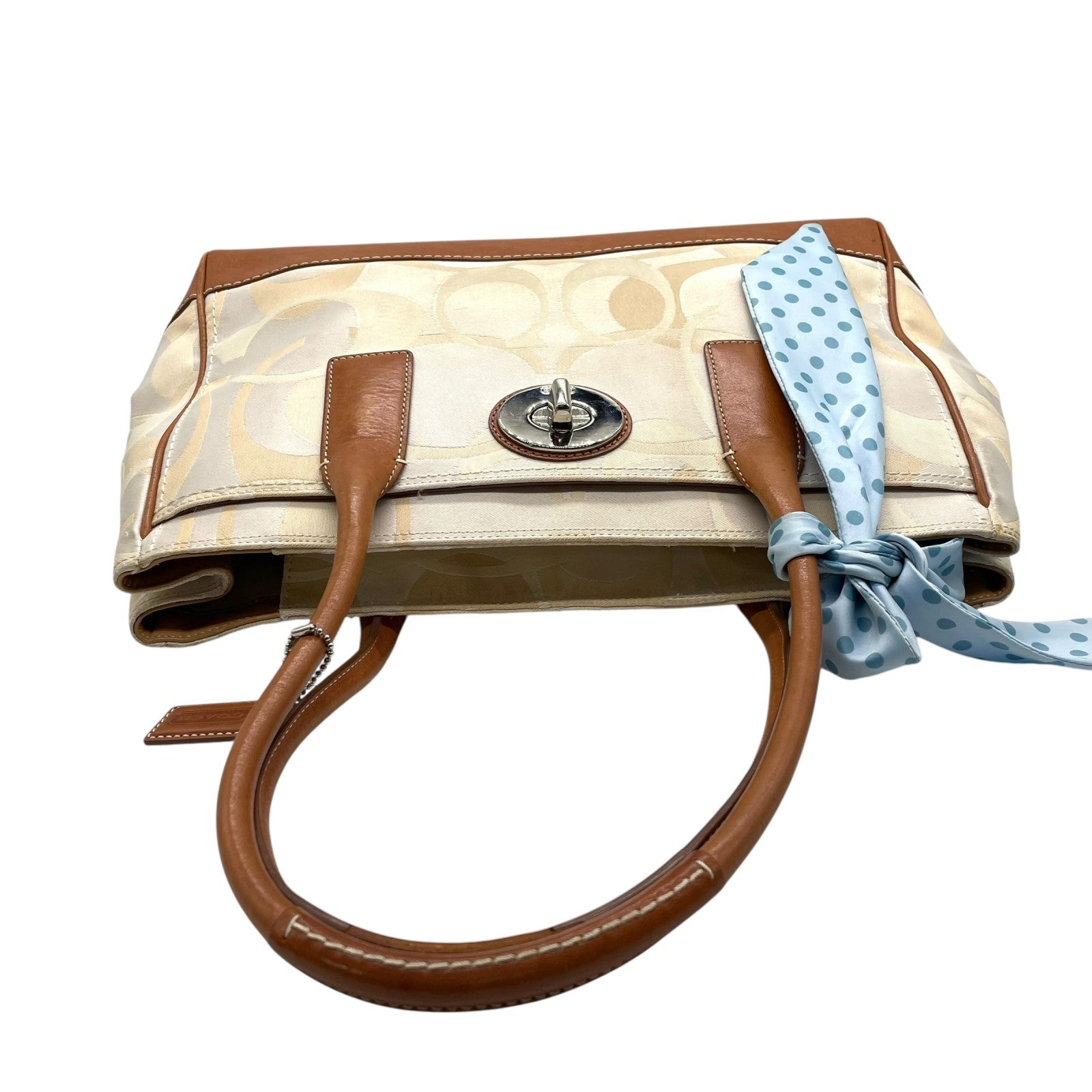 コーチ COACH シグネチャー ハンドバッグ トートバッグ 白 ホワイト 茶 ブラウン キャンバス レザー シルバー金具 ターンロック ロゴチャーム付き スカーフ付き 肩掛け可 レディース T1