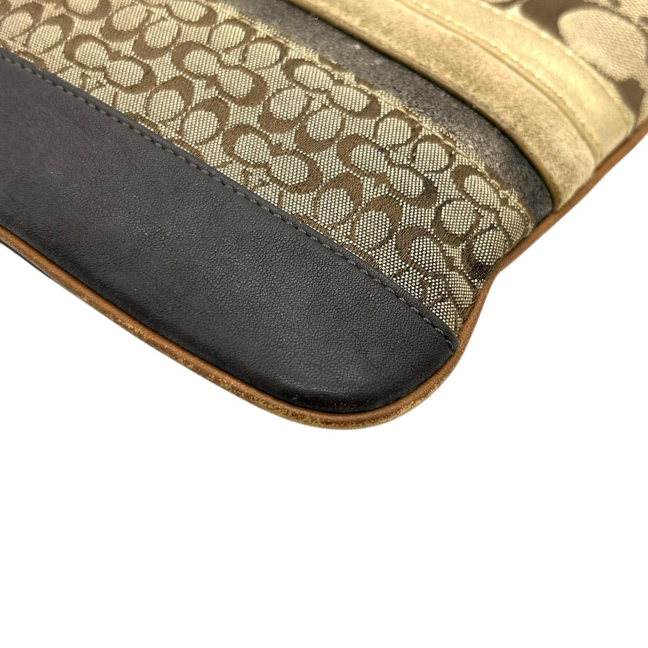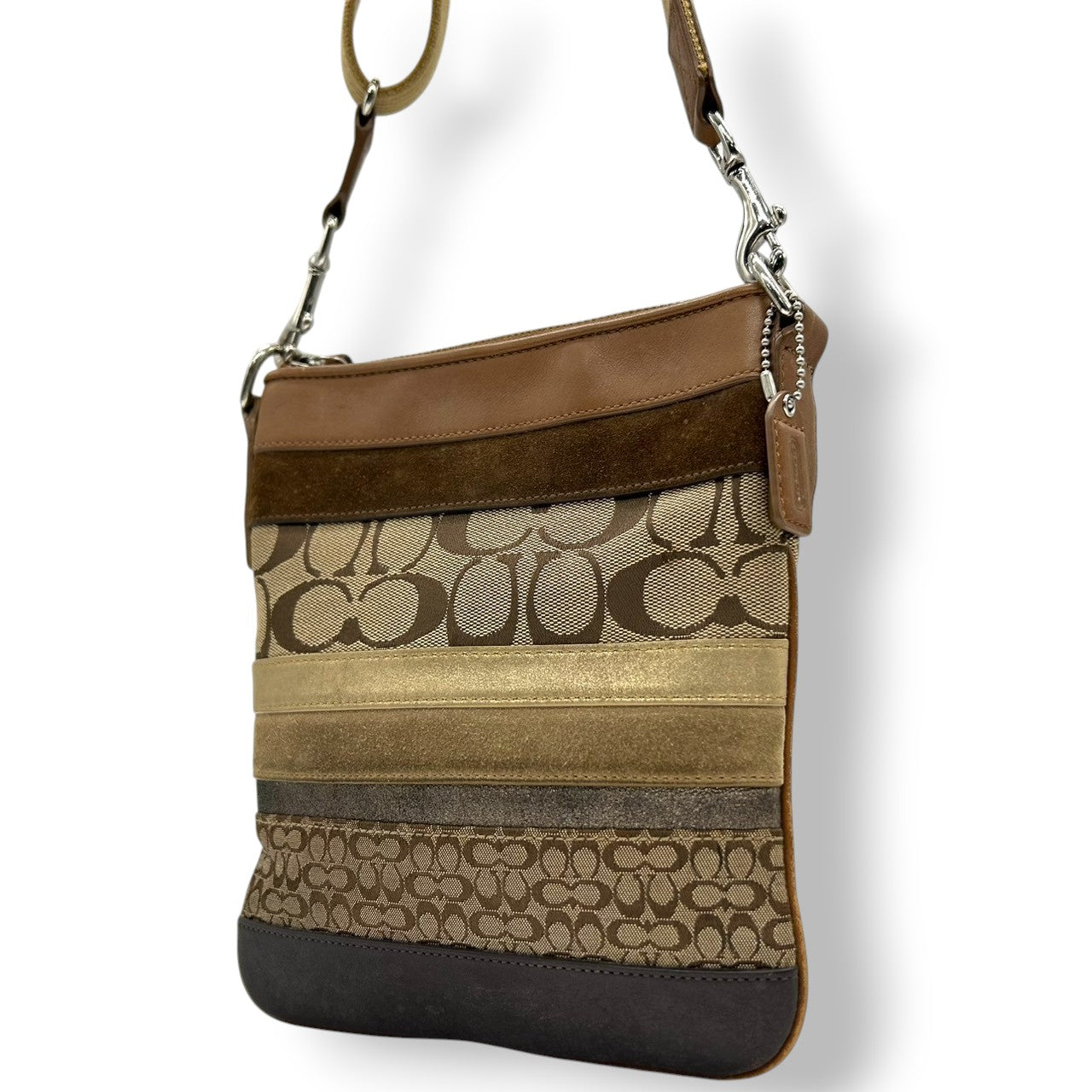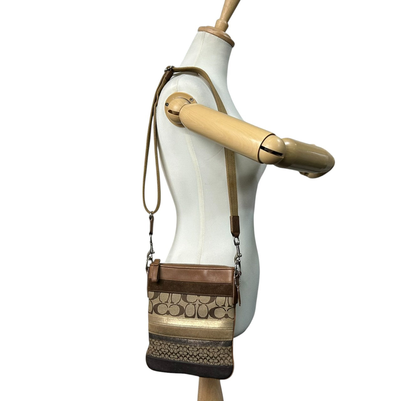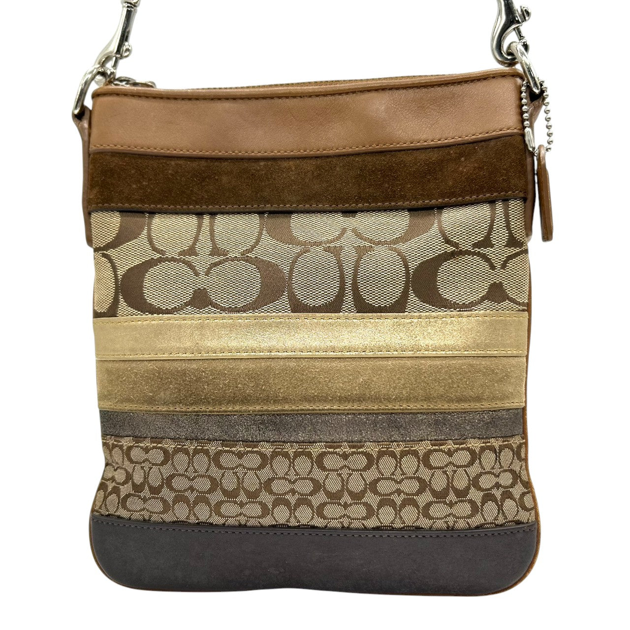 コーチ ショルダーバッグ シグネチャー ストライプ キャンバス レザー スエード ブラウン 斜め掛け可 ポシェット サコッシュ コンパクト 軽量 ミニショルダー レディース カジュアル チャーム付き スイングパック クリーニング済み s4