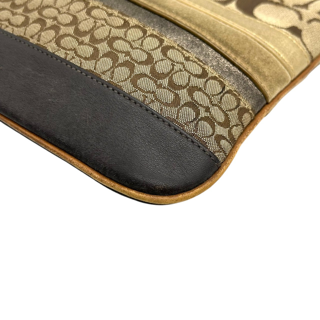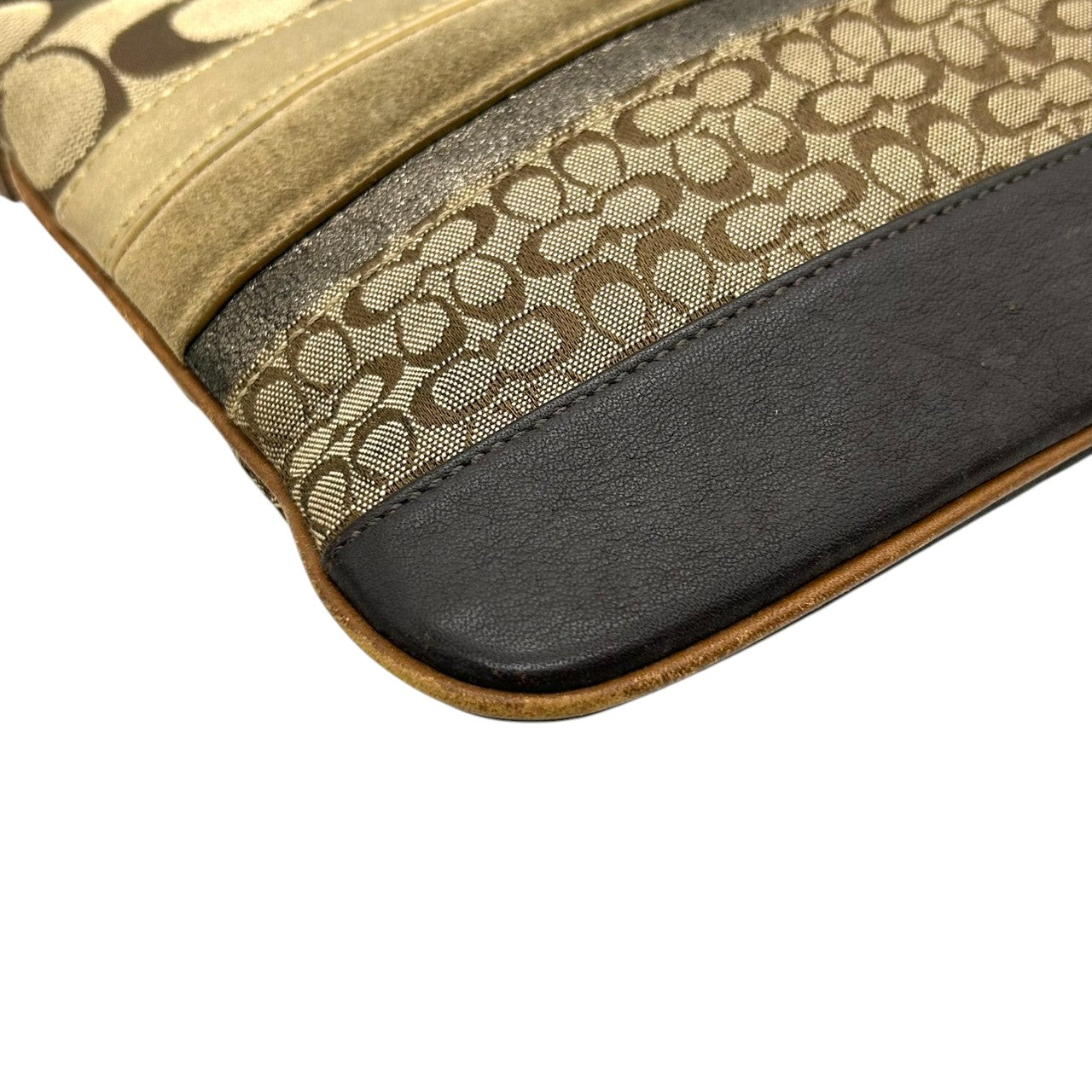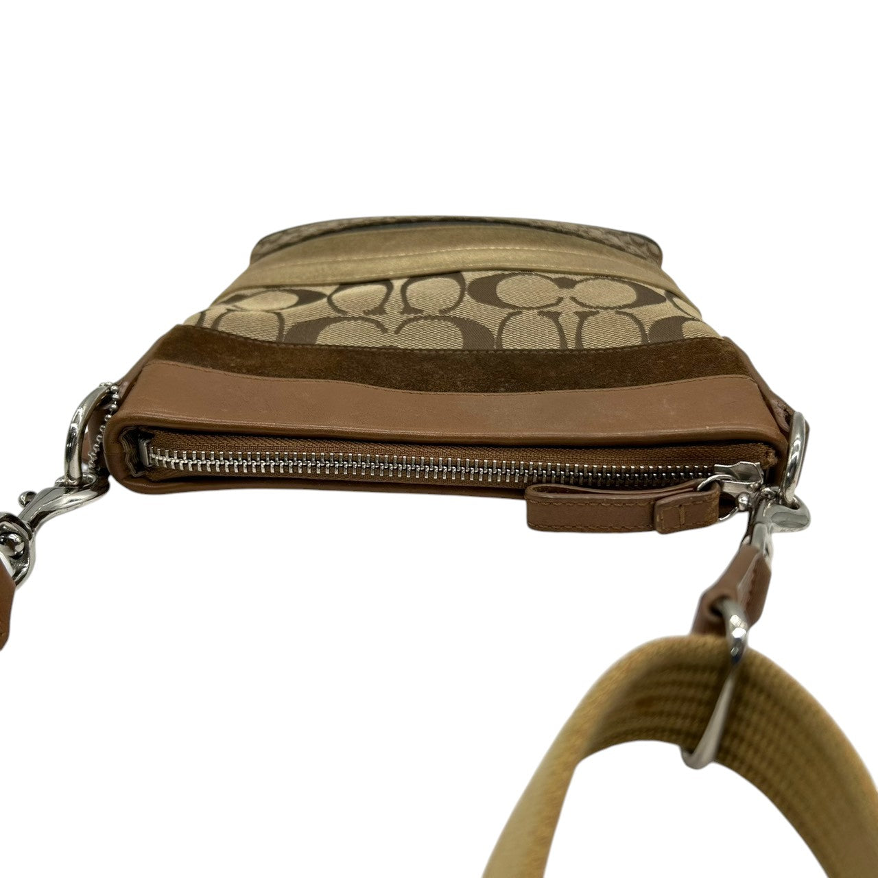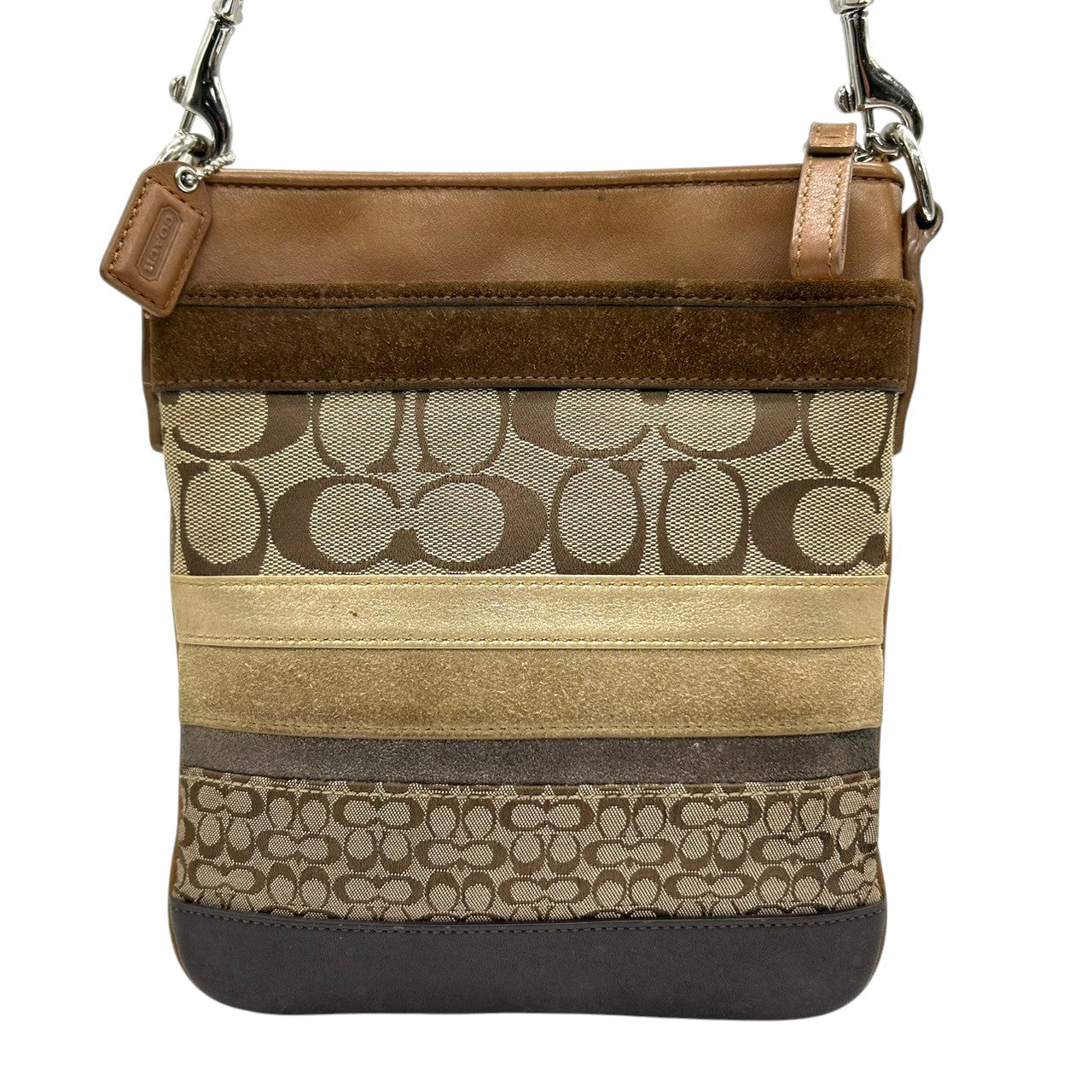コーチ ショルダーバッグ シグネチャー ストライプ キャンバス レザー スエード ブラウン 斜め掛け可 ポシェット サコッシュ コンパクト 軽量 ミニショルダー レディース カジュアル チャーム付き スイングパック クリーニング済み s4