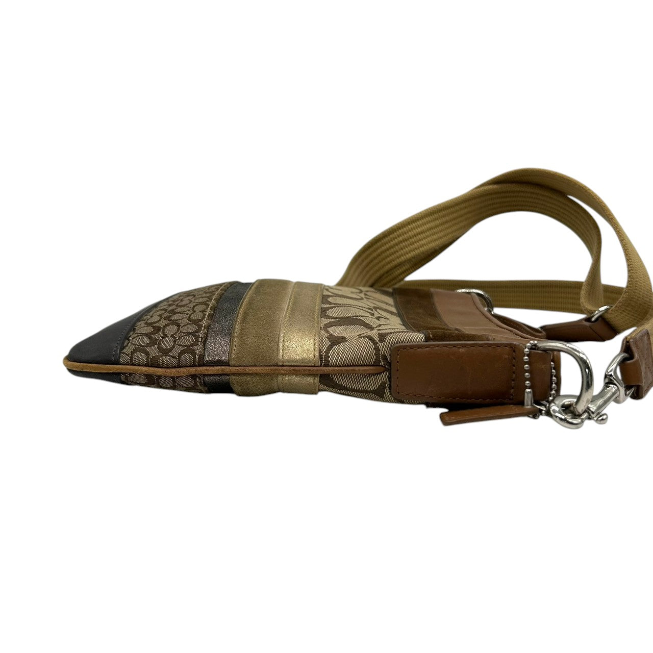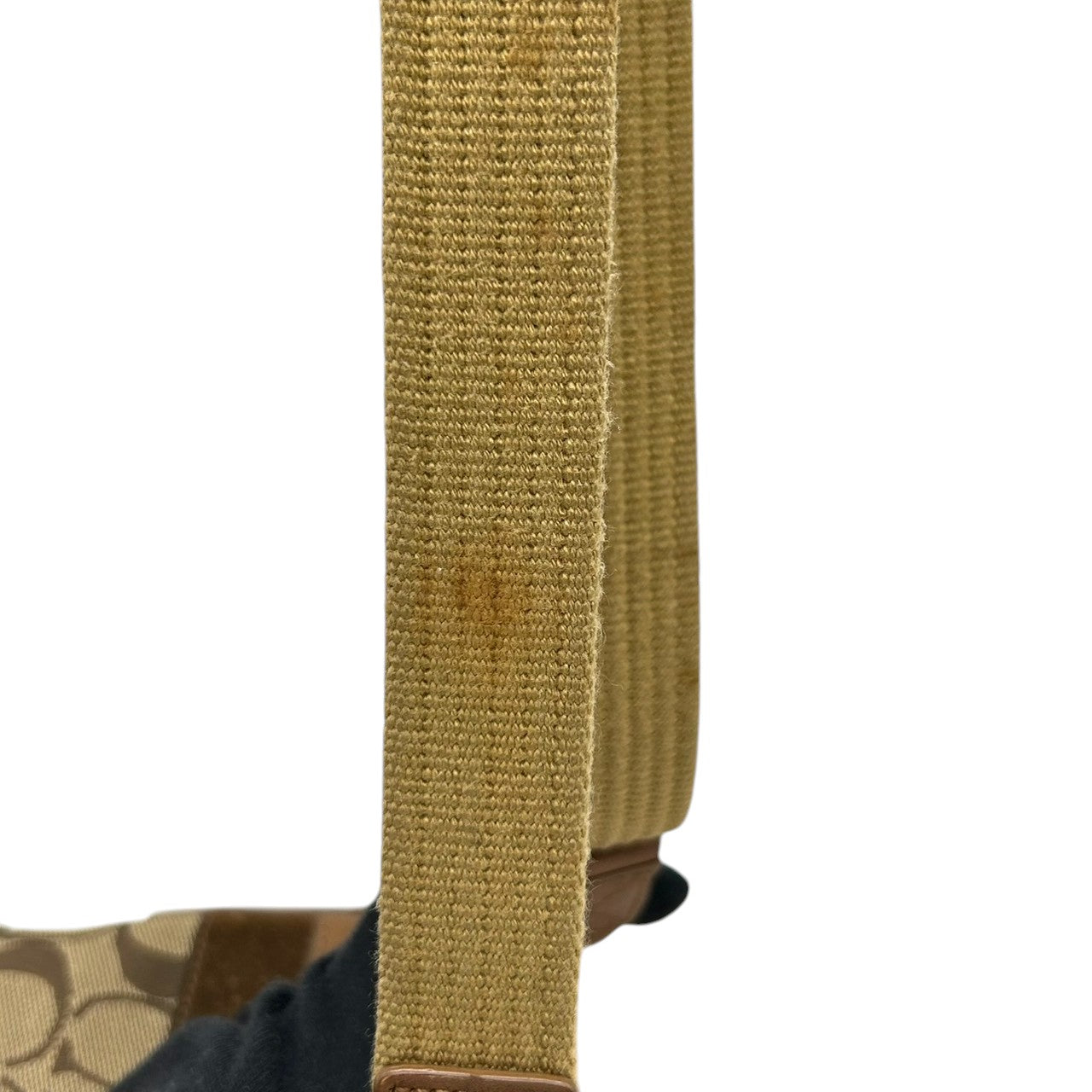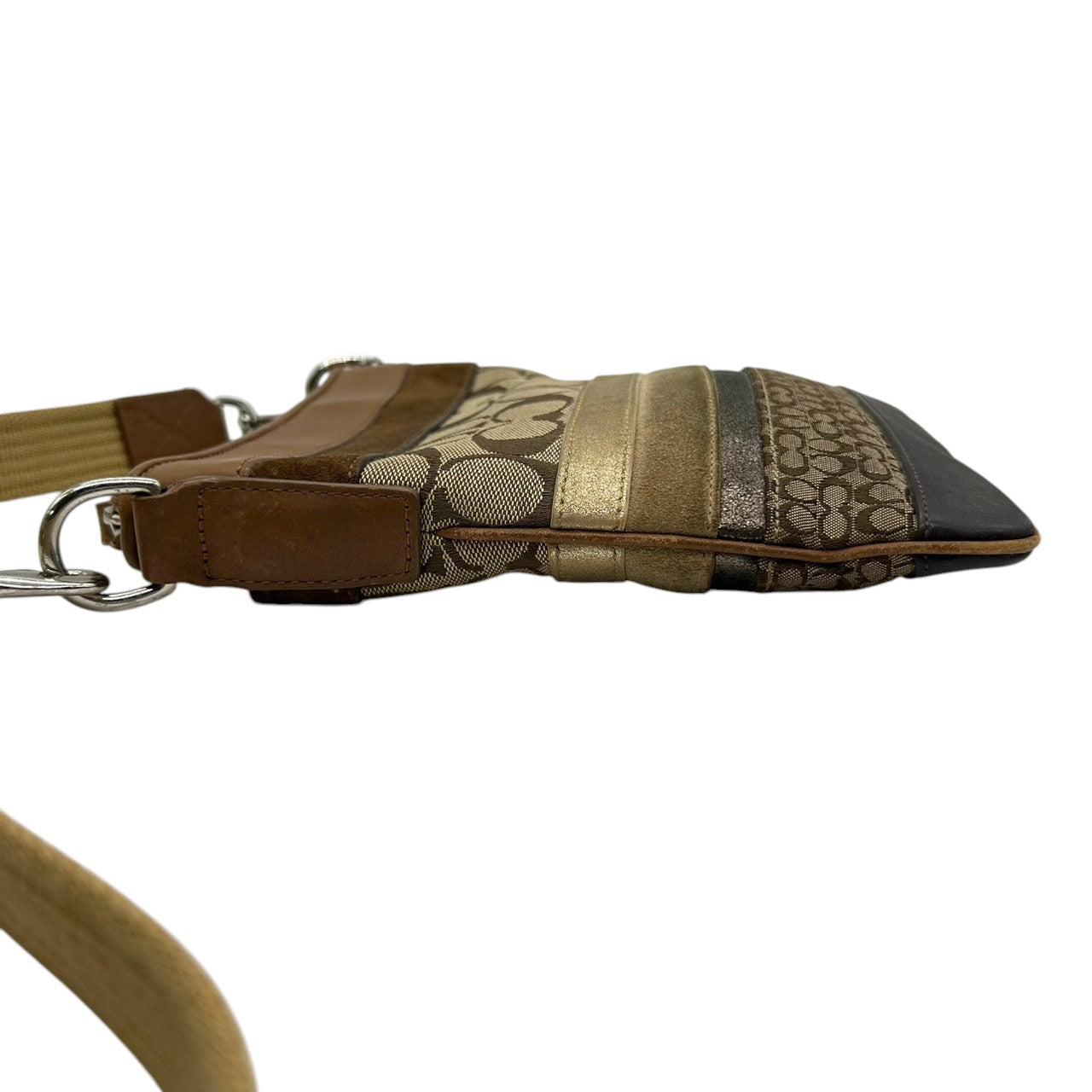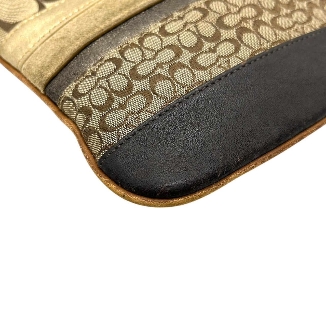 コーチ ショルダーバッグ シグネチャー ストライプ キャンバス レザー スエード ブラウン 斜め掛け可 ポシェット サコッシュ コンパクト 軽量 ミニショルダー レディース カジュアル チャーム付き スイングパック クリーニング済み s4