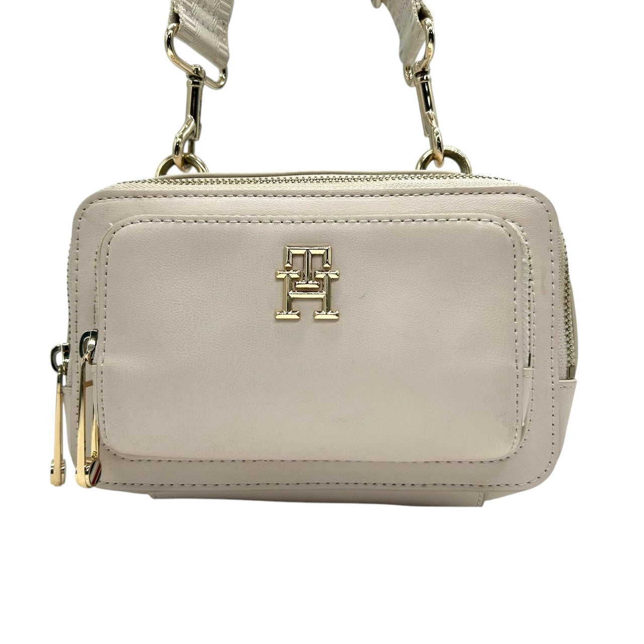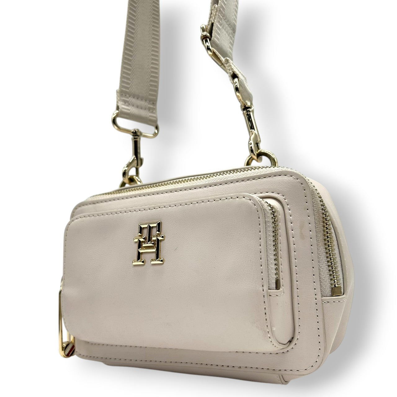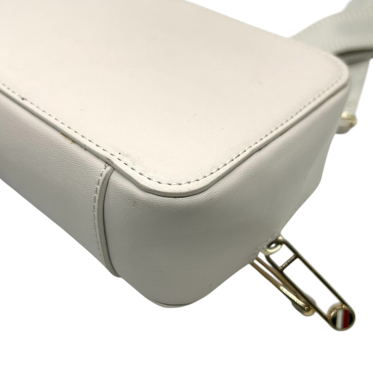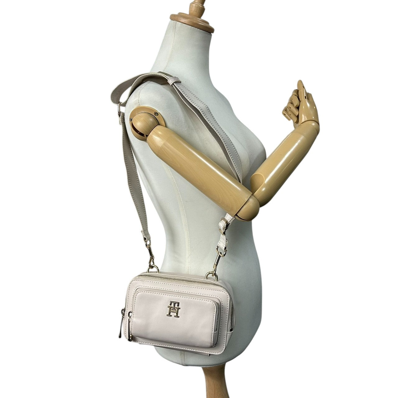 【美品】トミーヒルフィガー ショルダーバッグ レザー 本革 ホワイト THロゴ カメラバッグ ポシェット 斜め掛け可 レディース コンパクト ミニショルダー ゴールド金具 カジュアル スポーティー デイリーユース ワイドストラップ クリーニング済み s21