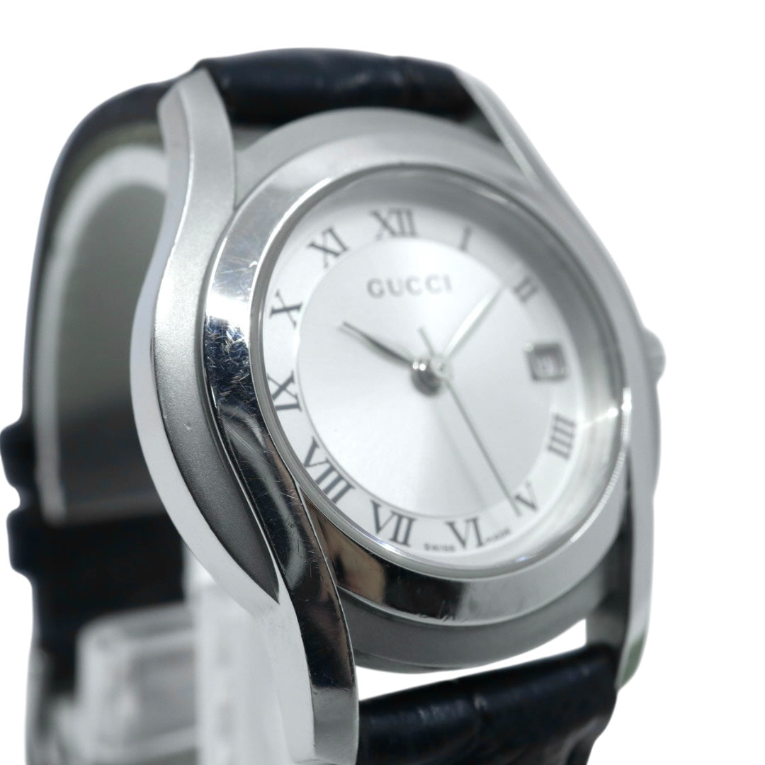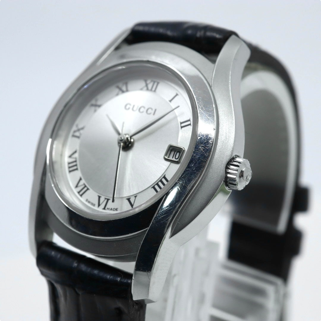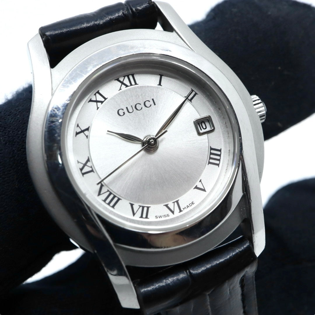 極美品 電池交換済 新品ベルト グッチ GUCCI 5500L 腕時計 レディースウォッチ クォーツ シルバー文字盤 ローマンインデックス デイト表示 ステンレススチール レザーベルト クラシック エレガント ドレスウォッチ 稼働品 G3