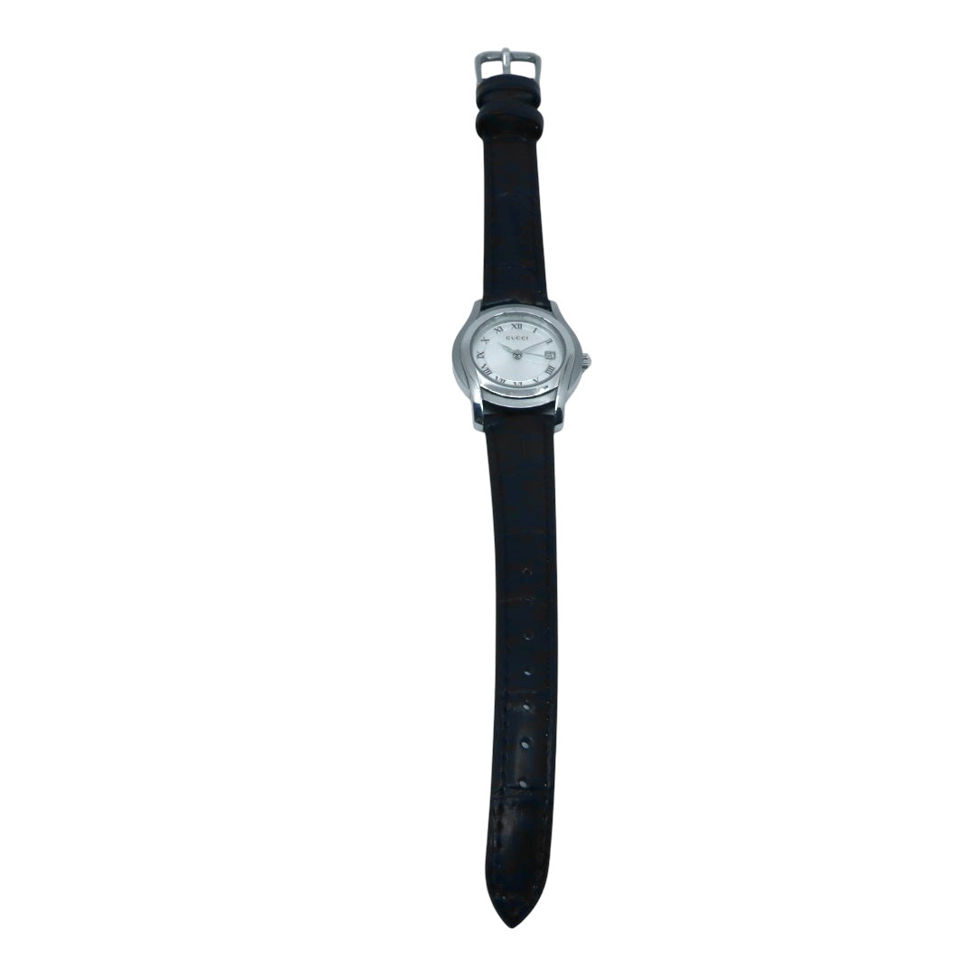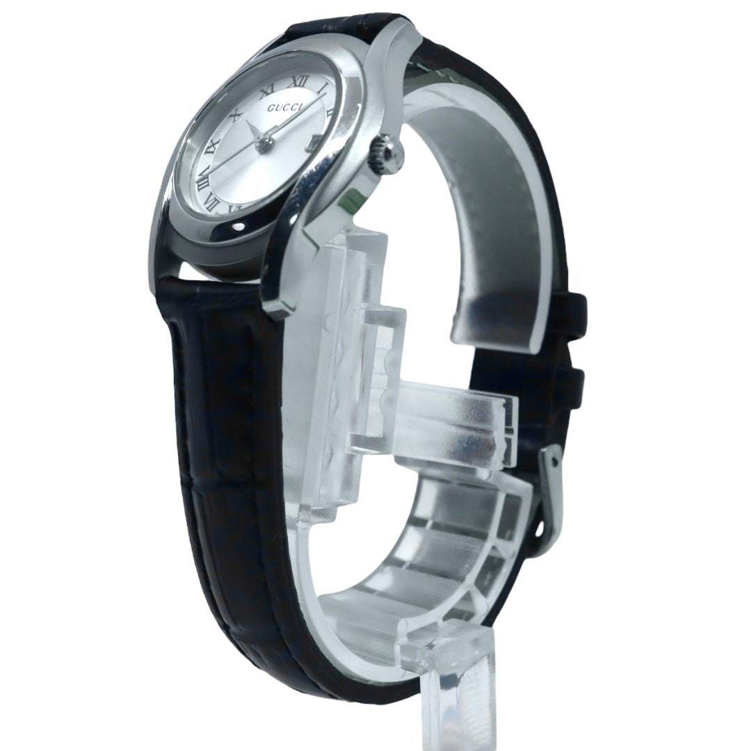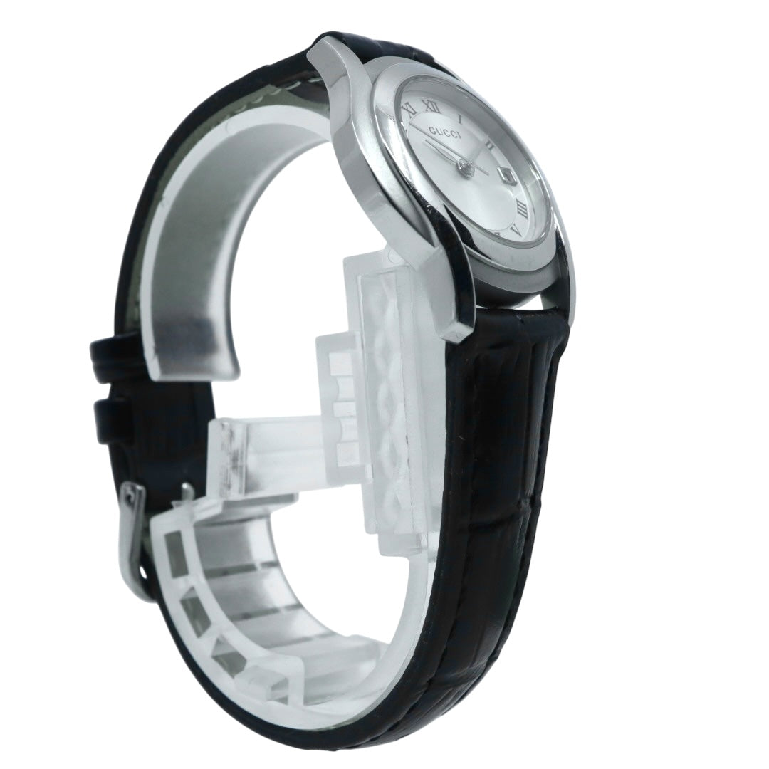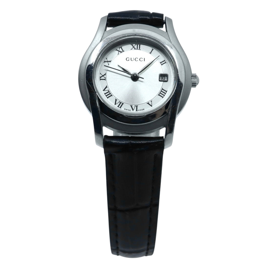 極美品 電池交換済 新品ベルト グッチ GUCCI 5500L 腕時計 レディースウォッチ クォーツ シルバー文字盤 ローマンインデックス デイト表示 ステンレススチール レザーベルト クラシック エレガント ドレスウォッチ 稼働品 G3