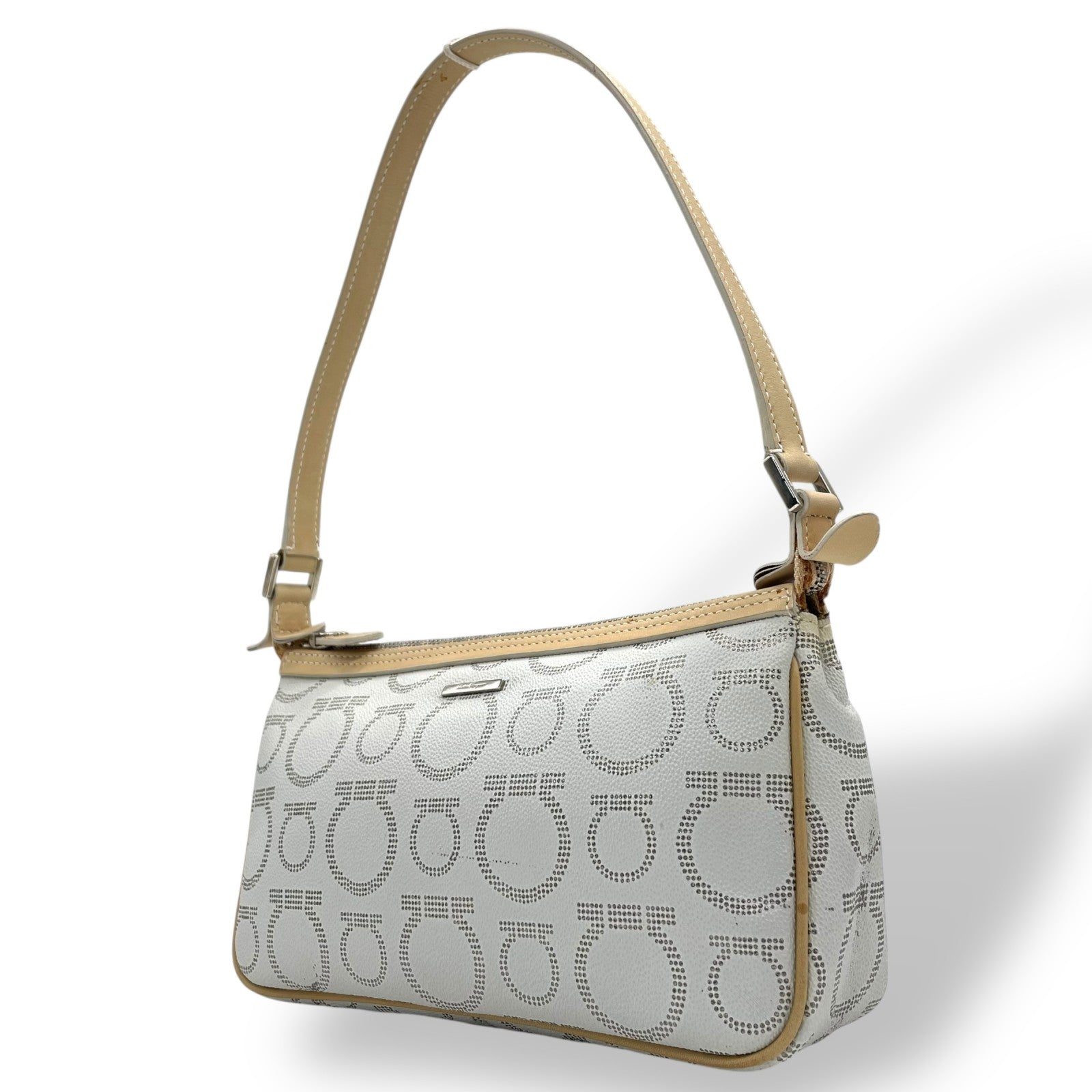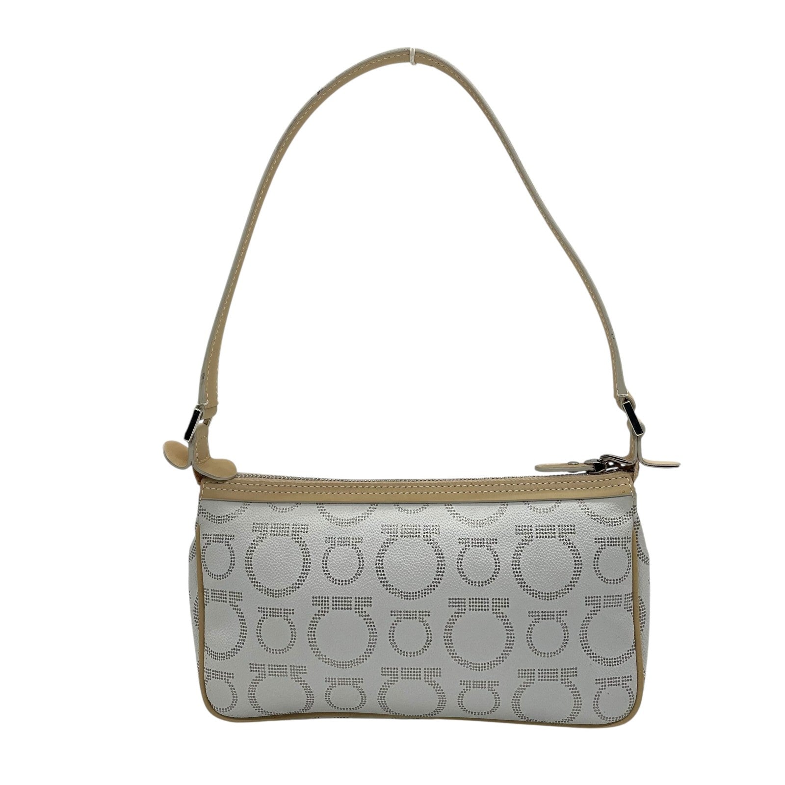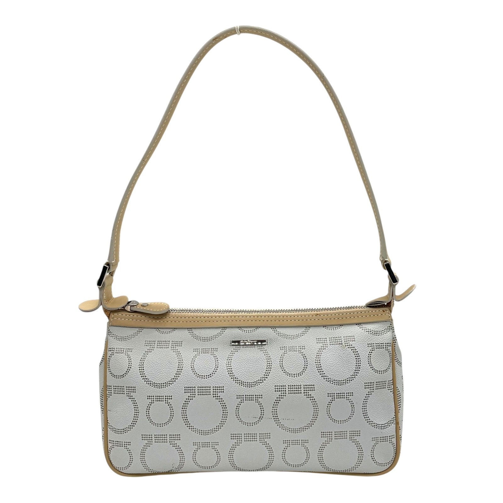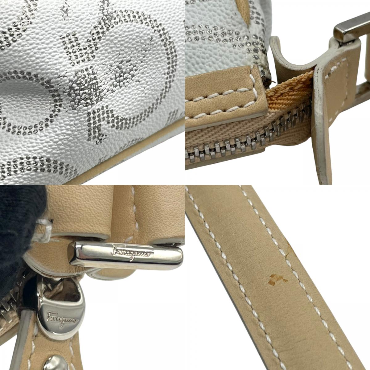 フェラガモ Salvatore Ferragamo ハンドバッグ アクセサリーポーチ ミニバッグ ガンチーニ AU-21 7497 グレー ベージュ レザー シルバー金具 ロゴ ワンショルダー 肩掛け可 レディース C5