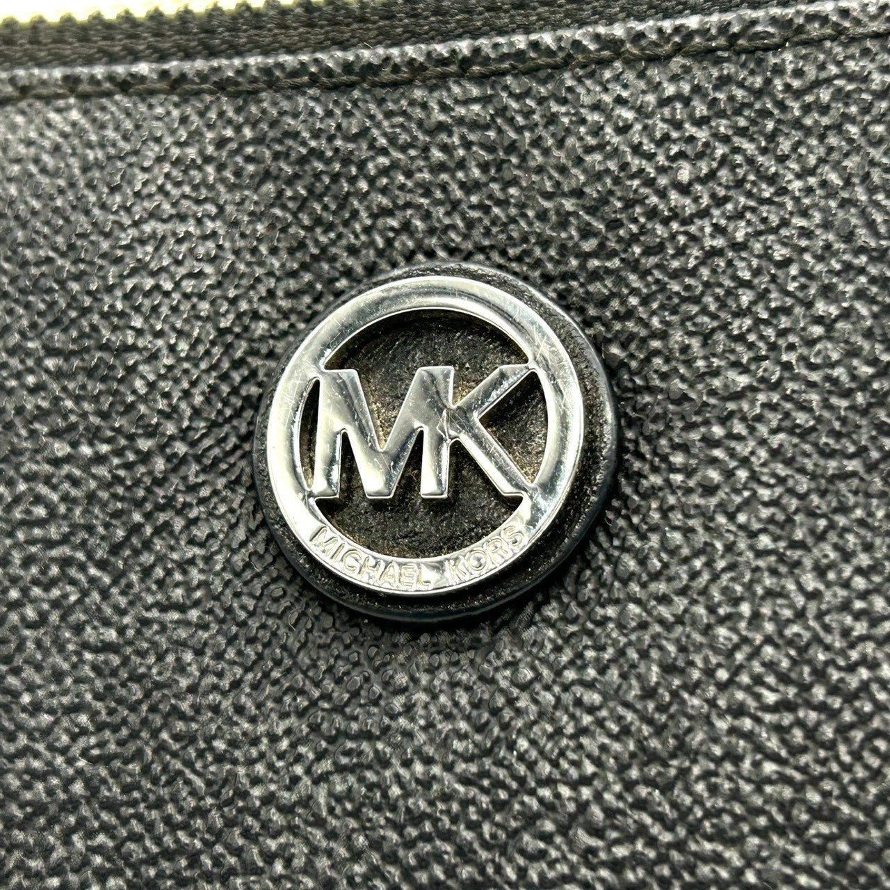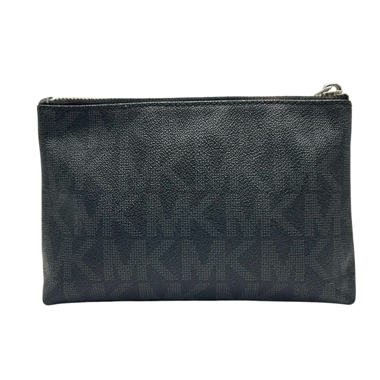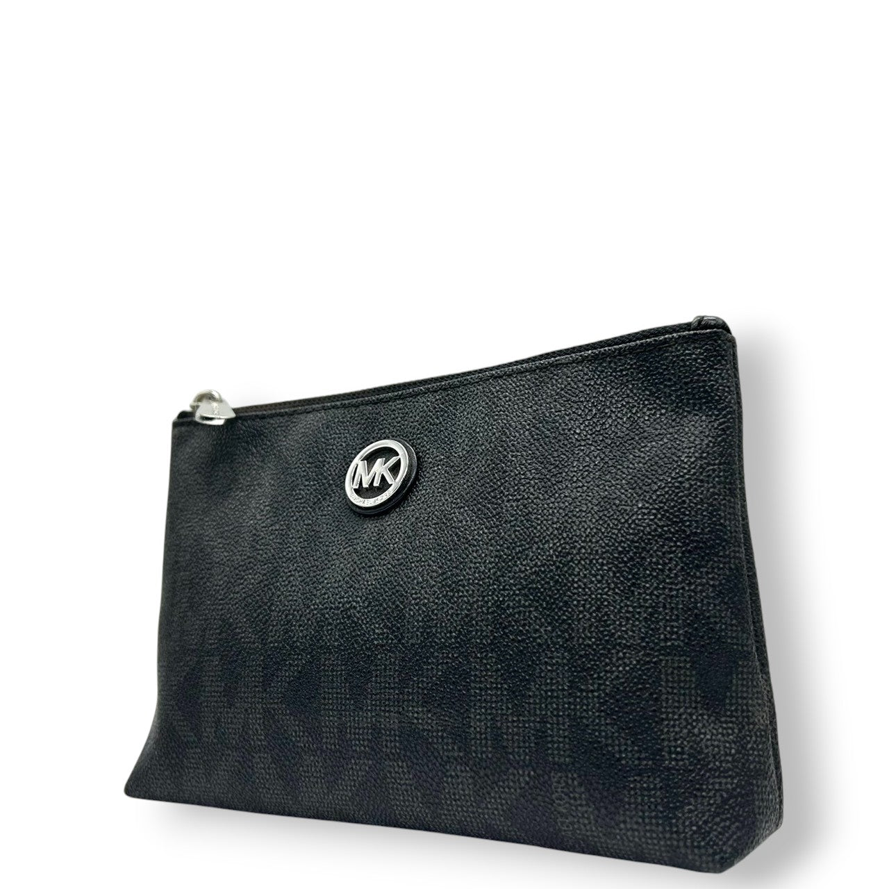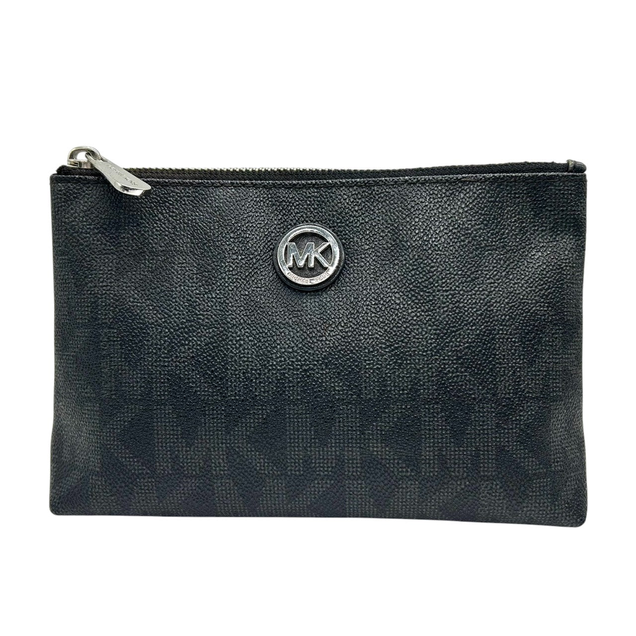 【未使用級/美品】マイケルコース シグネチャー ポーチ ブラック PVC MKロゴプレート 化粧ポーチ コスメポーチ 小物入れ トラベルポーチ 総柄 レディース MICHAEL KORS エレガント スタイリッシュ トップジップ w2