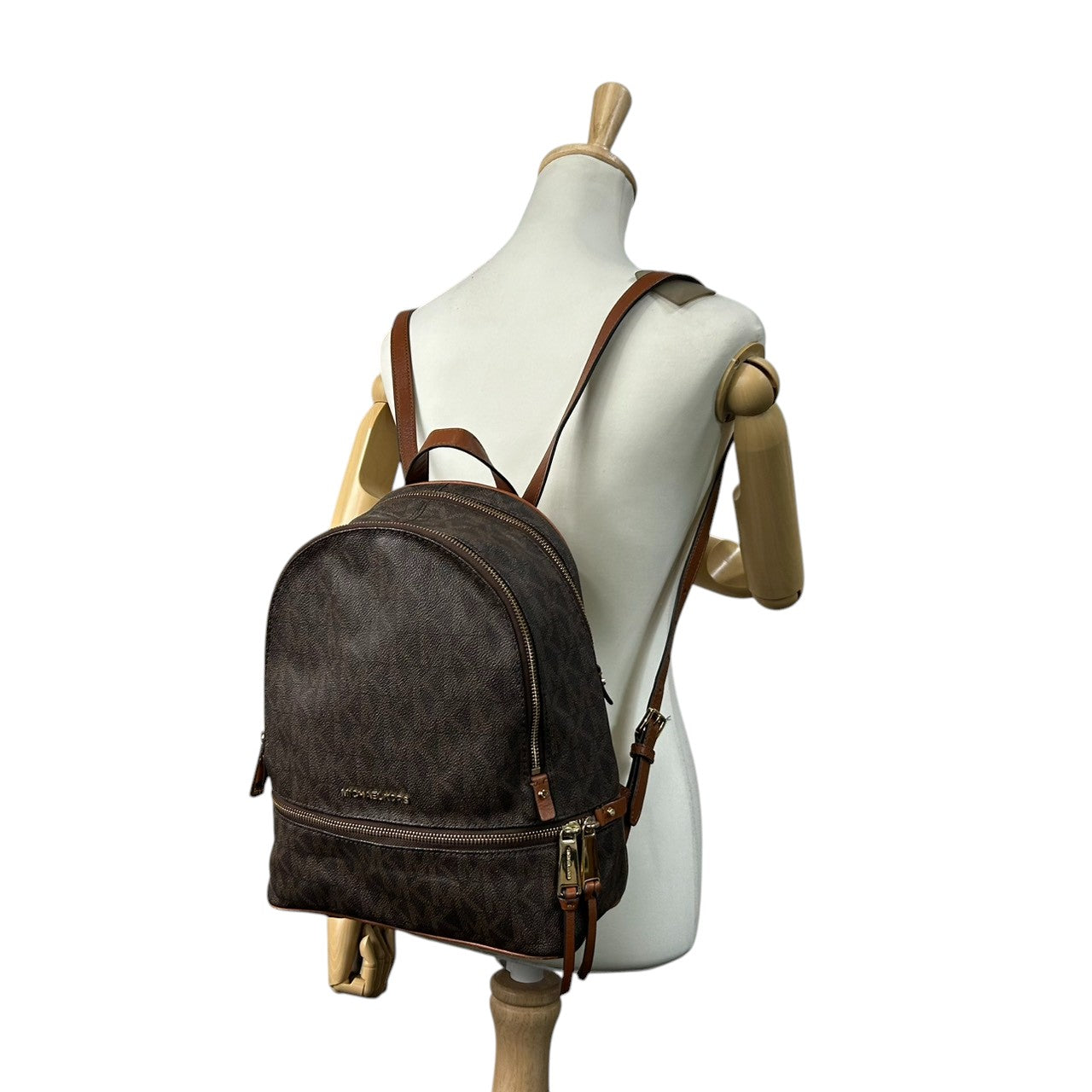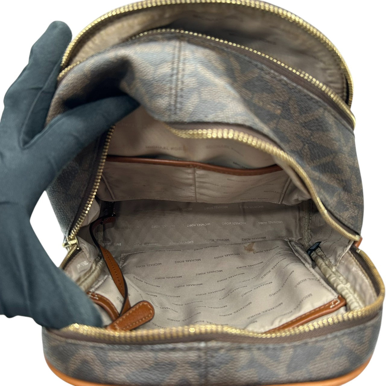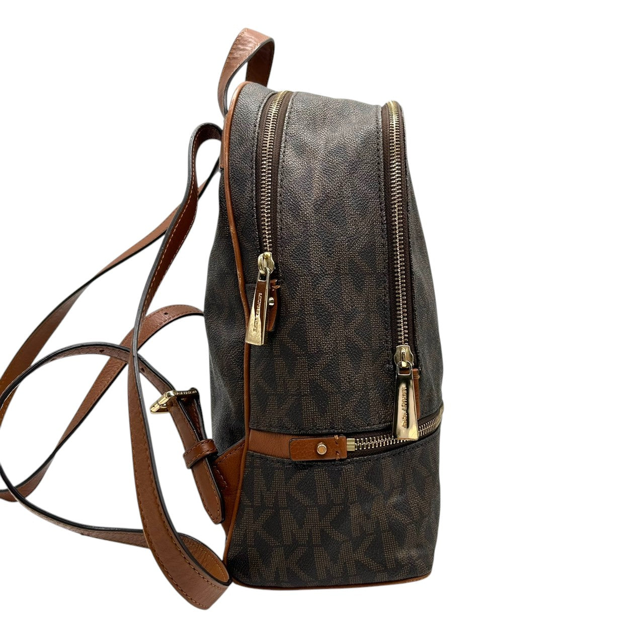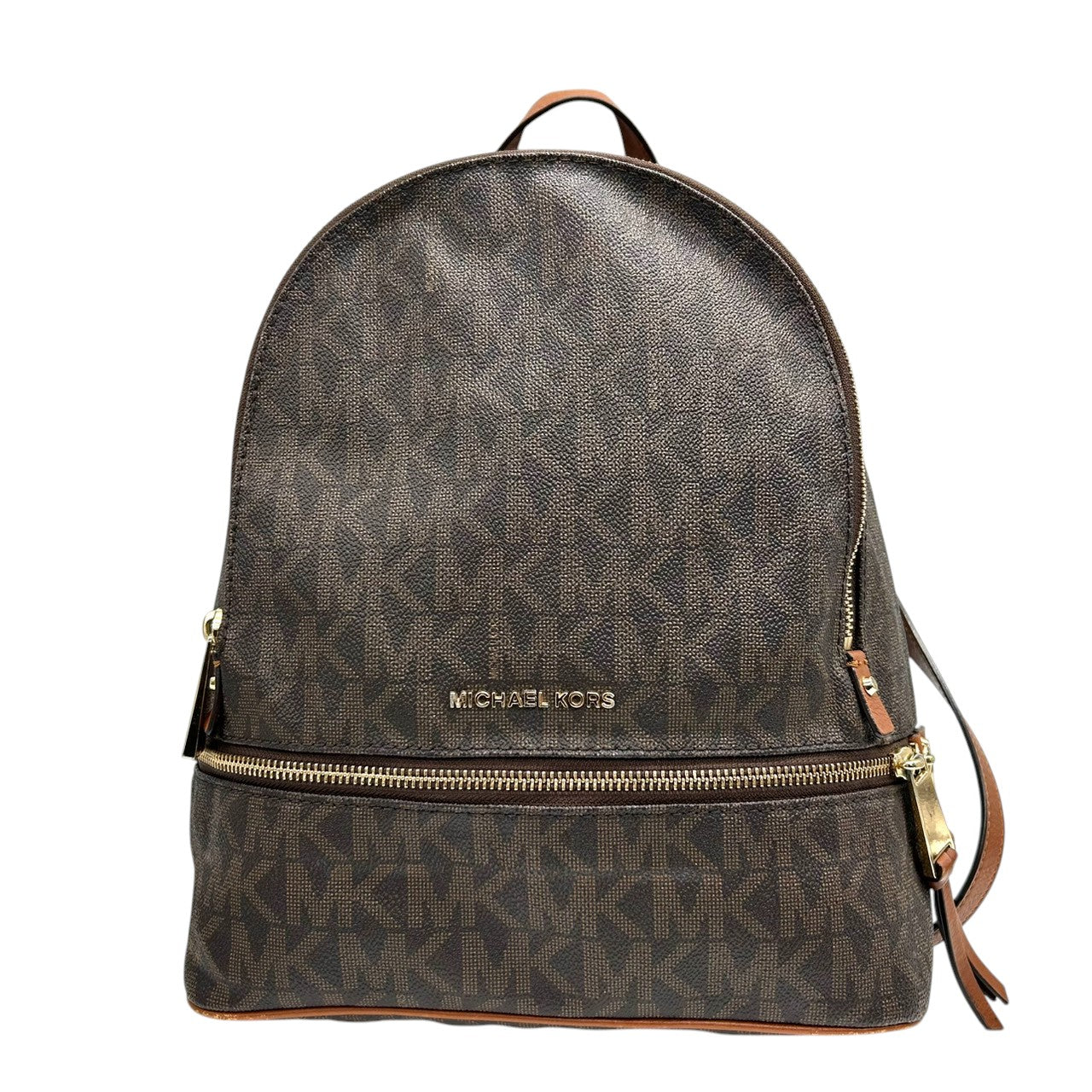 【美品】マイケルコース リアジップ ミディアム バックパック シグネチャー MK柄 リュックサック PVC レザー ブラウン レディース MICHAEL KORS RHEA ZIP 通勤 通学 コンパクトデザイン 人気モデル E10