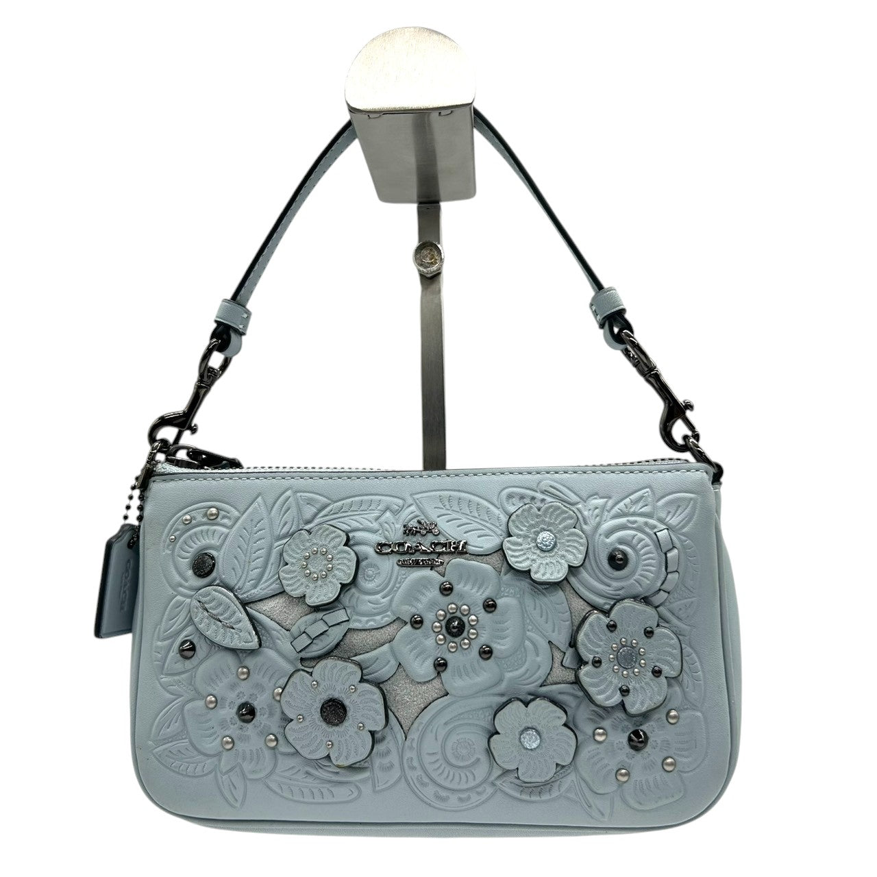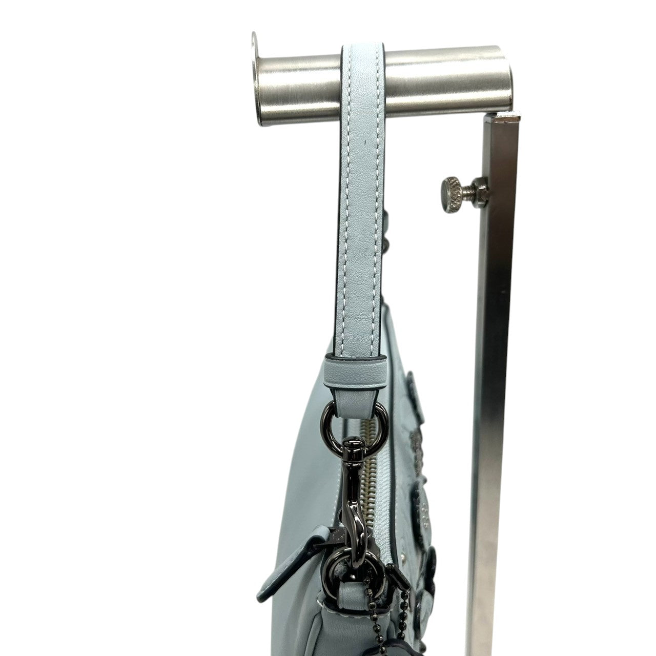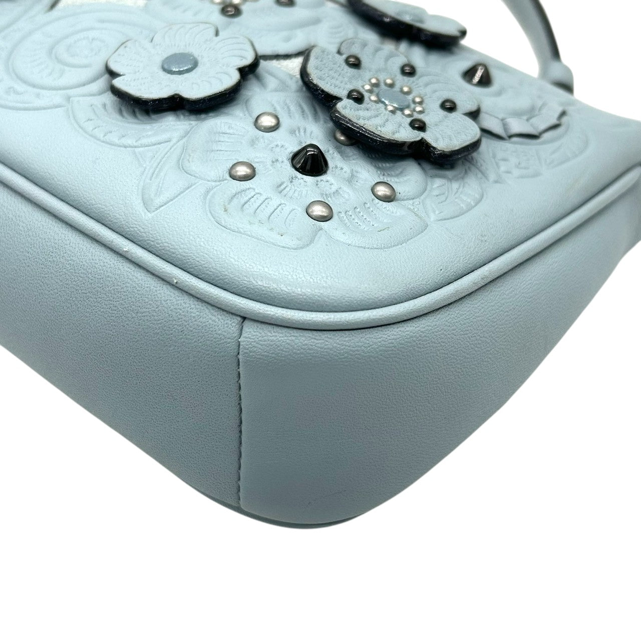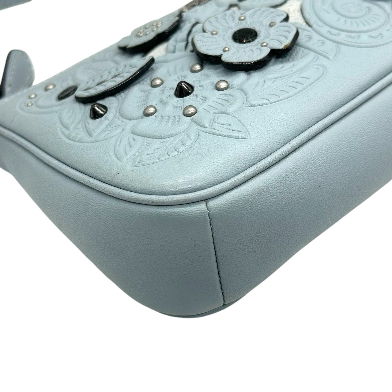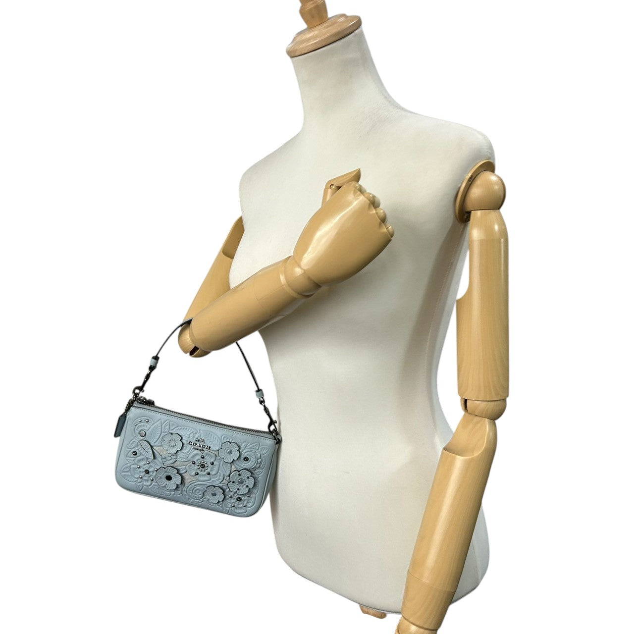 【美品】コーチ ティーローズ フローラル ハンドバッグ 12055 レザー スウェード ライトブルー アクセサリーポーチ リストレット レディース COACH 花柄 エンボス スタッズ グリッター ミニバッグ パーティバッグ s12