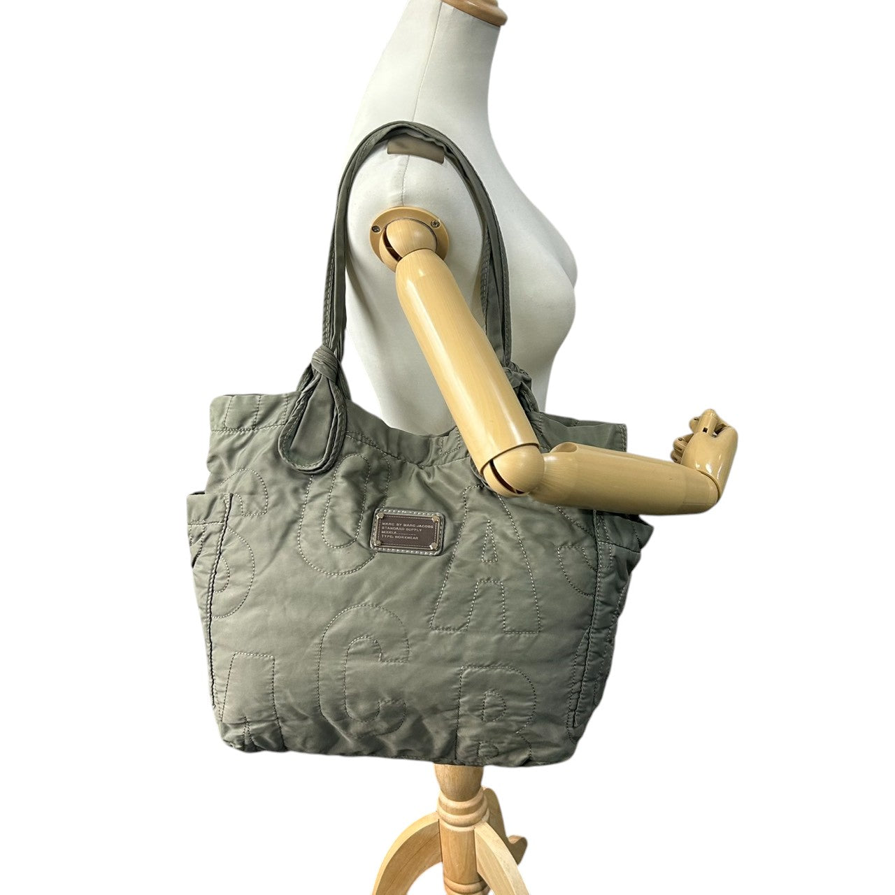 【美品】マークバイマークジェイコブス ナイロン キルティング トートバッグ ロゴ A4可 大容量 マザーズバッグ カーキ レディース MARC BY MARC JACOBS STANDARD SUPPLY 肩掛け ワンショルダー 軽量 s30