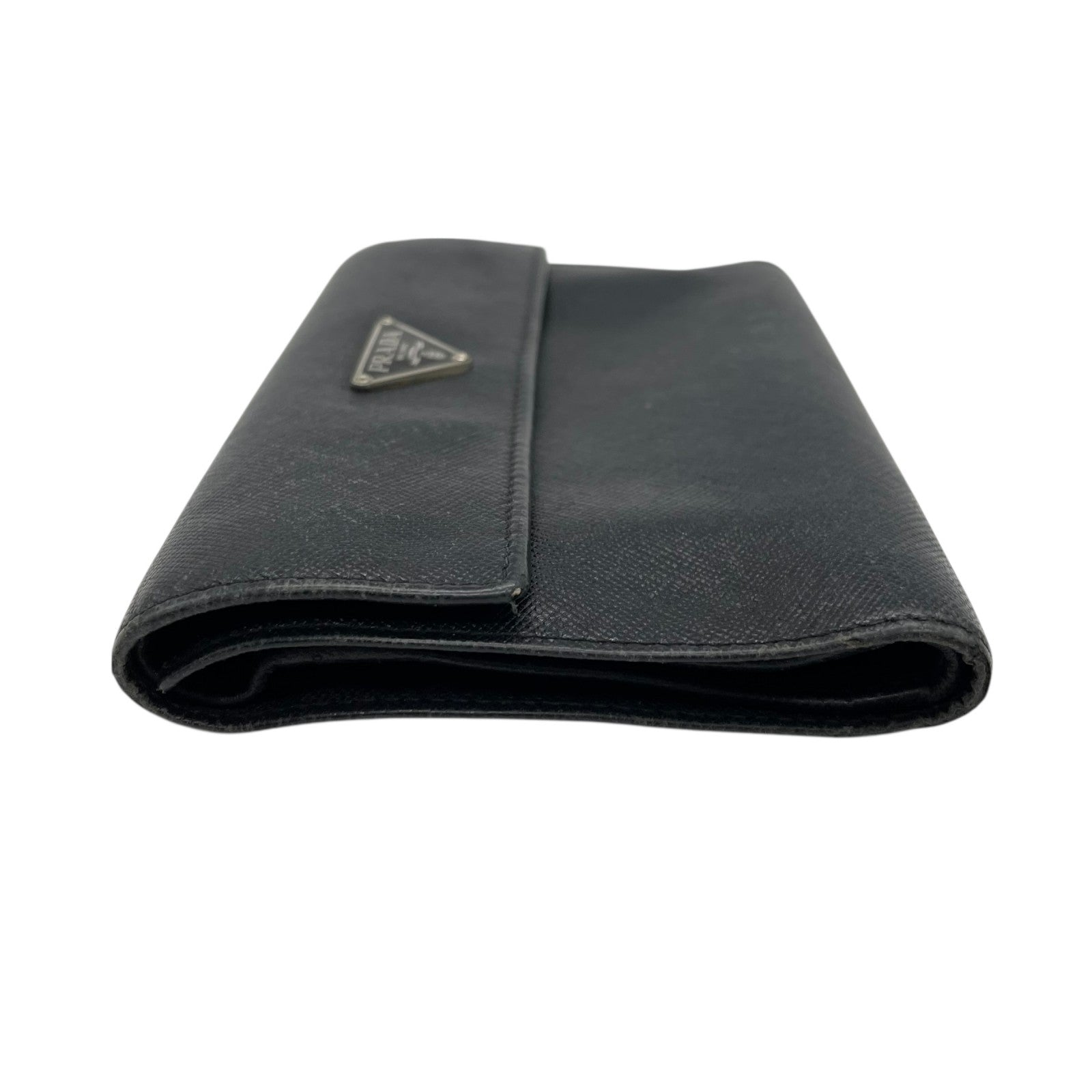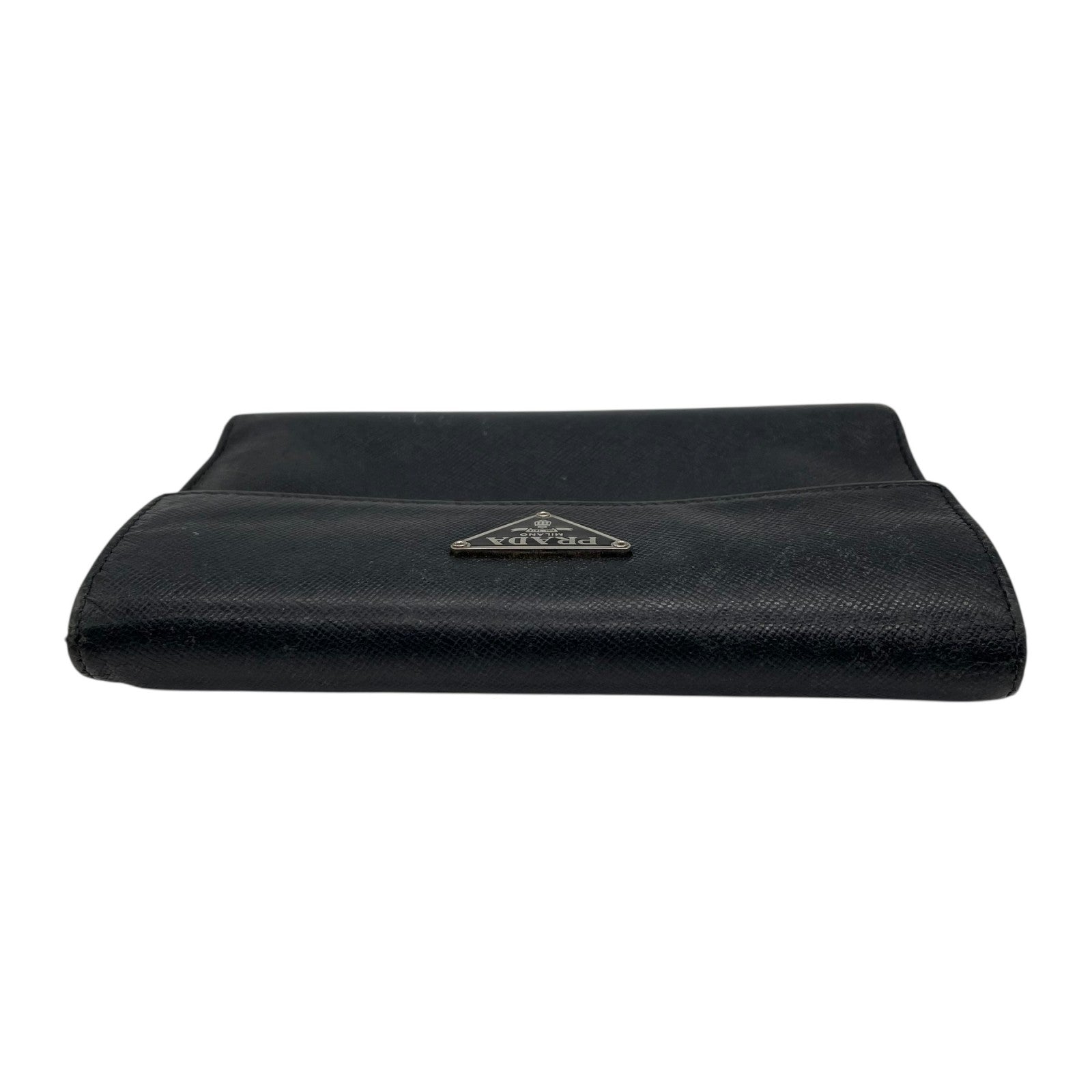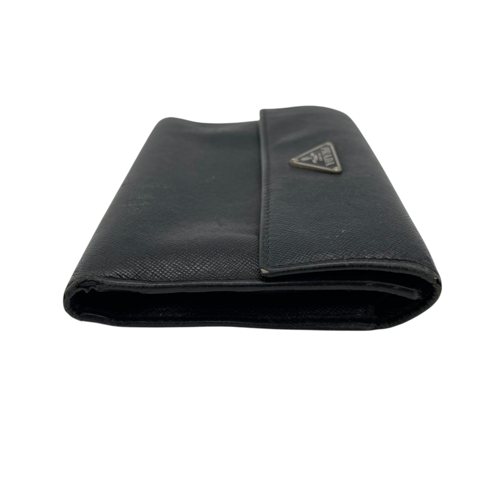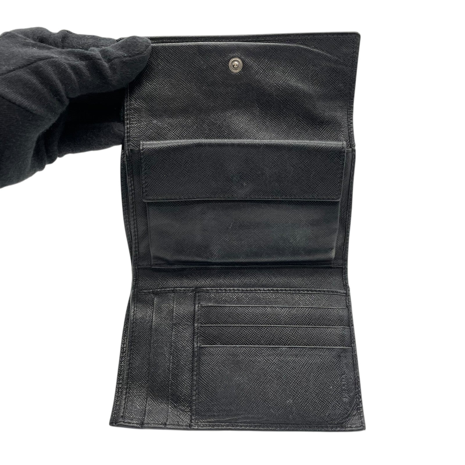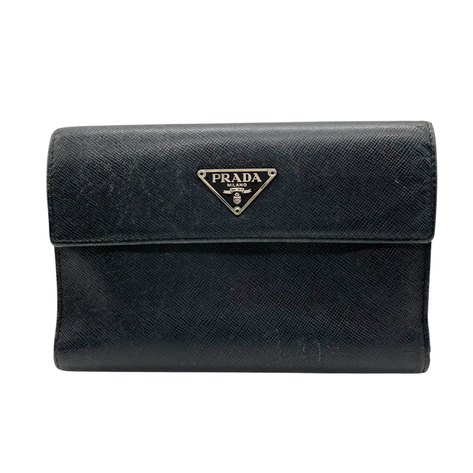 PRADA プラダ 三つ折り財布 コンパクトウォレット フラップ サフィアーノレザー ブラック 三角ロゴ トライアングルロゴ シルバー金具 メンズ レディース W3
