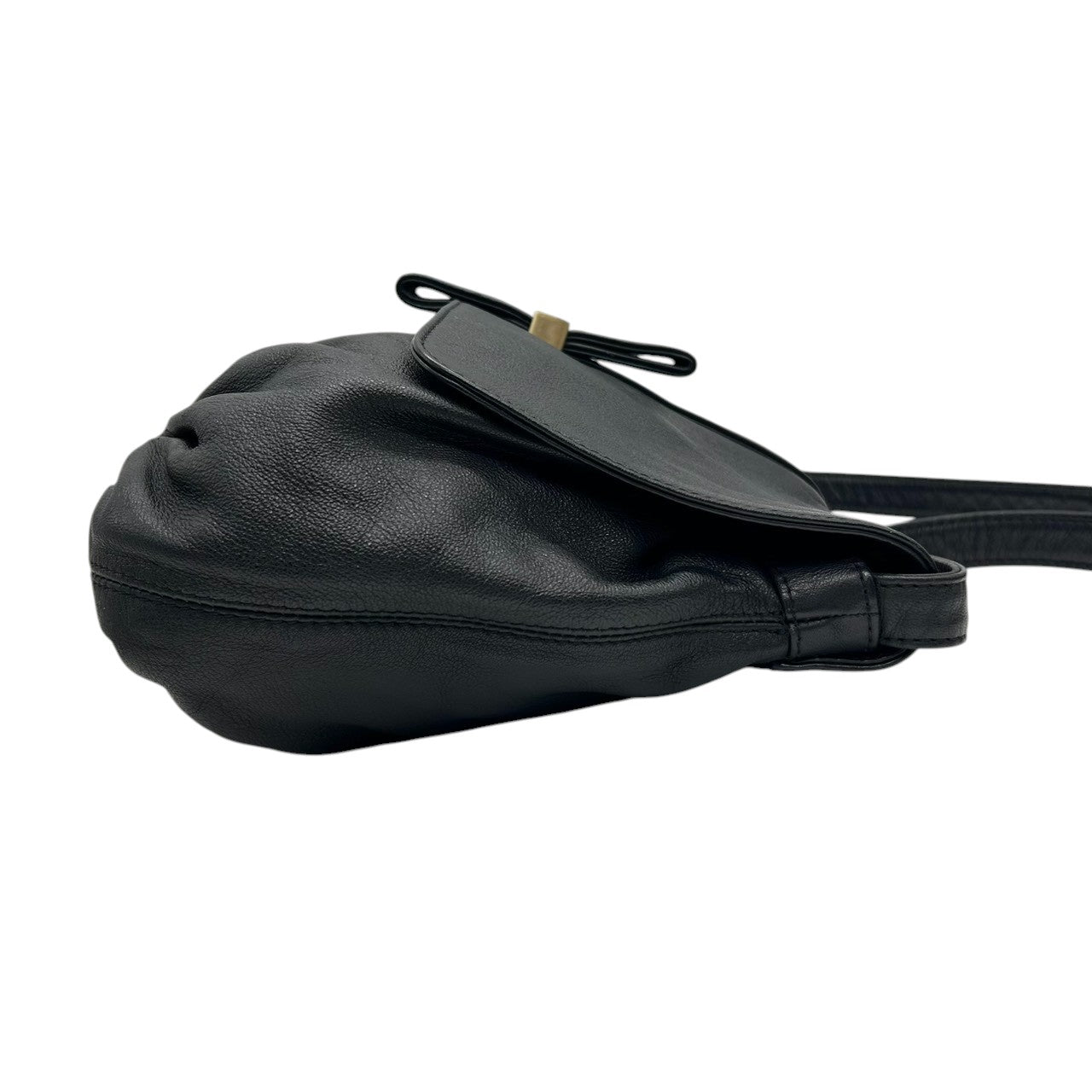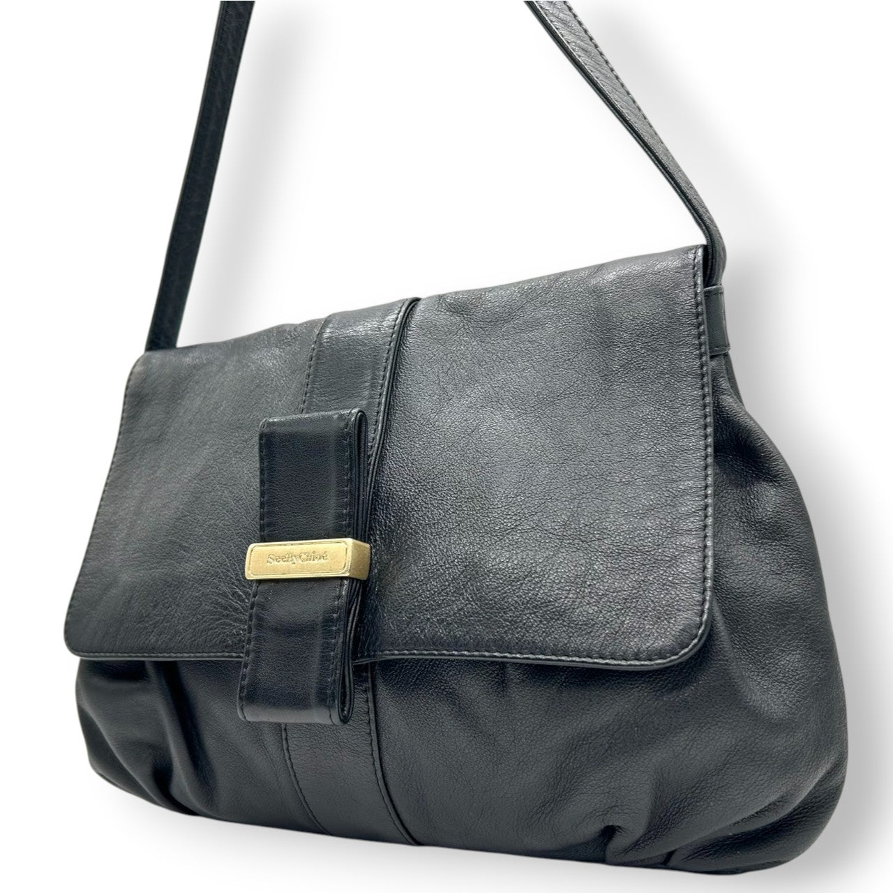 【美品】シーバイクロエ 本革レザー ショルダーバッグ フラップバッグ リボンモチーフ ゴールドロゴプレート ブラック レディース 斜め掛け可 肩掛け クロスボディ エレガント フェミニン 上品 大人可愛い クラシックデザイン U9