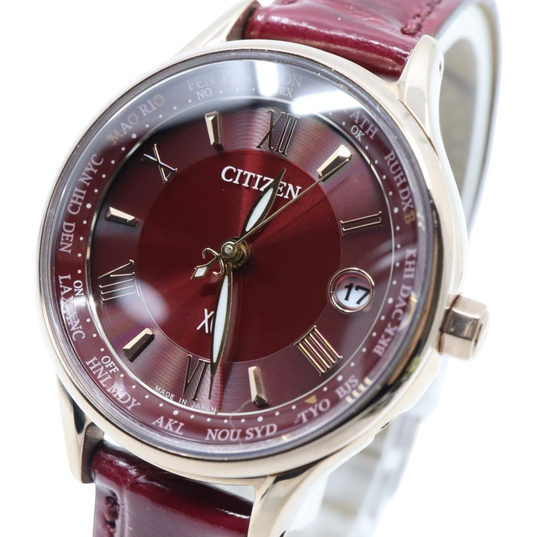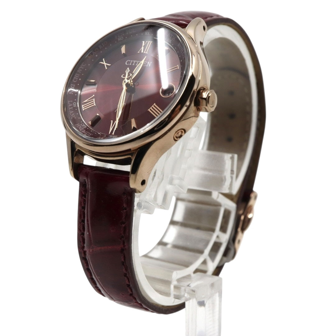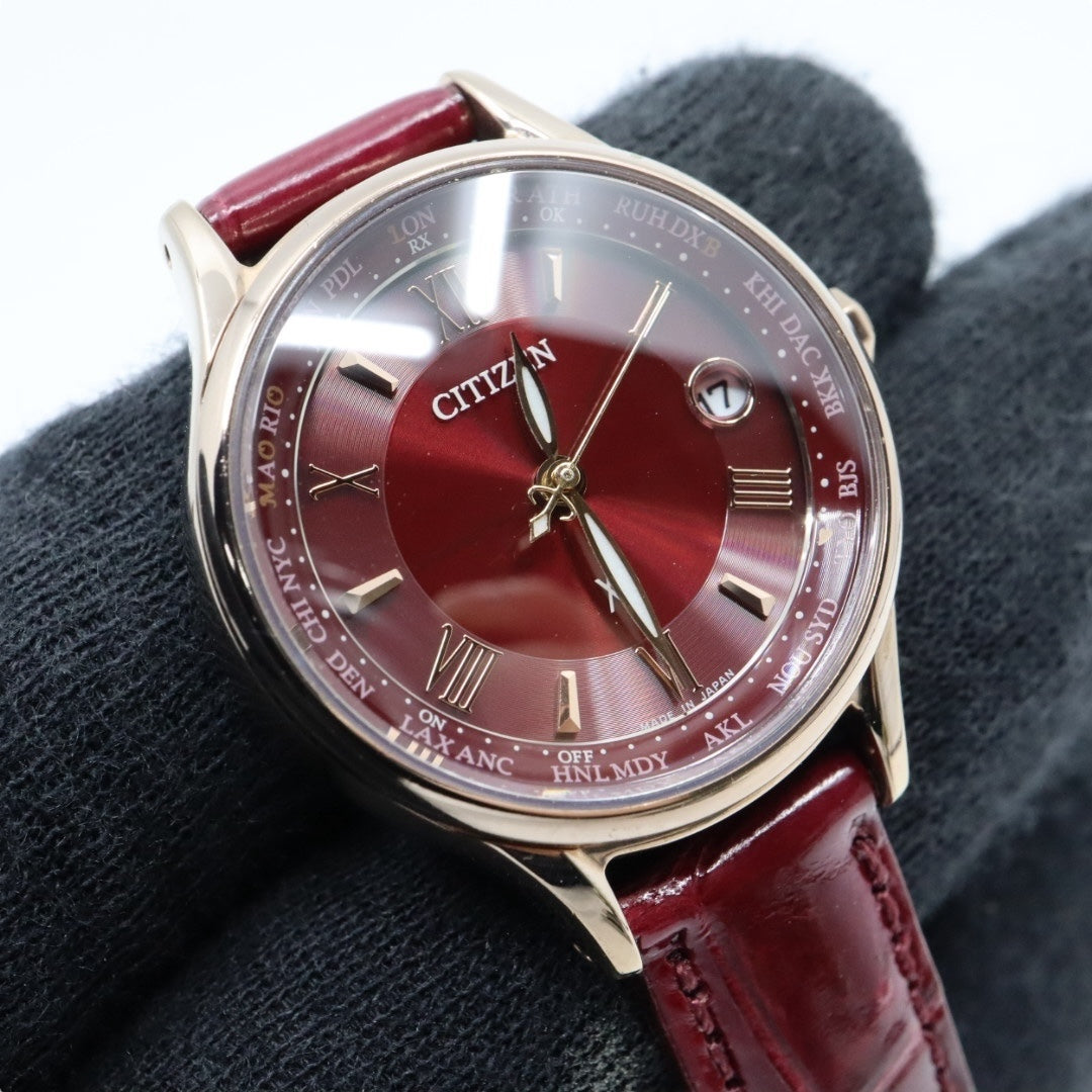 【美品】シチズン xC クロスシー 腕時計 エコドライブ電波時計 H246 チタン ローズゴールド レッド サンバースト レザーベルト レディース G4