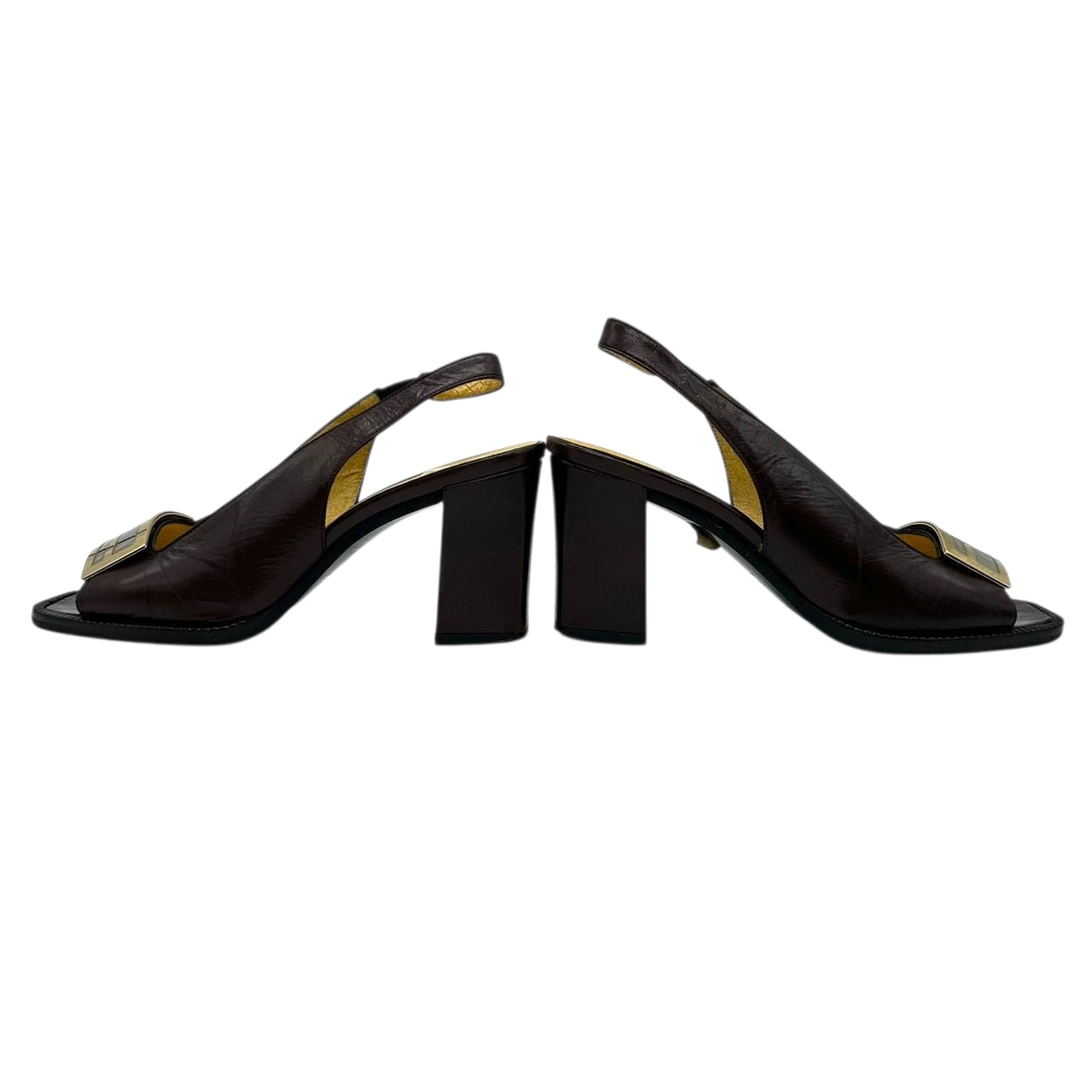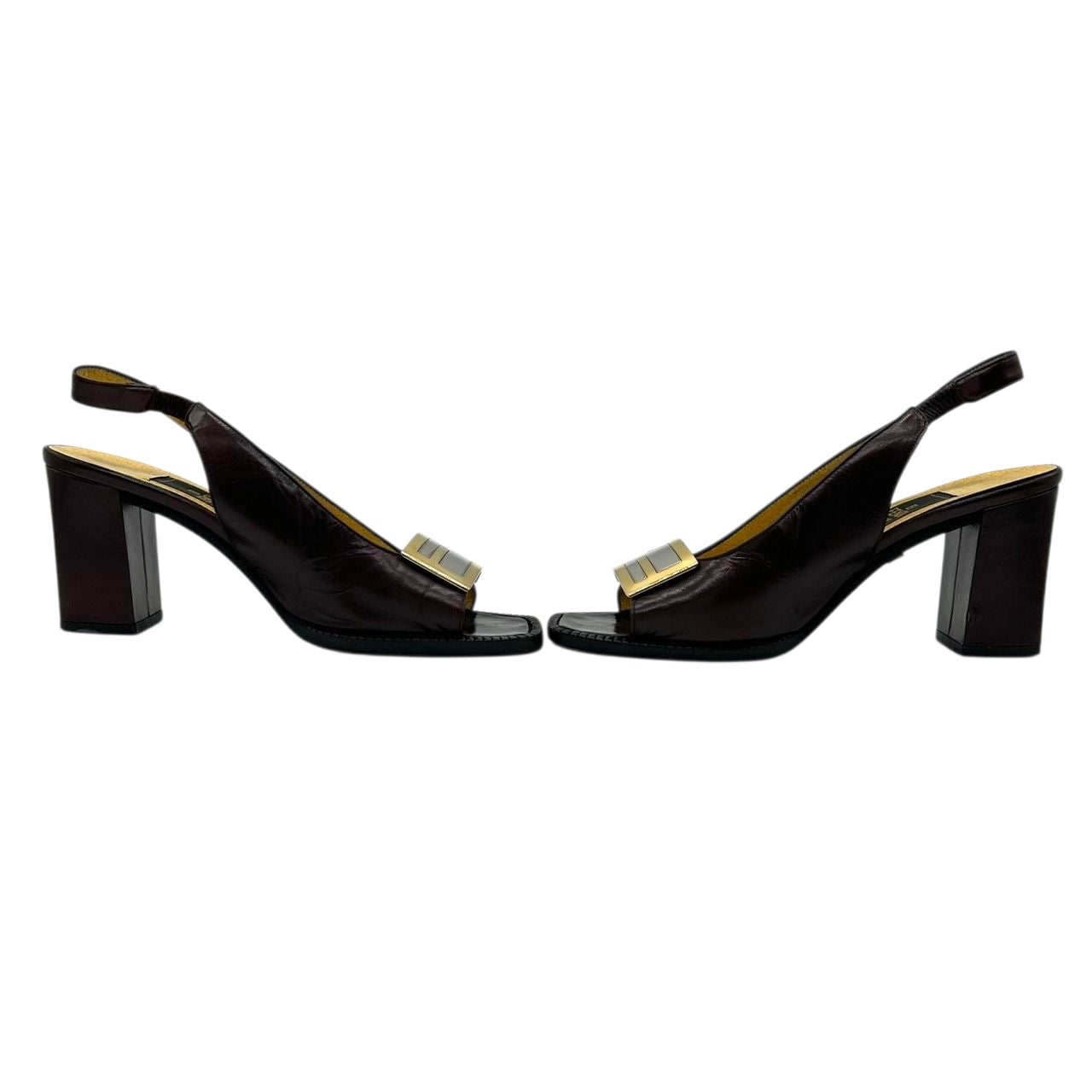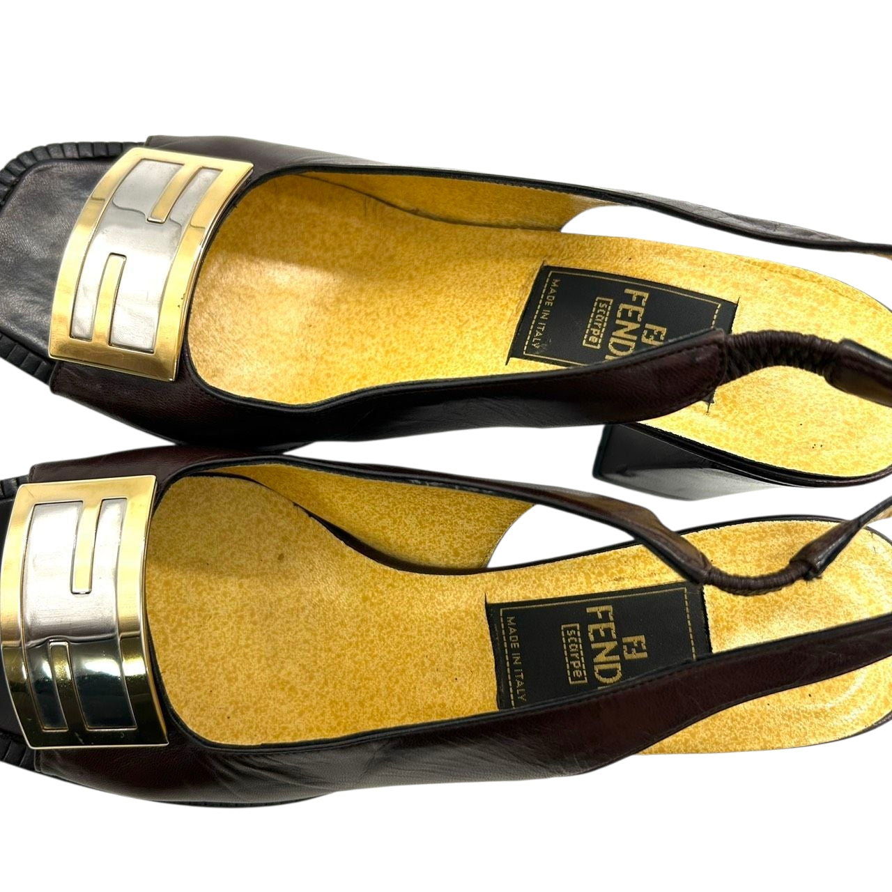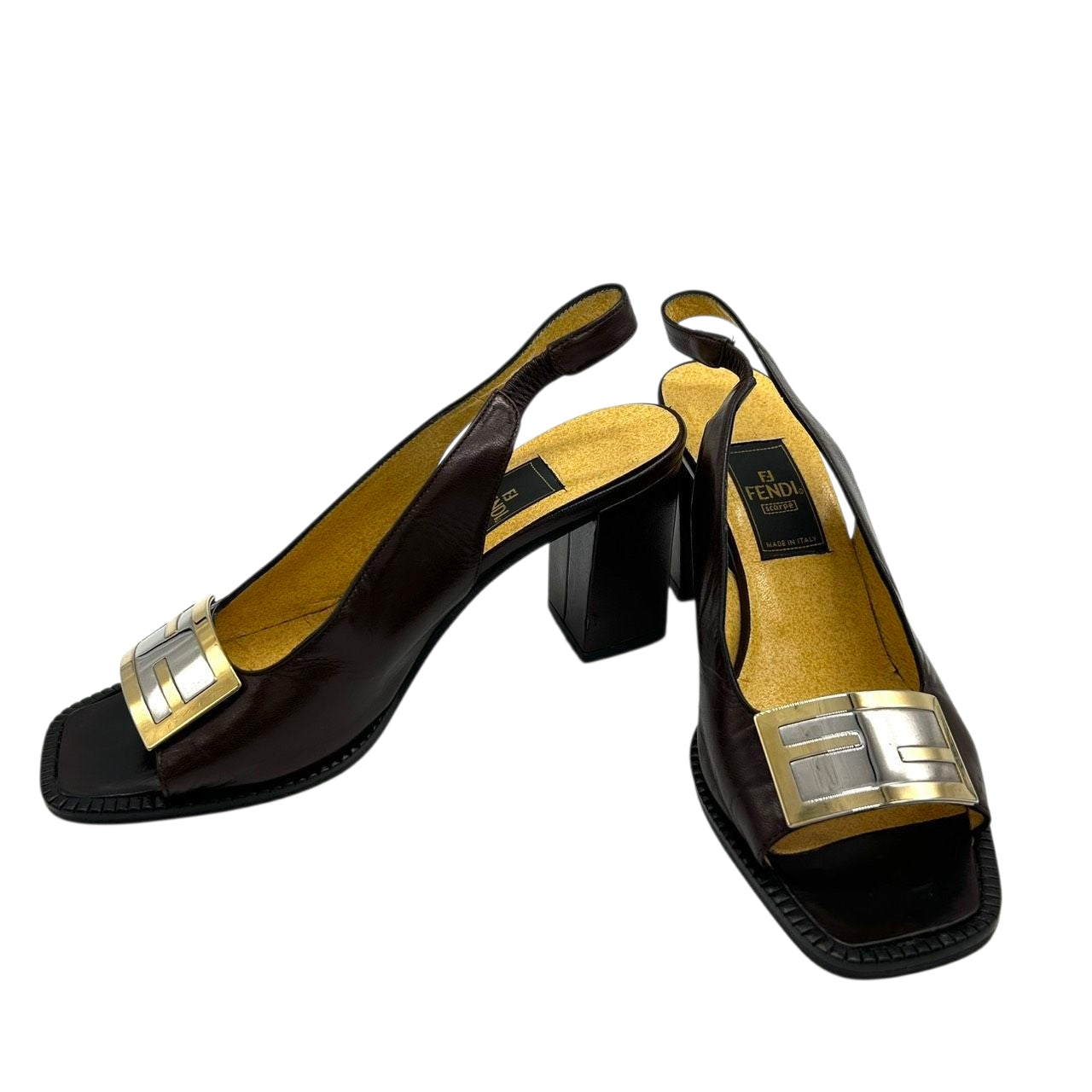 フェンディ FENDI サンダル ミュール ズッカ FFロゴ バックストラップ スクエアトゥ レザー 本革 ダークブラウン ゴールド シルバー 36 23cm イタリア製 ハイヒール エレガント ラグジュアリー ヴィンテージ CT1