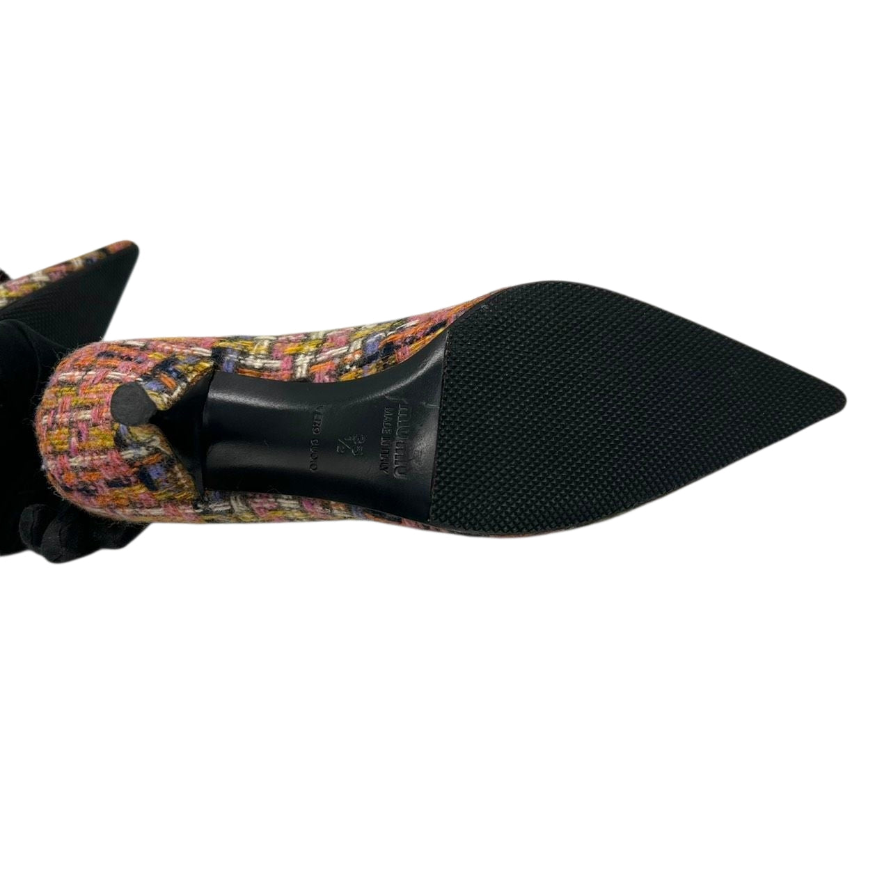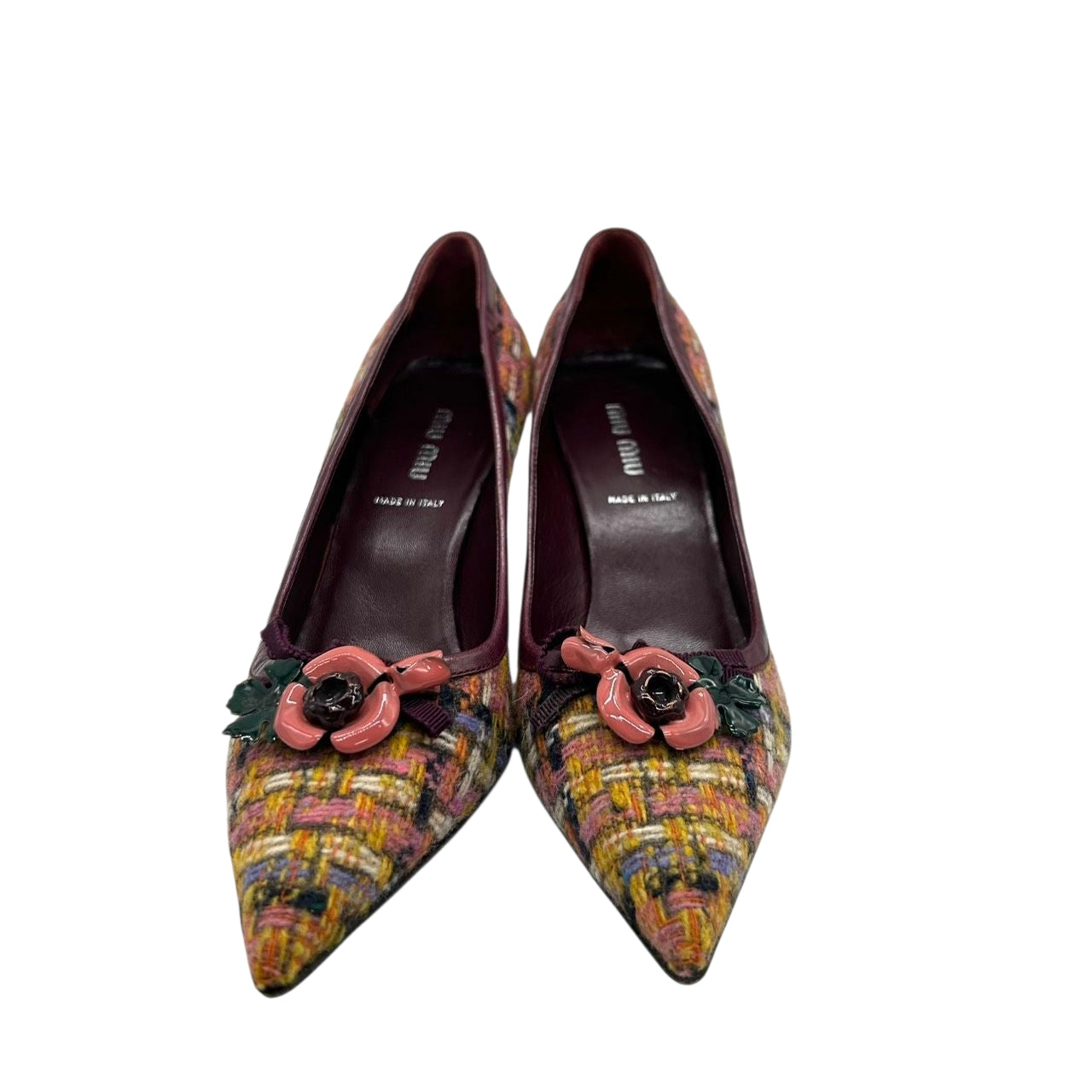 ミュウミュウ MIU MIU パンプス ポインテッドトゥ ツイード フラワーモチーフ 花飾り レザー マルチカラー ボルドー 35 1/2 22.5cm イタリア製 ハイヒール エレガント フェミニン パーティ ドレスシューズ レディース CT1