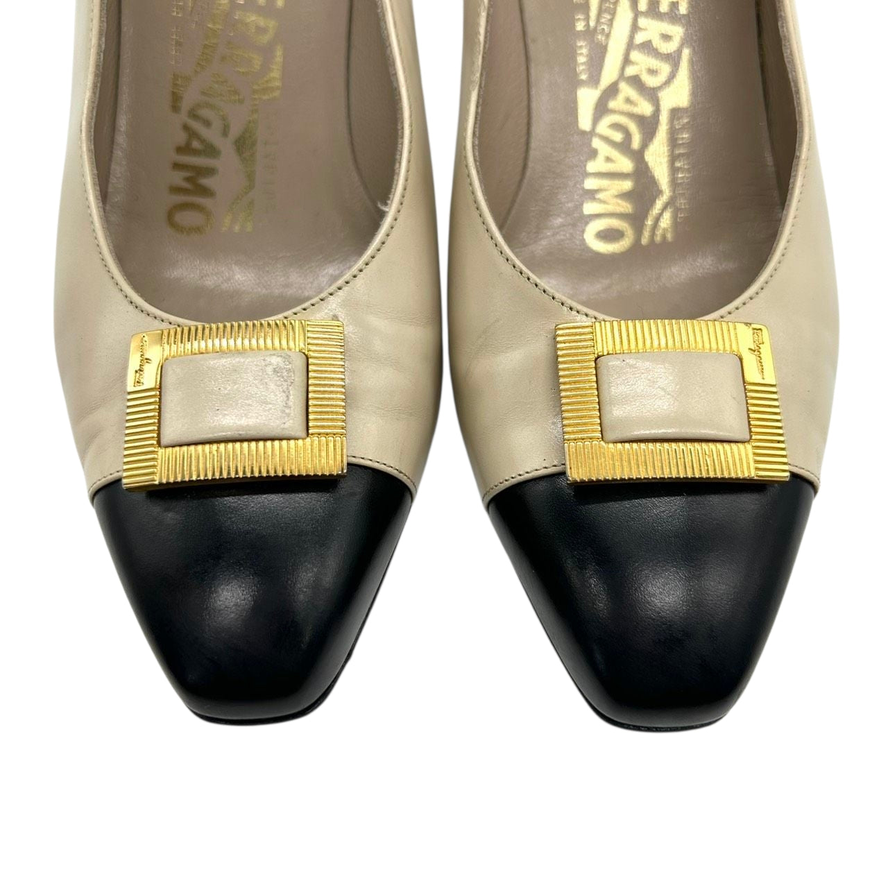 フェラガモ パンプス ヴァラ スクエアバックル バイカラー レザー ベージュ ブラック 5D 22cm イタリア製 キャップトゥ ハイヒール レディース エレガント クラシック フォーマル オフィス ビジネス ヴィンテージ CT1