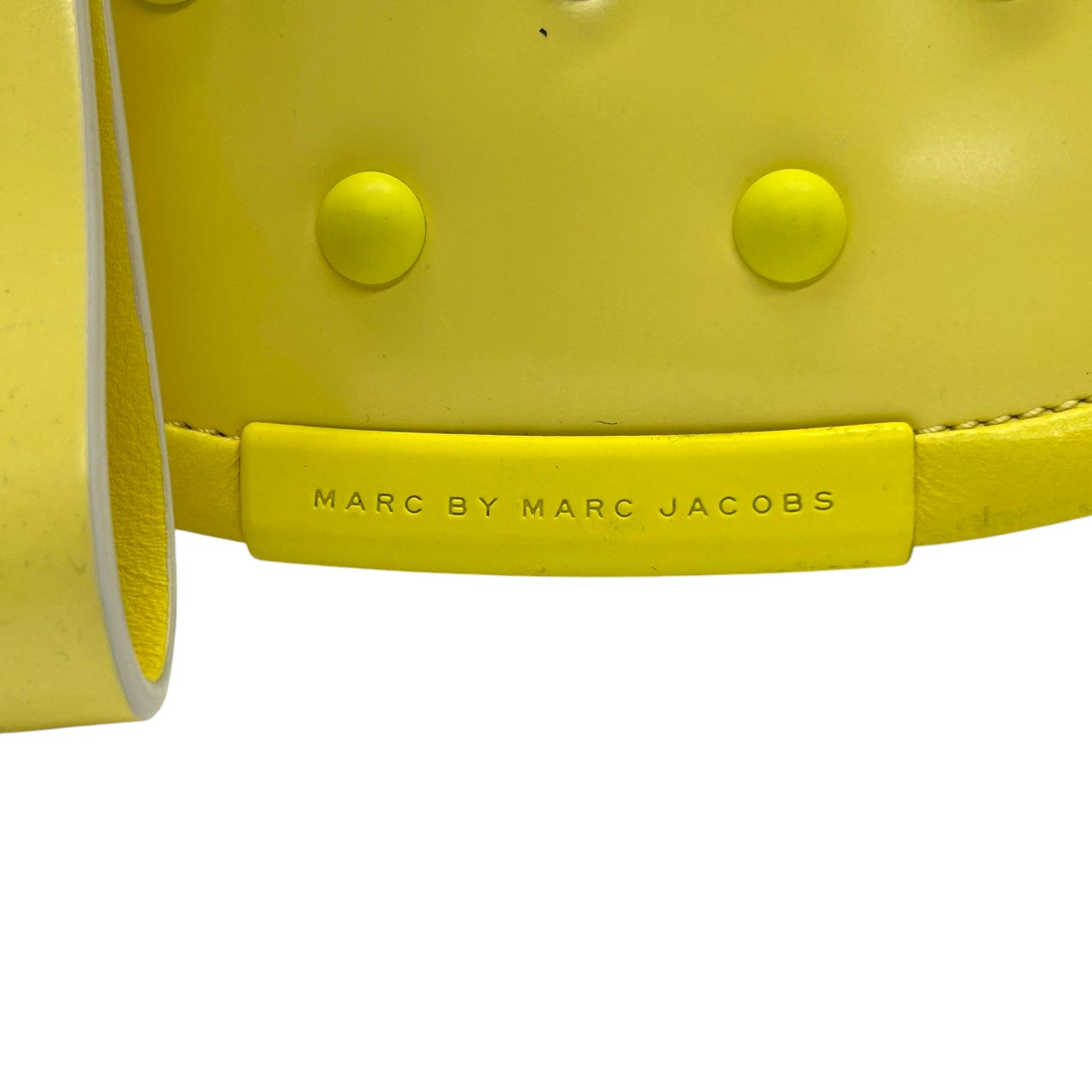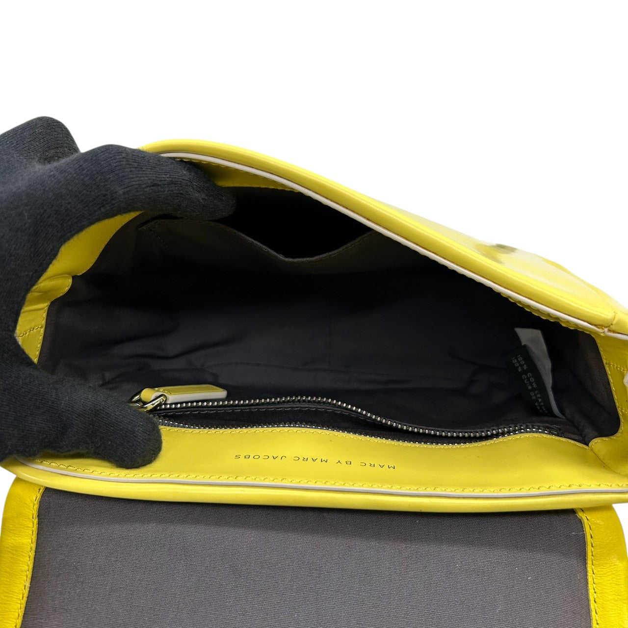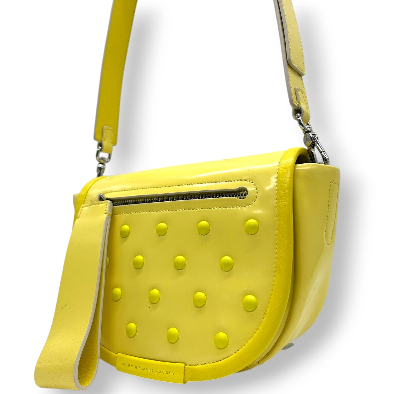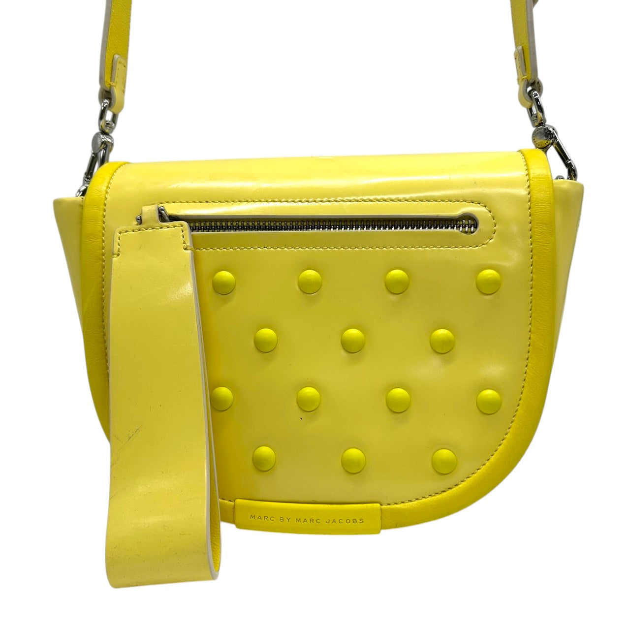 マークバイマークジェイコブス ショルダーバッグ ポシェット クロスボディ 斜め掛け可 サドル フラップ スタッズ エナメル パテントレザー イエロー シルバー金具 レディース コンパクト ポップ カジュアル フェミニン お出かけ デート s5
