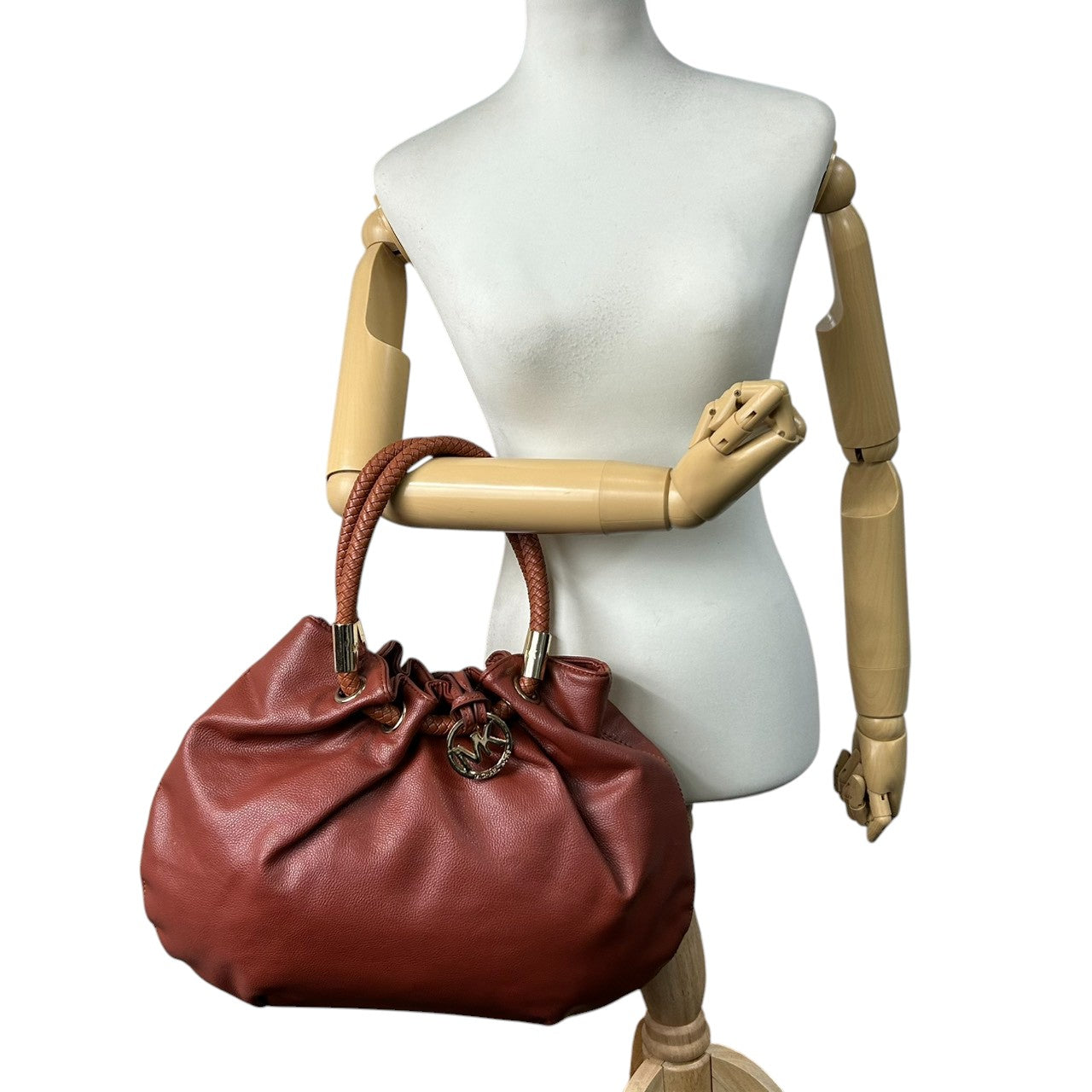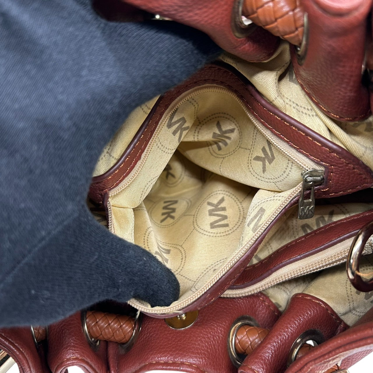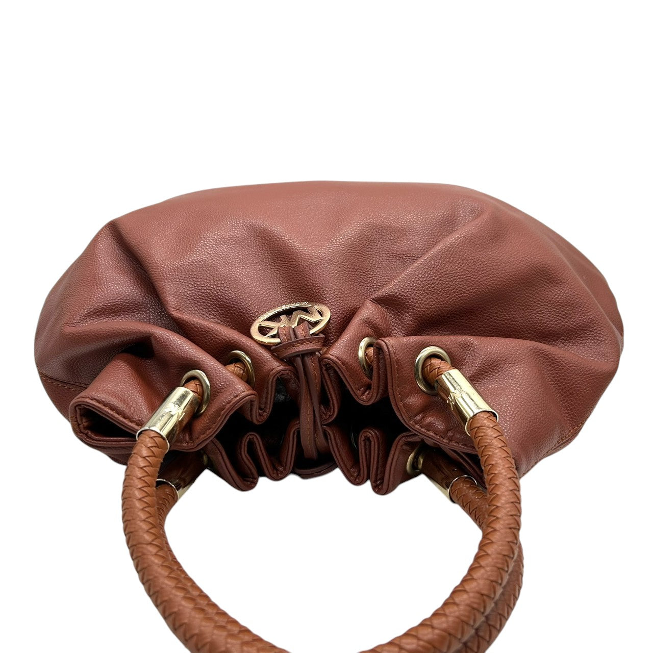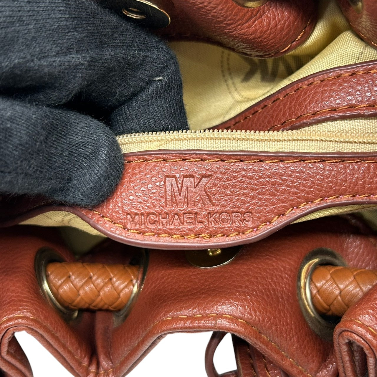 【美品】マイケルコース ハンドバッグ 巾着バッグ ワンショルダー 編み込みハンドル レザー 本革 ブラウン MKロゴチャーム ゴールド金具 レディース 肩掛け 大容量 ギャザー かわいい フェミニン エレガント s83