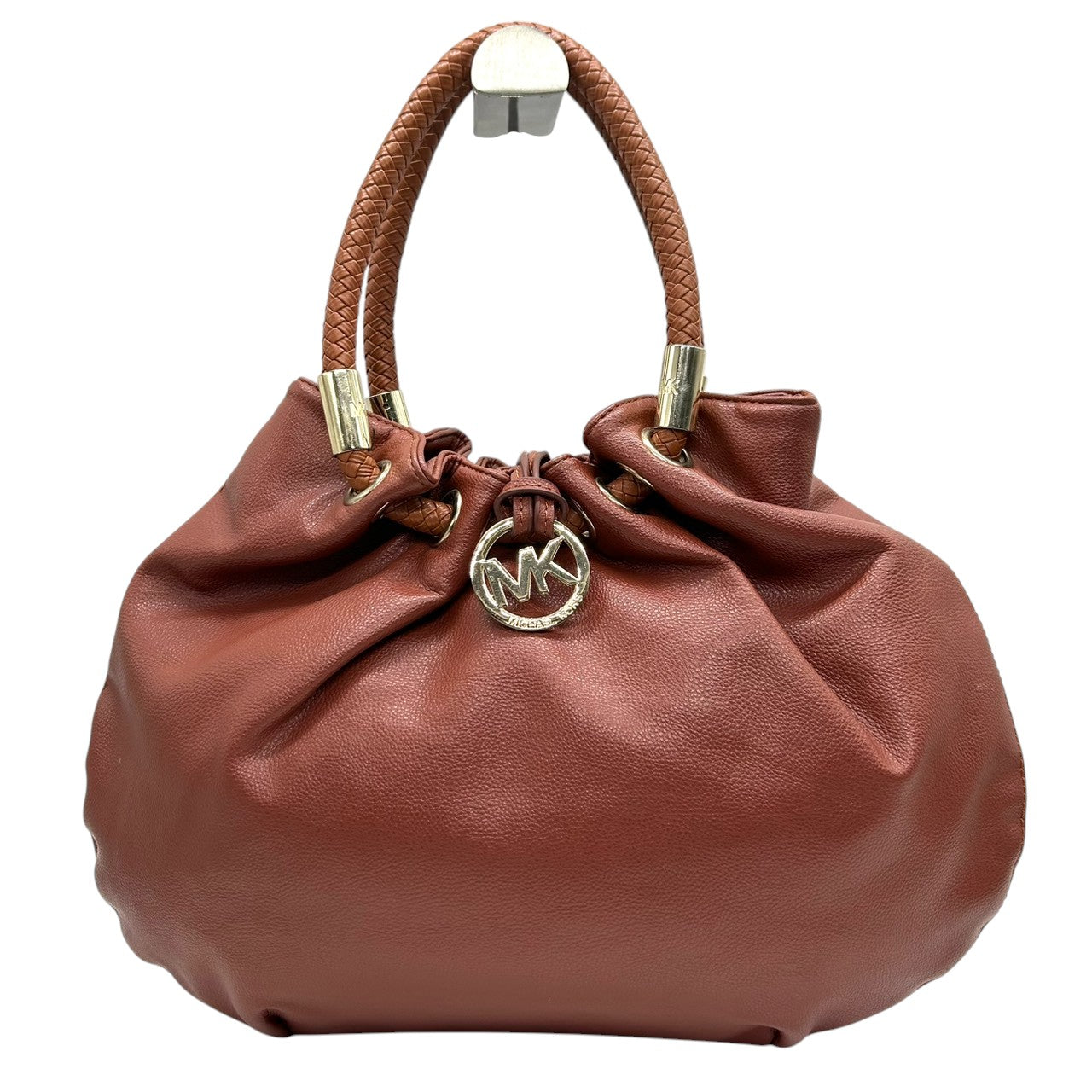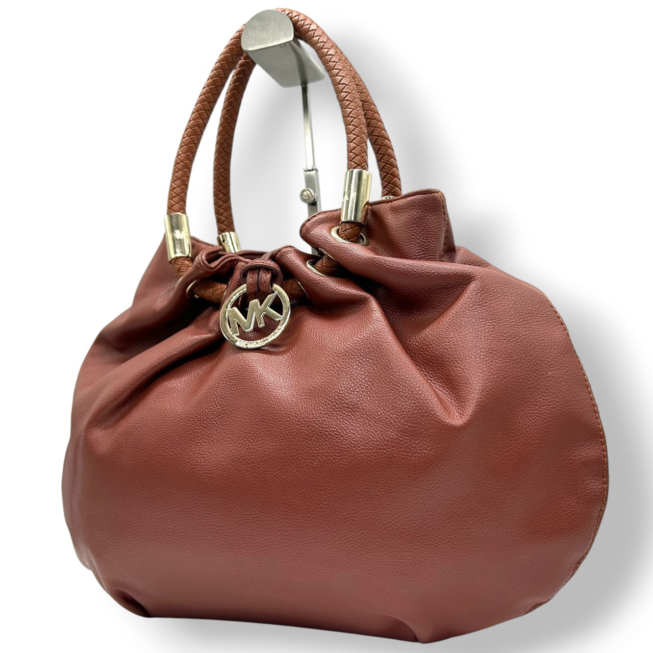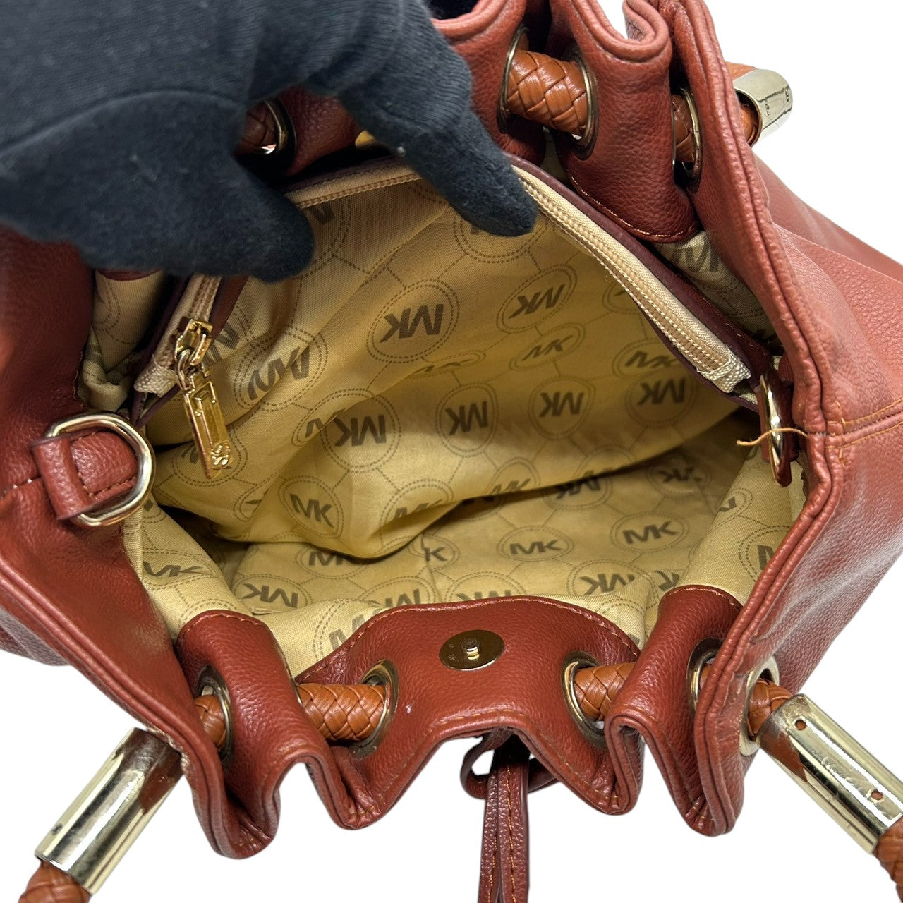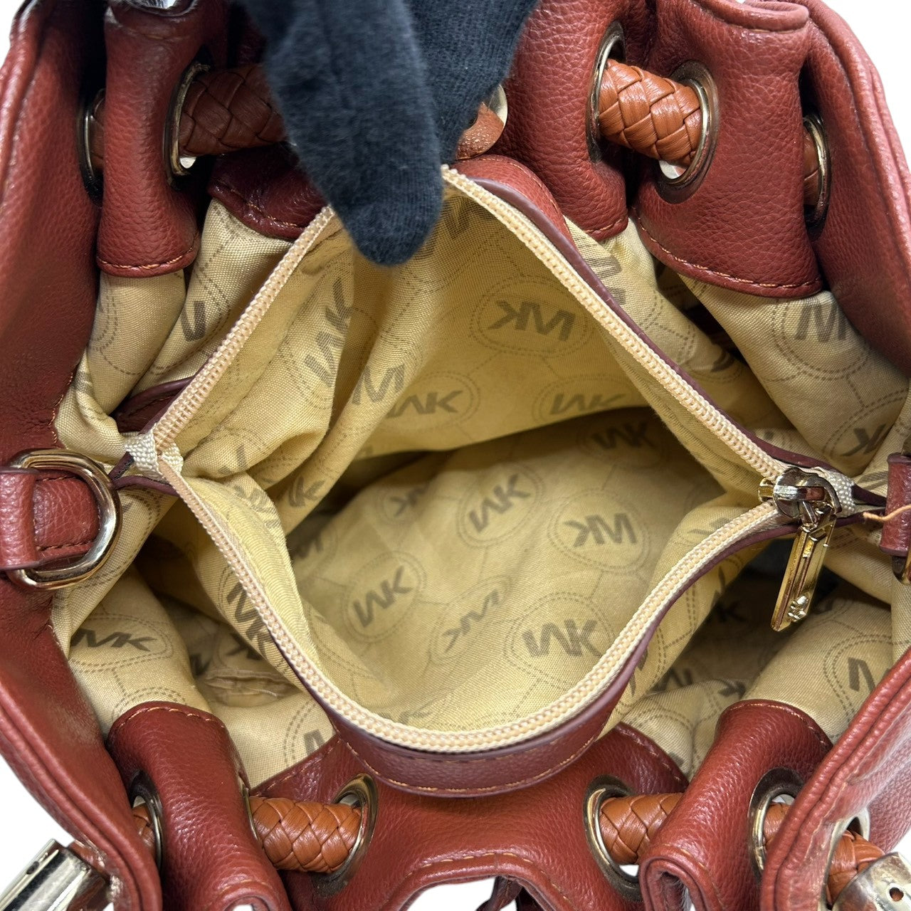 【美品】マイケルコース ハンドバッグ 巾着バッグ ワンショルダー 編み込みハンドル レザー 本革 ブラウン MKロゴチャーム ゴールド金具 レディース 肩掛け 大容量 ギャザー かわいい フェミニン エレガント s83
