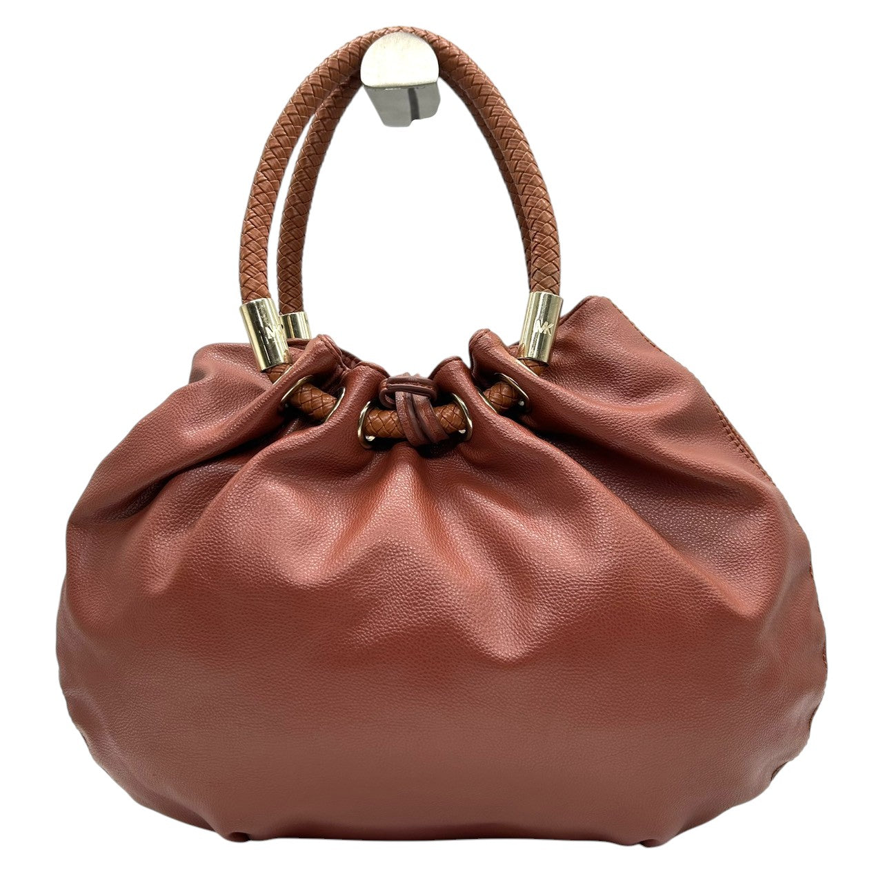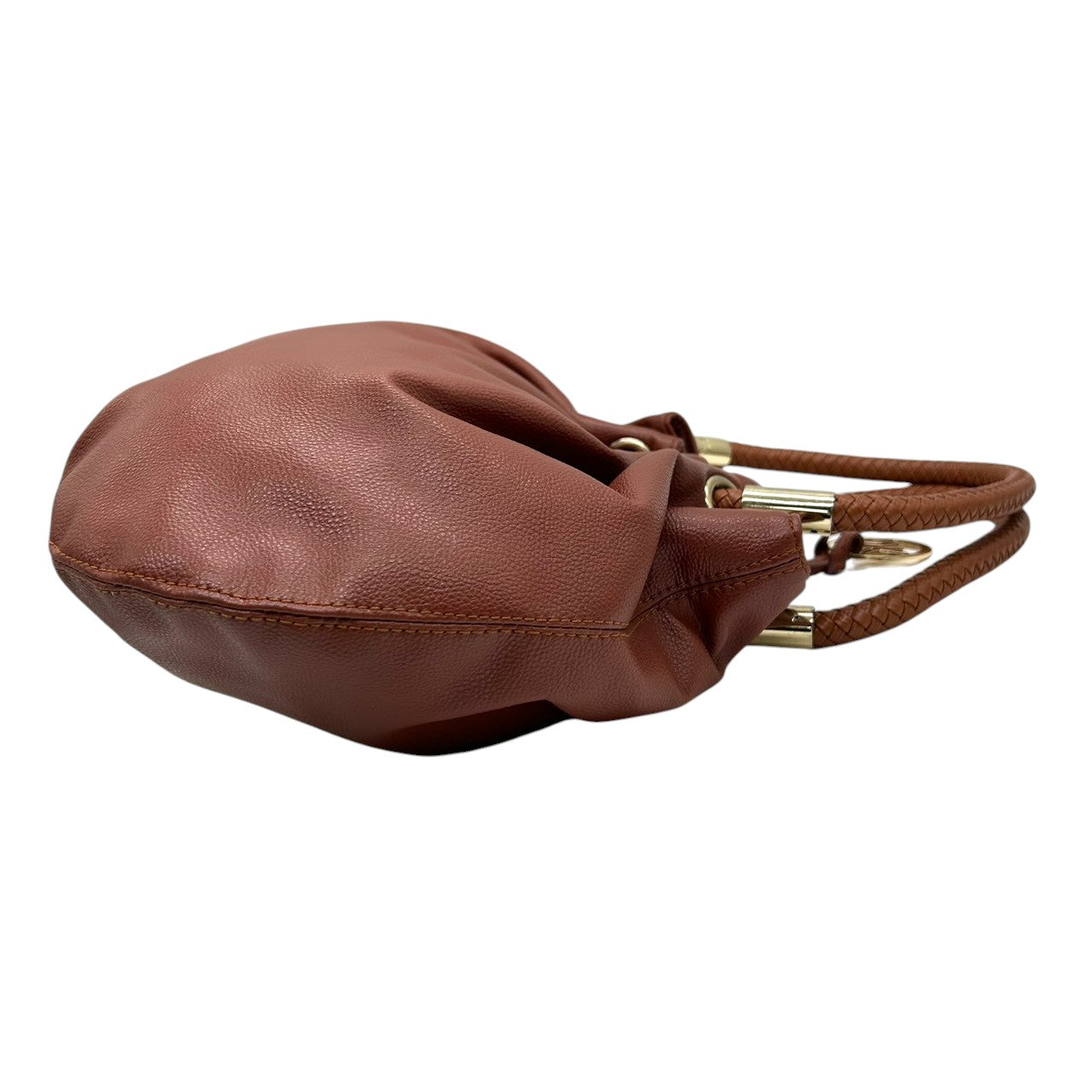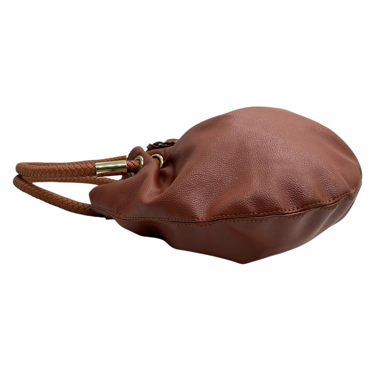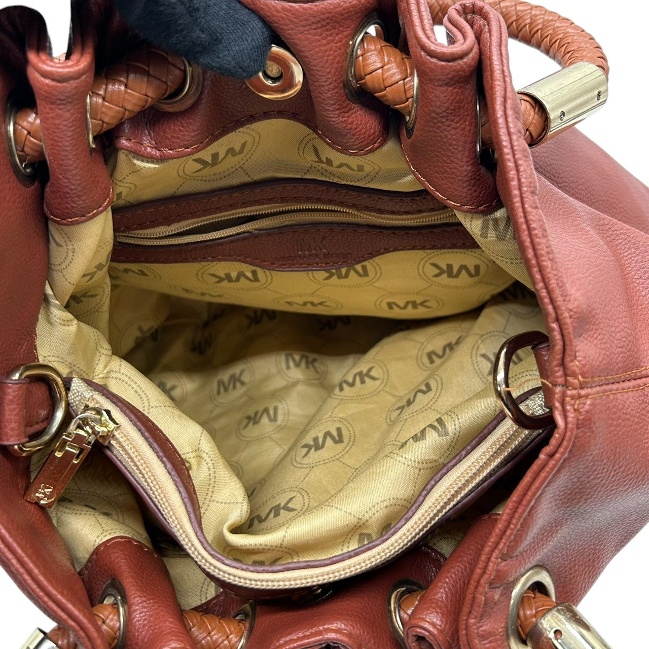 【美品】マイケルコース ハンドバッグ 巾着バッグ ワンショルダー 編み込みハンドル レザー 本革 ブラウン MKロゴチャーム ゴールド金具 レディース 肩掛け 大容量 ギャザー かわいい フェミニン エレガント s83