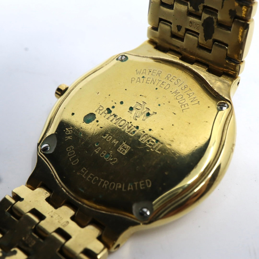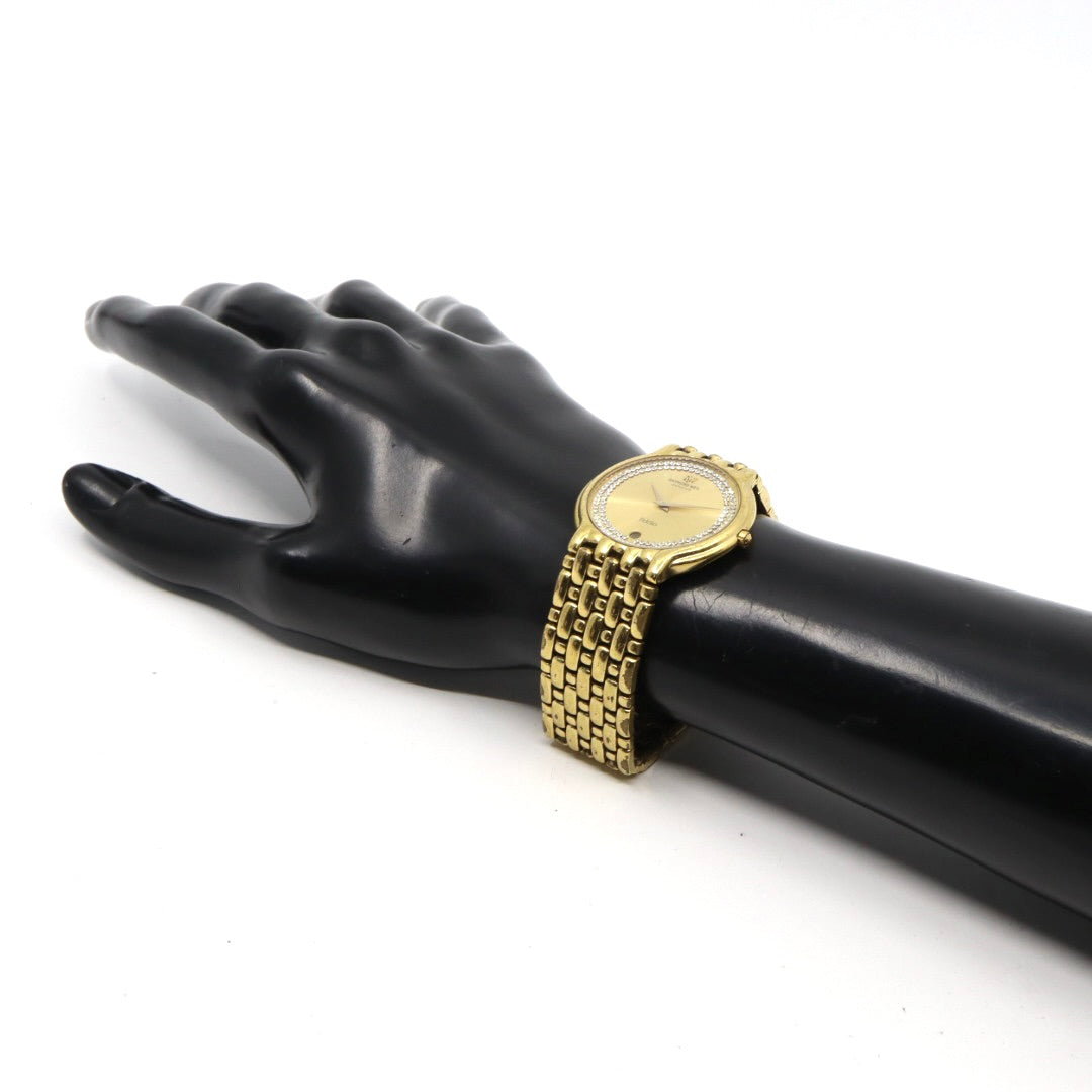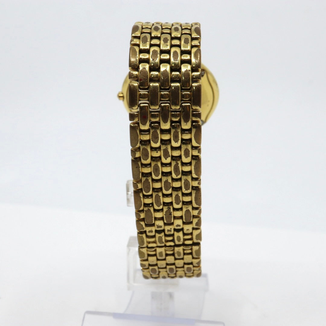 | 商品説明 | スイス独立系メゾンとして知られるRaymond Weilが1990年代に手掛けた「Fidélio(フィデリオ)」は、クラシック音楽へのオマージュを込めたエレガントなコレクション。本作はシンプルなラウンドケースに、華やかなクリスタルベゼル(約94石)を配したラグジュアリーな一本で、シャンパンゴールドの文字盤が上品な輝きを添えます。 ケースおよびブレスレットは18Kゴールド電気メッキを施したステンレススチール製で、見た目の華やかさと耐久性を両立。6時位置には日付表示を配置し、クラシックなデザインの中に実用性もしっかり備えています。ユニセックスで着用できる32mmのサイズ感は、日常使いからフォーマルまで幅広くマッチします。 Raymond Weilはスイスの家族経営ブランドとして知られ、上質なスイス製時計を手の届きやすい価格帯で展開してきたことで世界中で支持を集めています。このFidélioはその精神を体現する、端正で普遍的な魅力を持つモデルです。 【商品詳細】 ・ブランド:Raymond Weil ・モデル:Fidélio ・ムーブメント:クオーツ ・ケース素材:18Kゴールド電気メッキ/ステンレススチール ・ブレスレット素材:18Kゴールド電気メッキ/ステンレススチール ・ケース径:32mm ・腕回り:約20cm ・文字盤:シャンパンゴールド、クリスタルベゼル(約94石) ・付属品:なし 【状態】 Aランク。通常使用による軽微な擦れやメッキ薄れが裏蓋・ブレスレットに見られますが、全体として良好な外観を保っています。文字盤・針は視認性良好。クオーツムーブメントは掲載時点で正常に稼働しています。 クラシック音楽に着想を得たFidélioらしい端正な美しさが際立つ一本で、気品ある雰囲気を腕元に添えてくれます。``` |