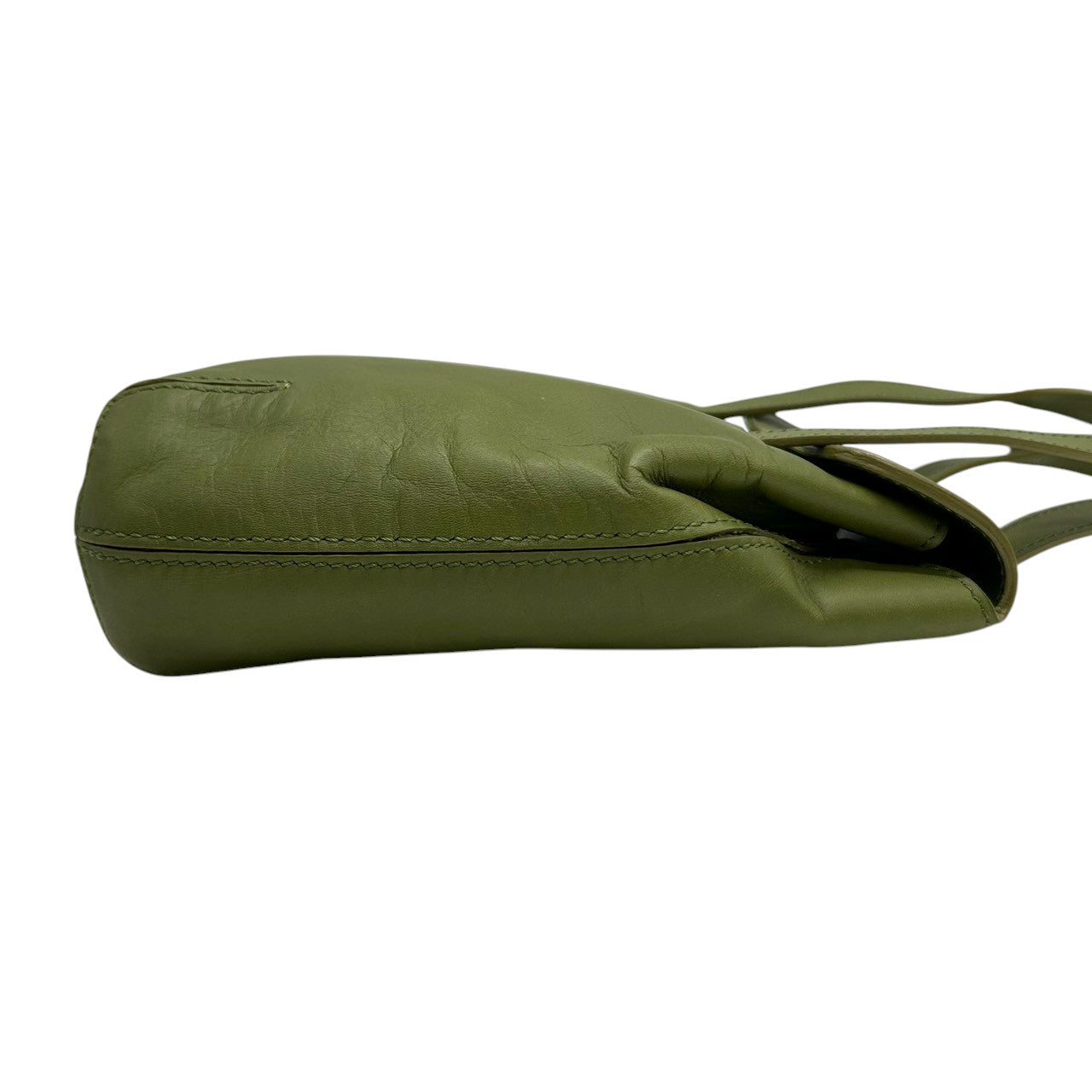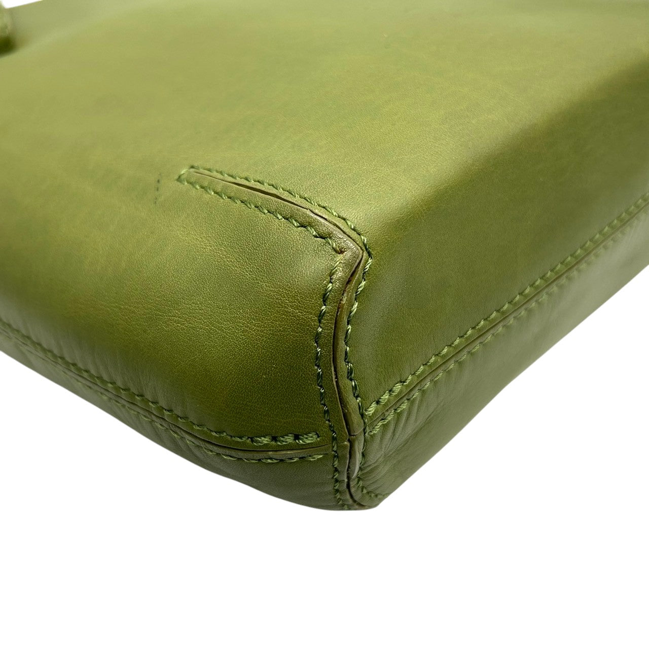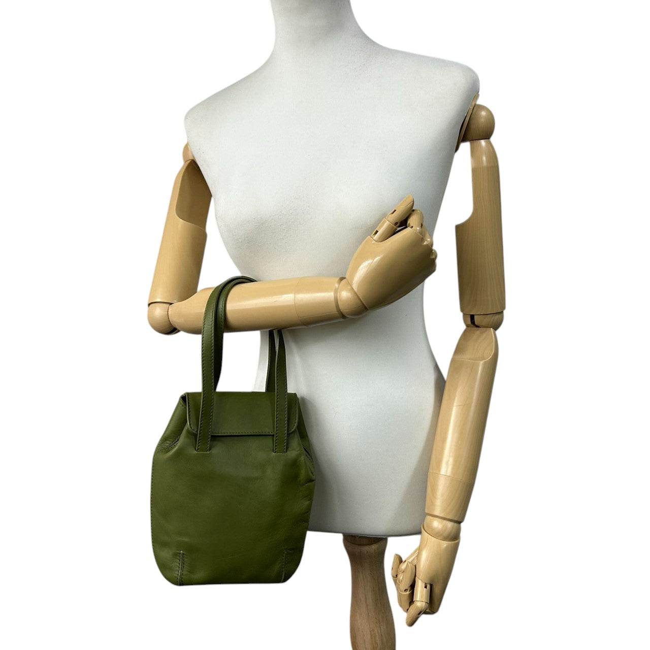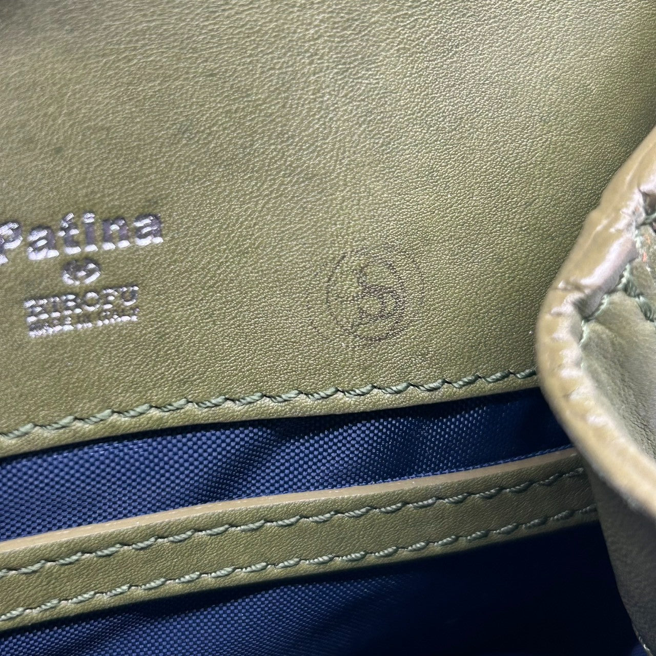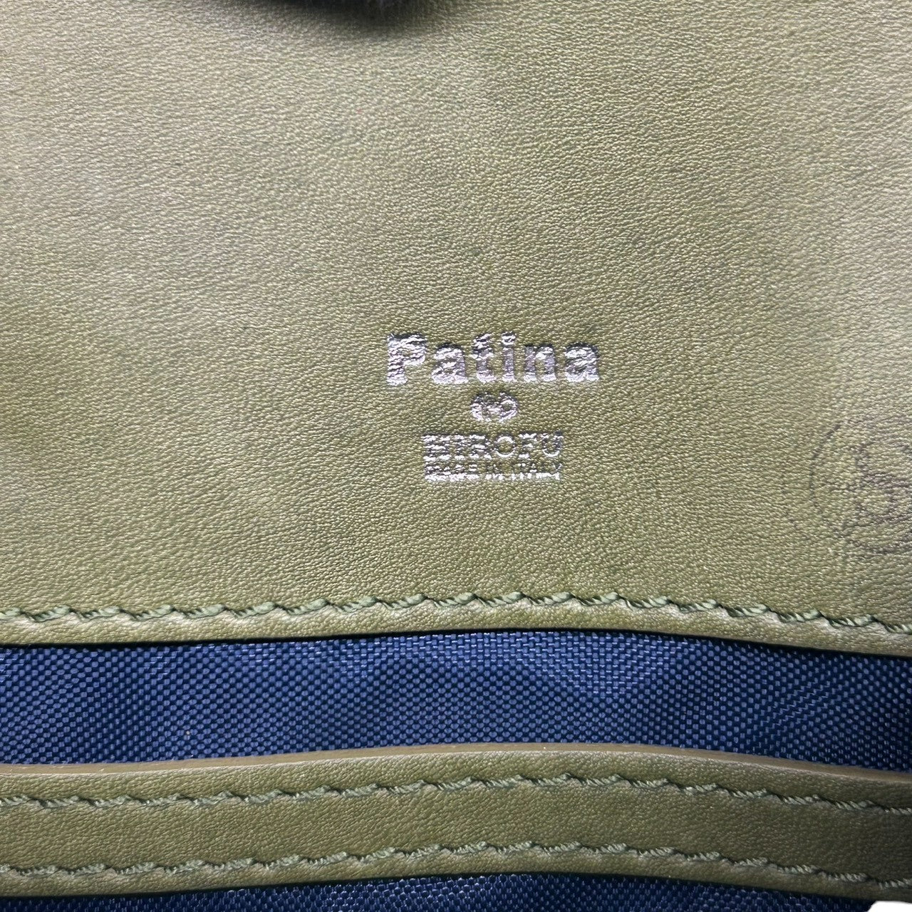 【美品】ヒロフ HIROFU ハンドバッグ ミニトートバッグ ランチバッグ レザー 本革 グリーン オリーブ カーキ 抹茶色 イタリア製 レディース コンパクト シンプル カジュアル ロゴ型押し 自立可 お出かけ デート 散歩 希少 Patina s94