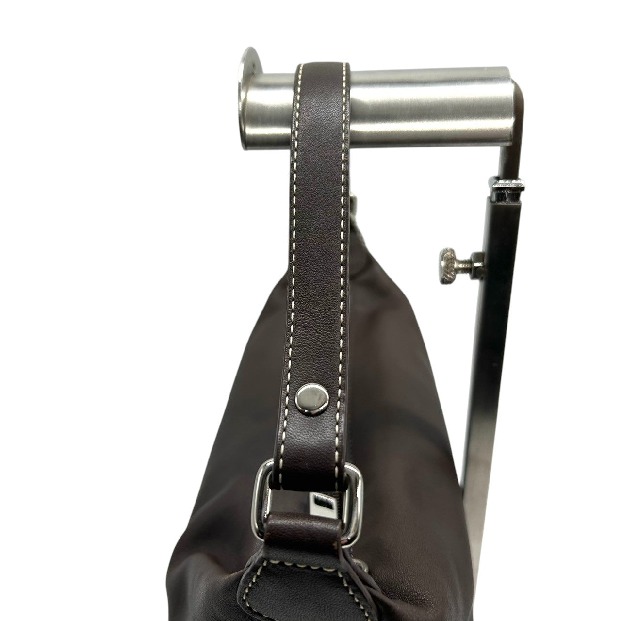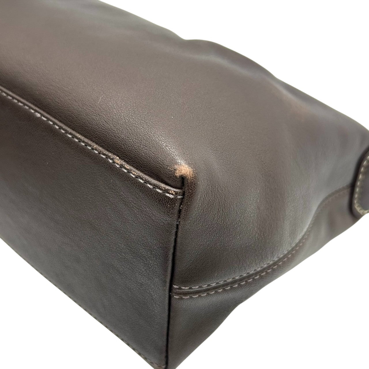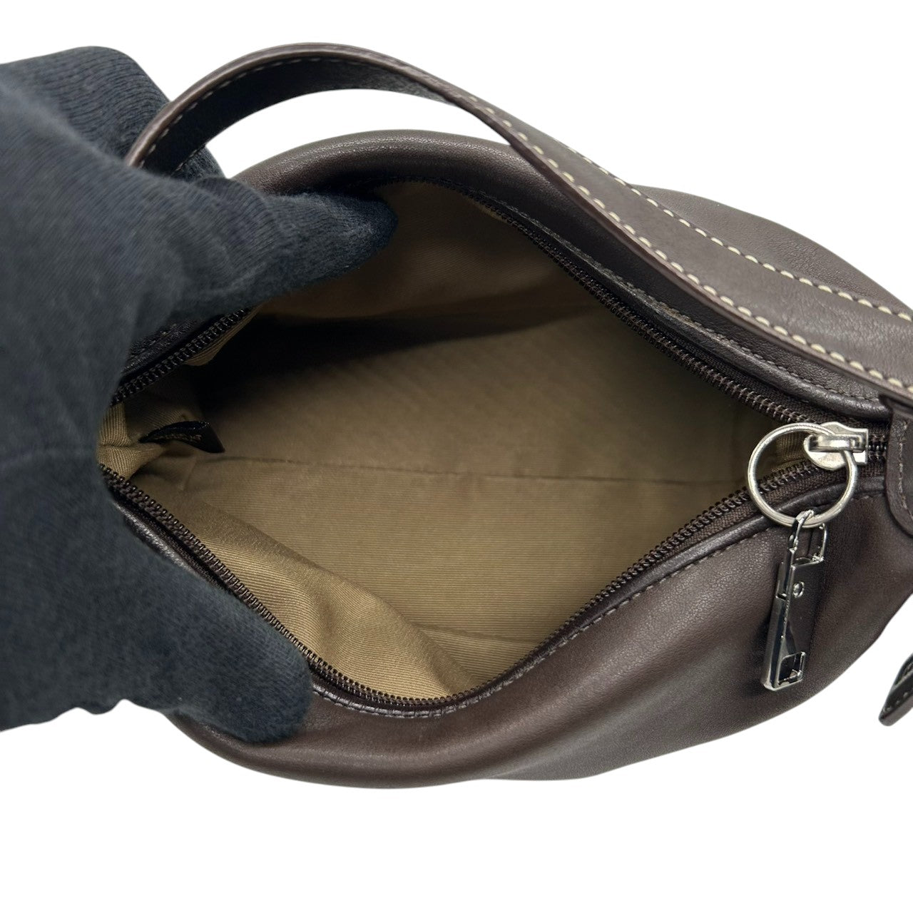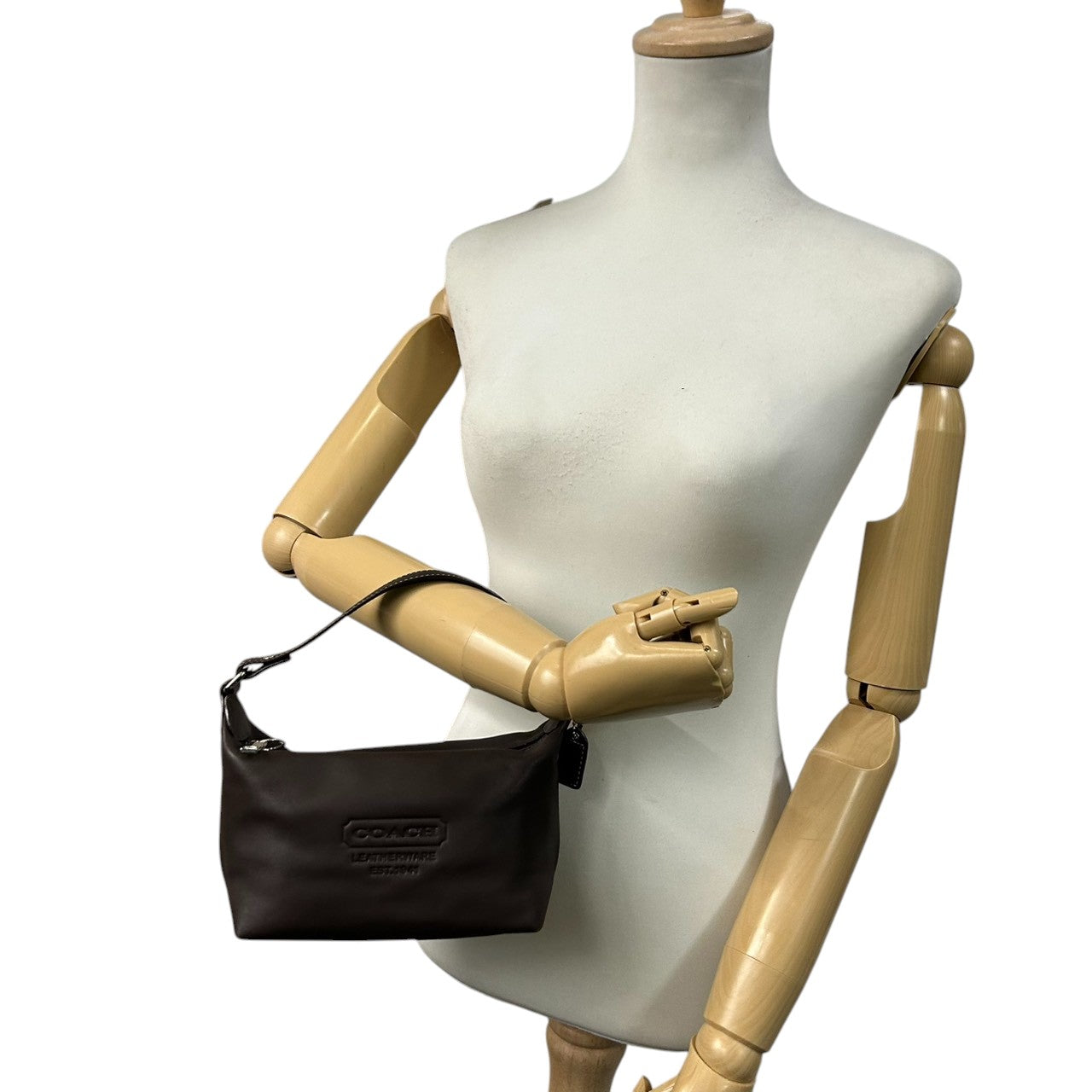 美品 コーチ COACH レザー ハンドバッグ アクセサリーポーチ ミニバッグ 本革 ダークブラウン こげ茶 エンボスロゴ ステッチ レディース ポーチ バニティ 化粧ポーチ サブバッグ シンプル 上品 軽量 お出かけ 鞄 カバン s85