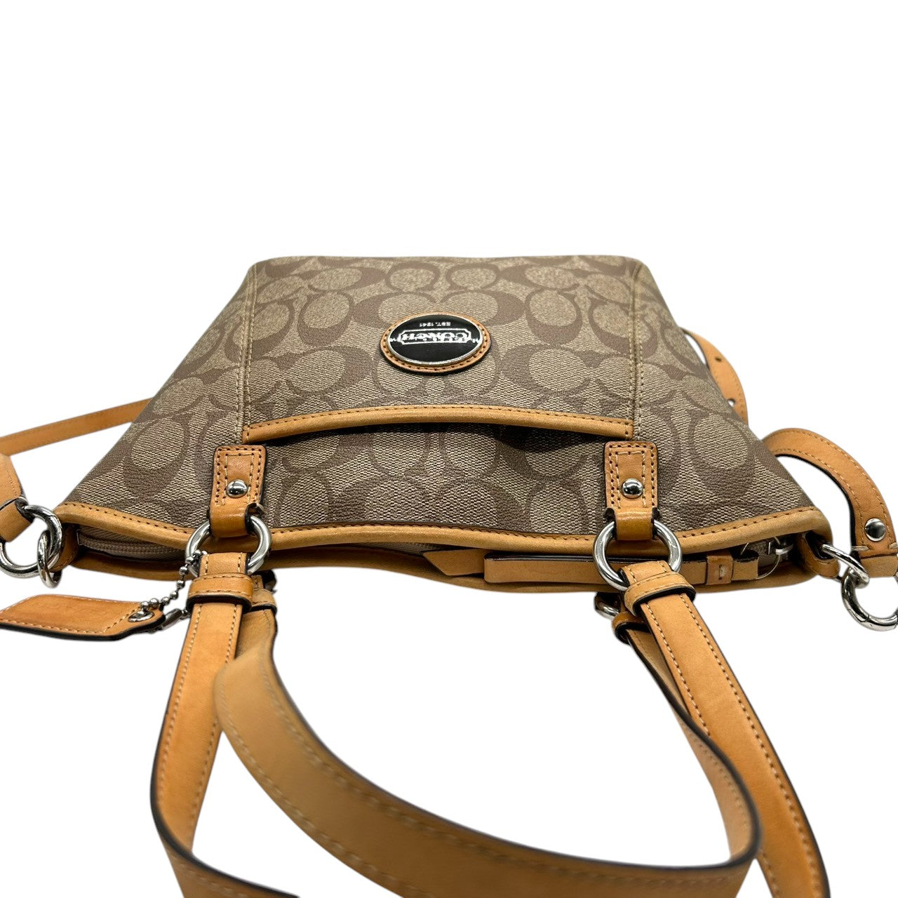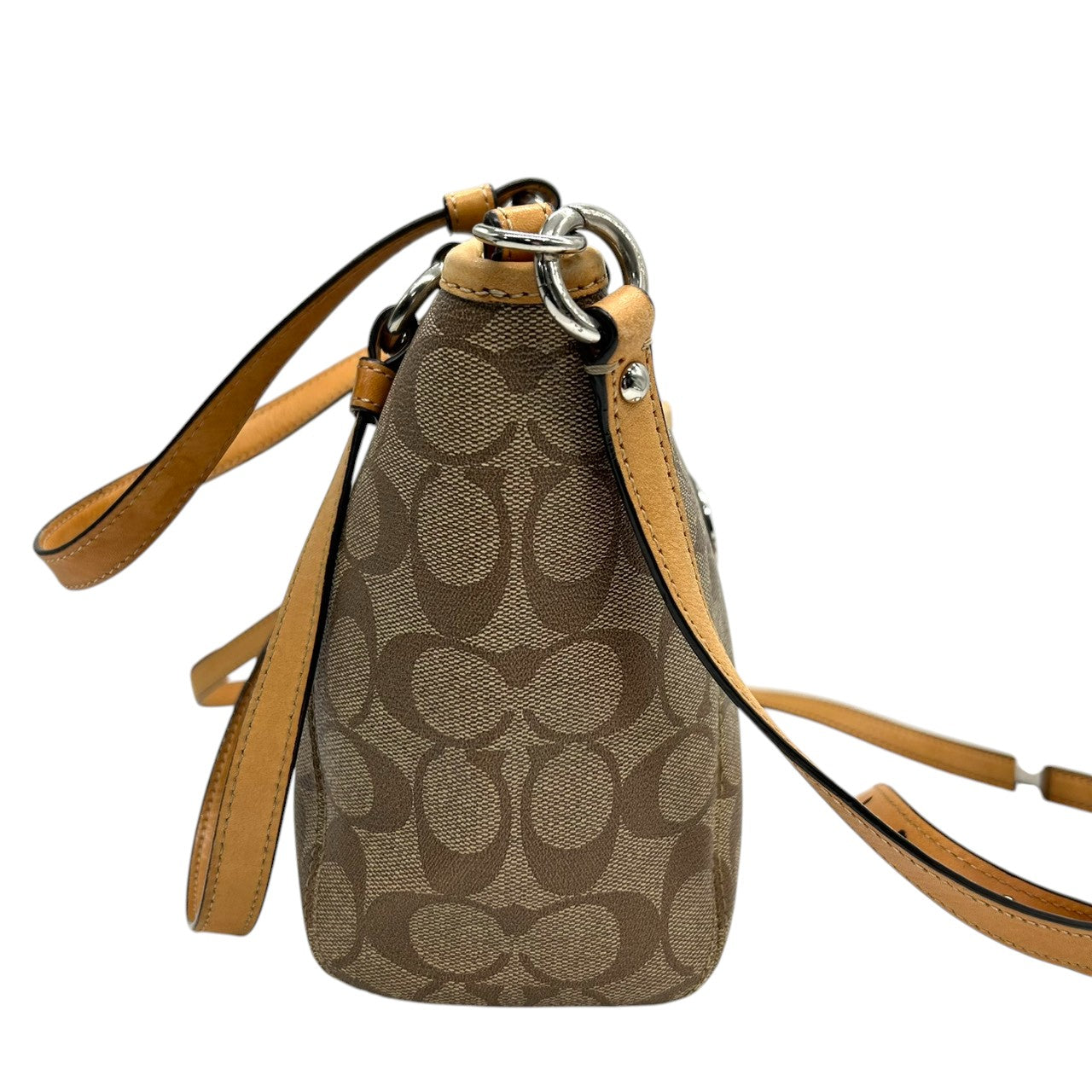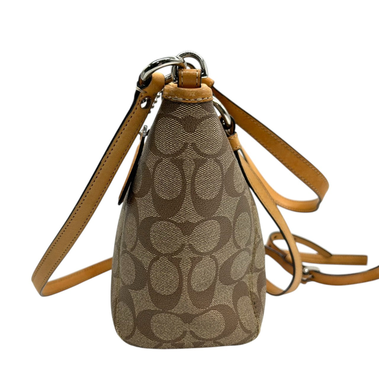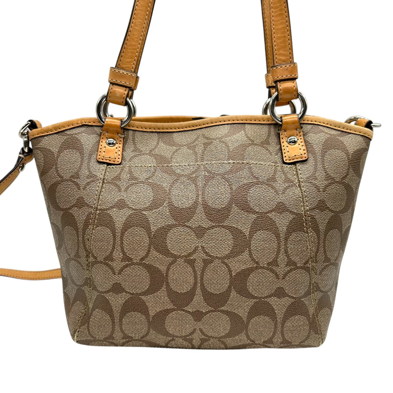 美品 コーチ COACH シグネチャー F20561 2WAY トートバッグ ショルダーバッグ ハンドバッグ 斜め掛け可 PVC レザー 本革 ベージュ ブラウン 茶 ロゴプレート レディース 軽量 撥水 肩掛け キャリーオール 鞄 カバン 通勤 通学 s85