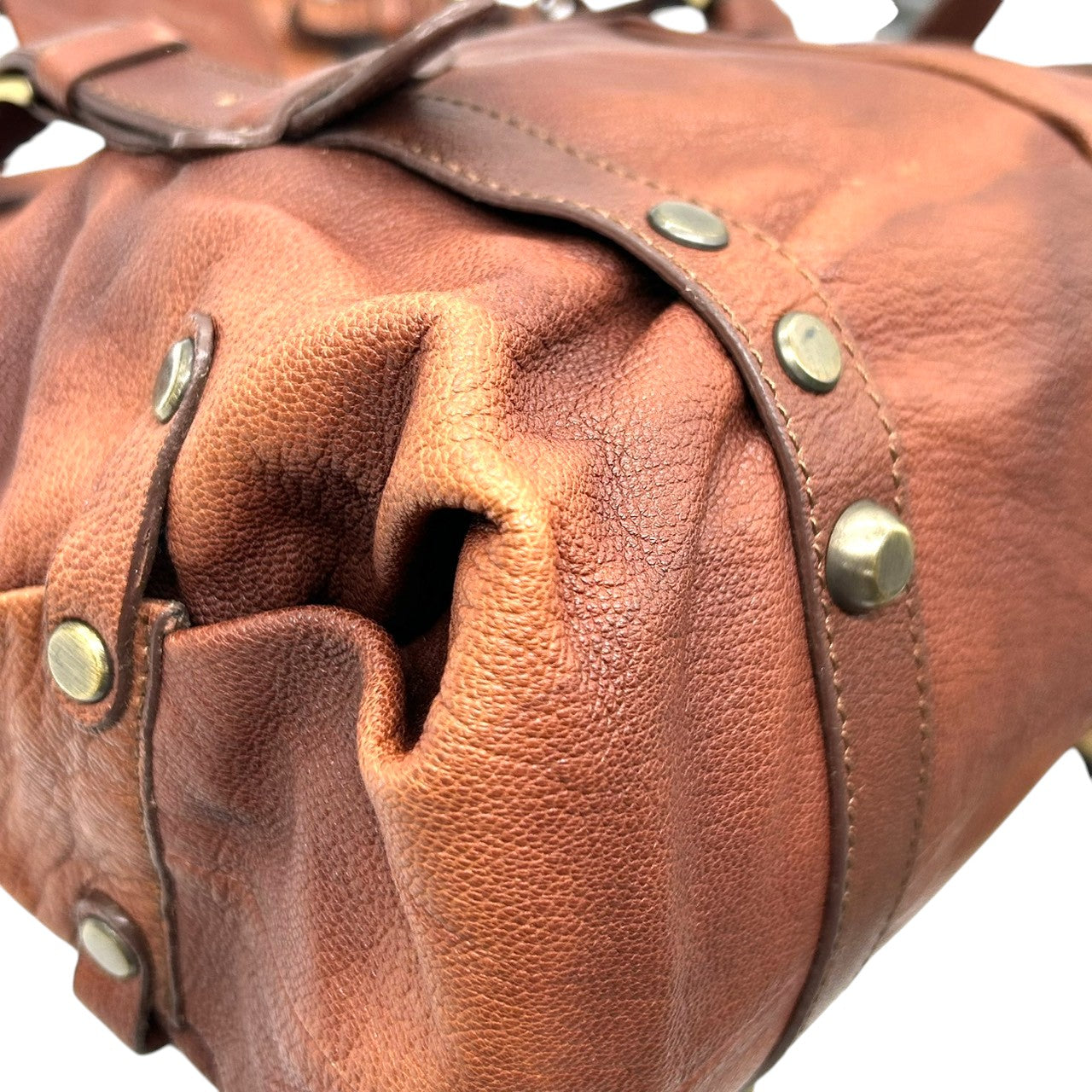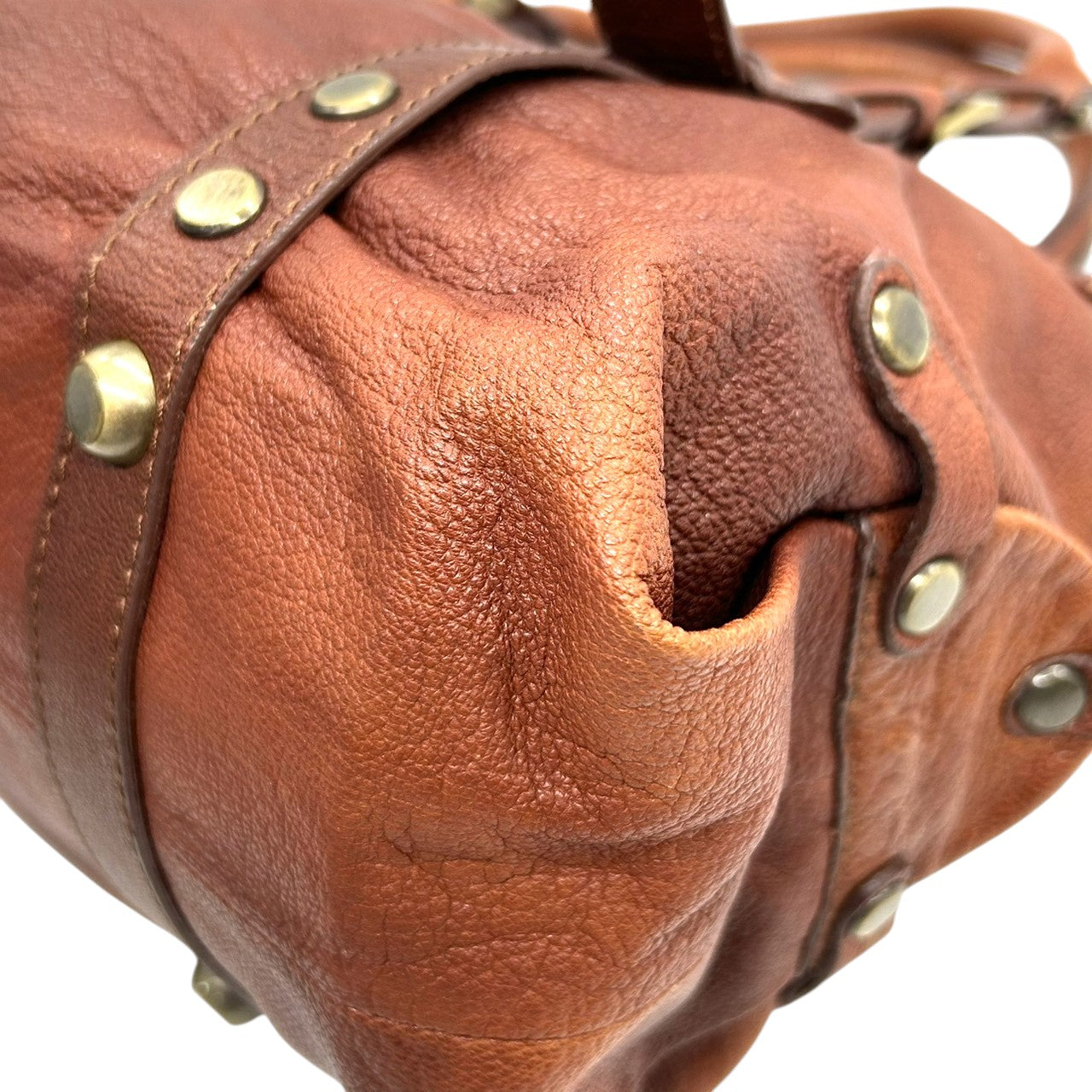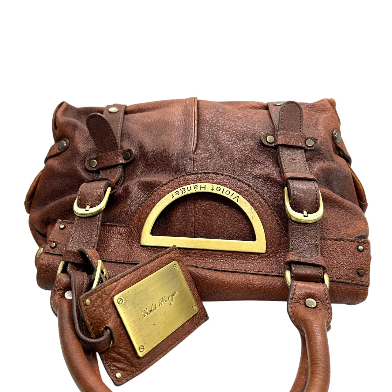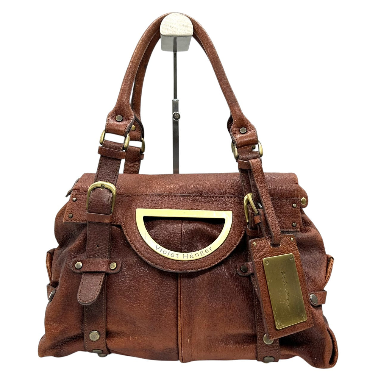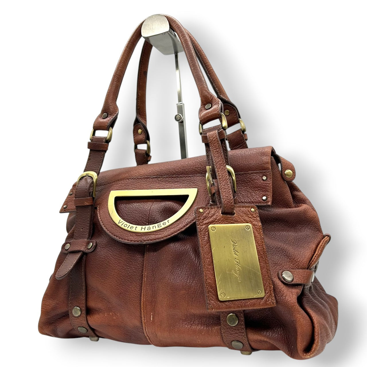 バイオレットハンガー Violet Hanger ハンドバッグ トートバッグ レザー 本革 ブラウン 茶 ゴールド金具 プレートチャーム付 スタッズ Dリング レディース マチ広 収納力 廃盤 希少 レア レトロ ビンテージ調 鞄 カバン s46