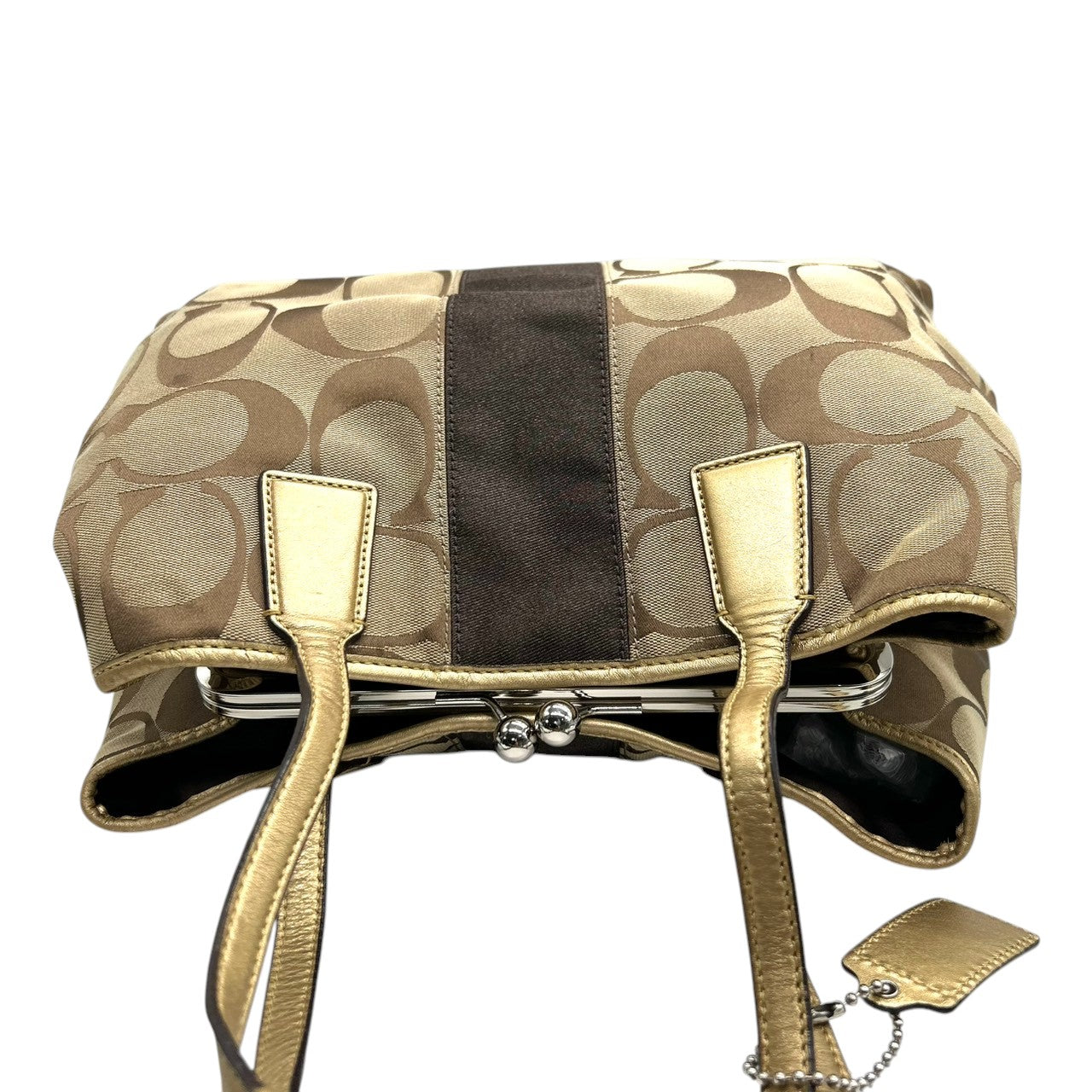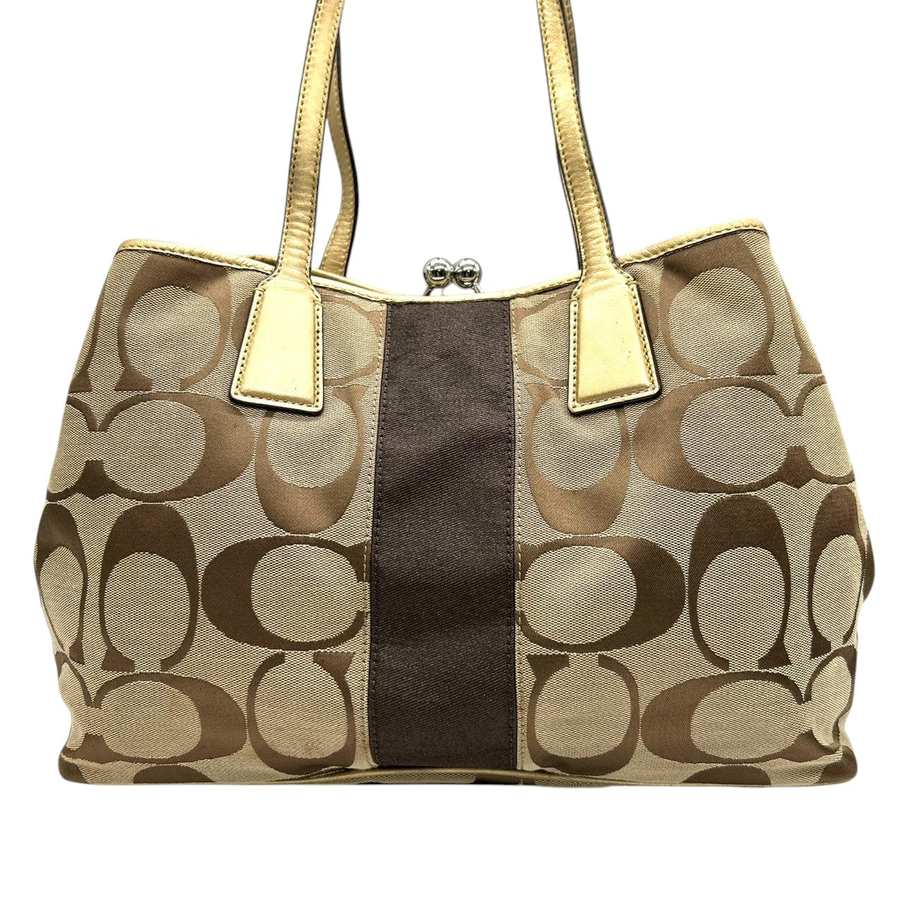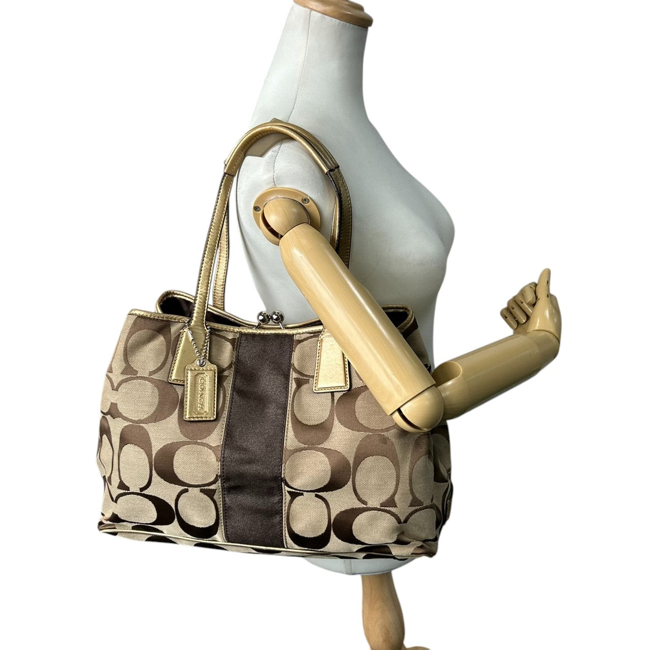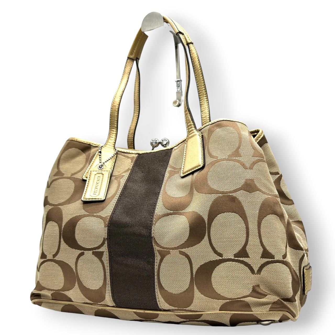 コーチ COACH シグネチャー ストライプ フレーム キャリーオール F13533 トートバッグ ショルダーバッグ ワンショルダー がま口 キスロック キャンバス レザー 本革 カーキ ブラウン ゴールド 肩掛け A4収納可 レディース 鞄 カバン s18