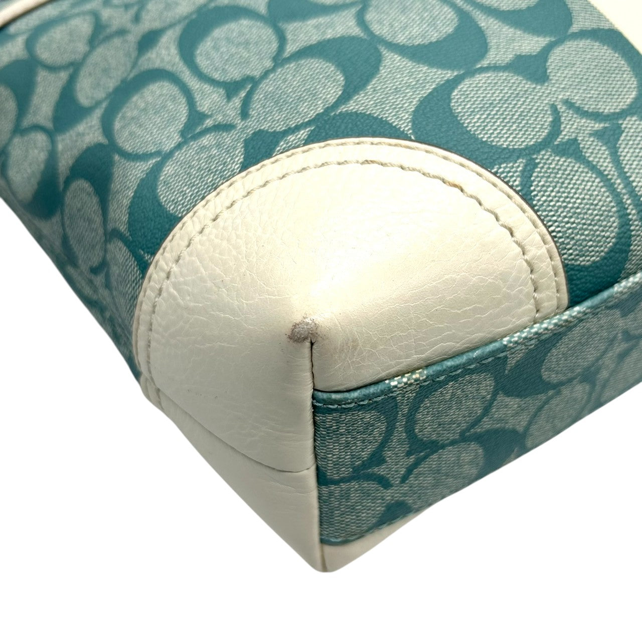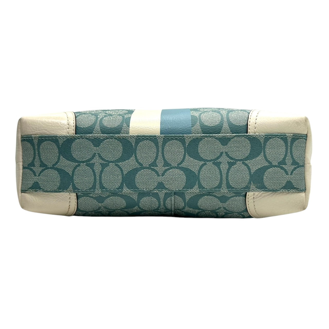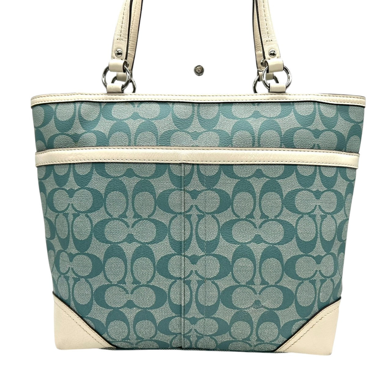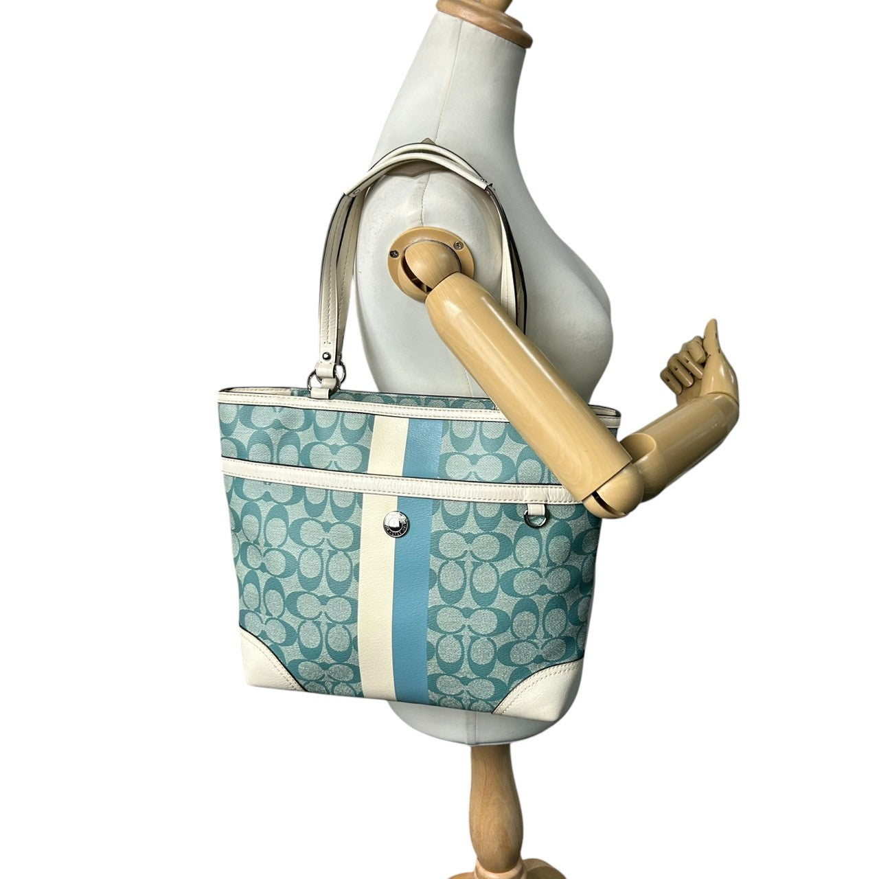 美品 コーチ COACH ヘリテージ ストライプ F14477 トートバッグ ショルダーバッグ 肩掛け PVC レザー シグネチャー 水色 ライトブルー 白 ホワイト A4収納可 レディース チャーム付 爽やか 通勤 通学 鞄 カバン s22