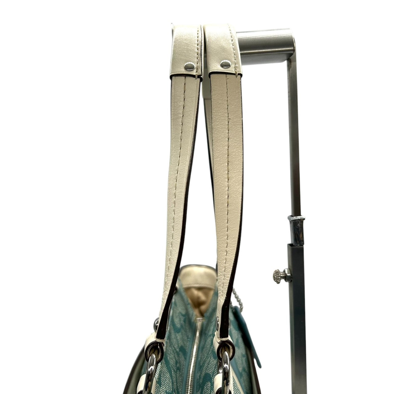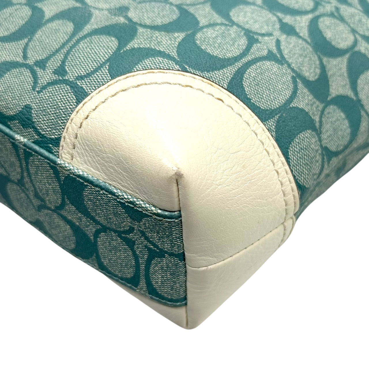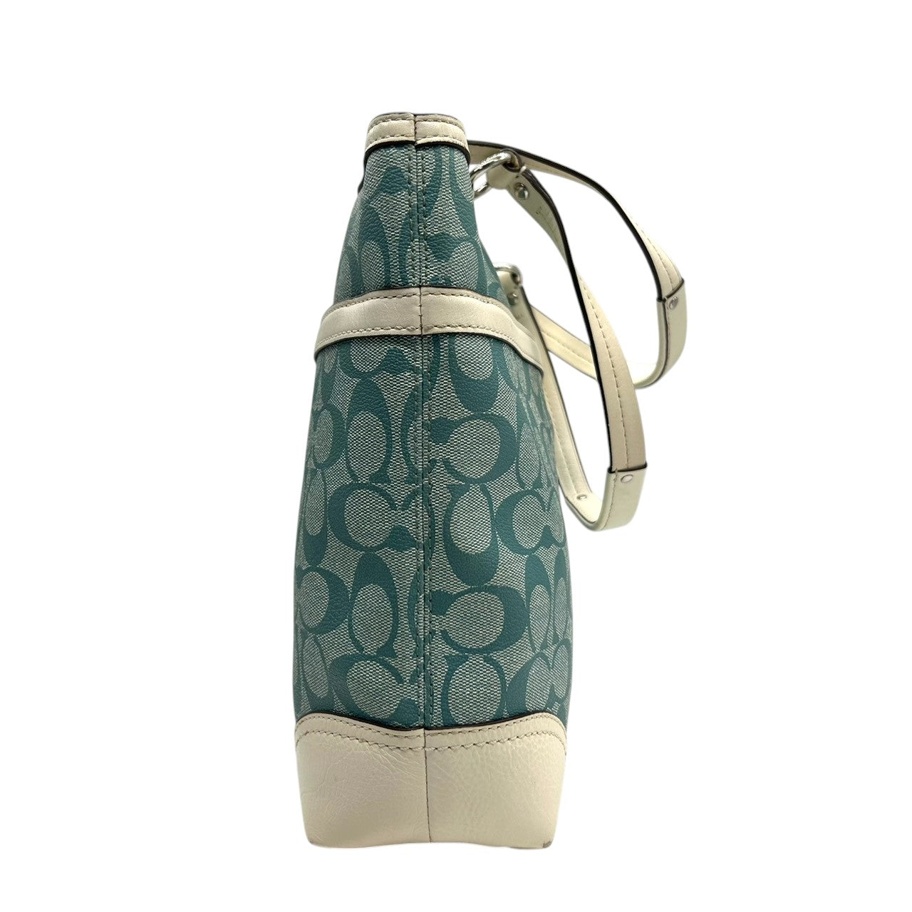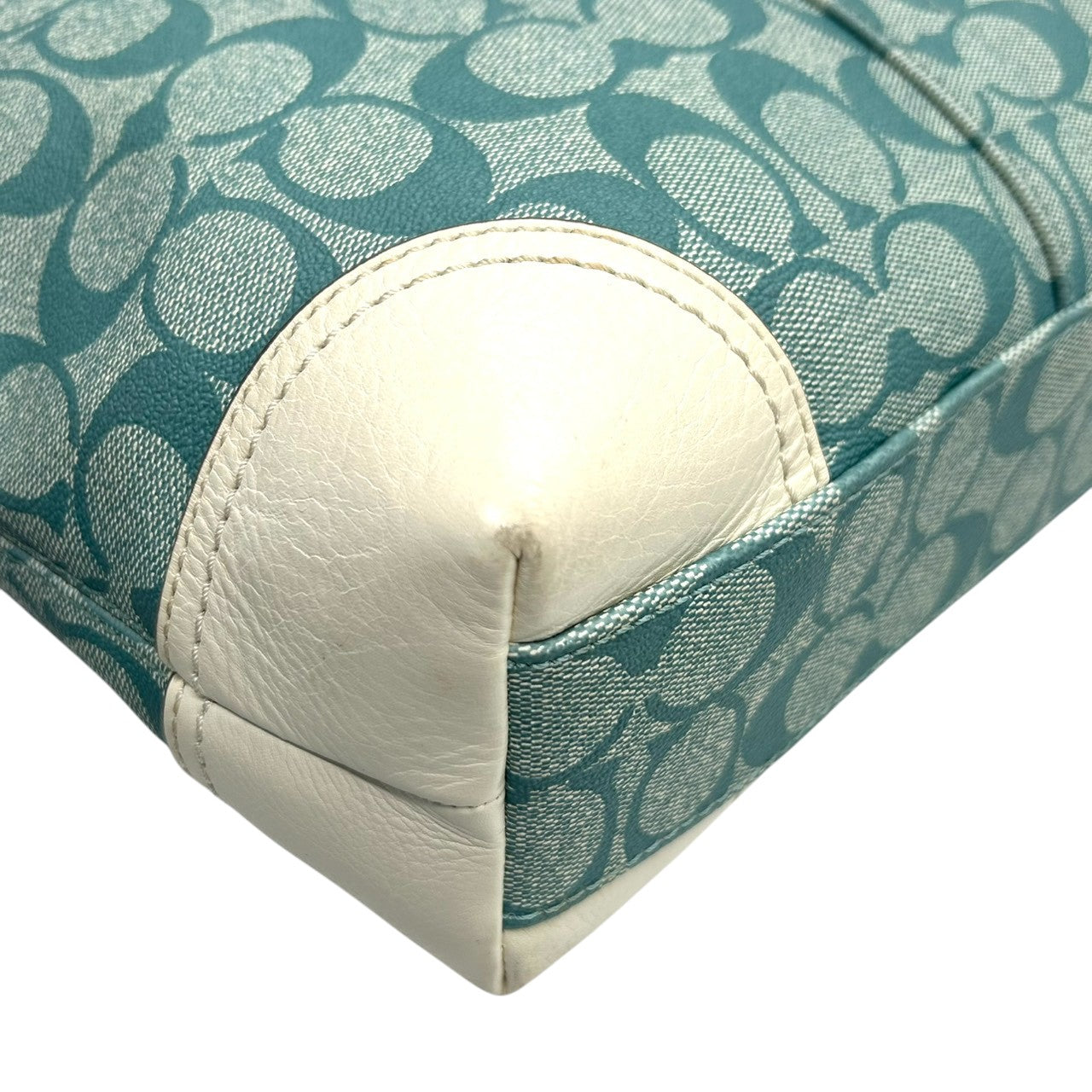 美品 コーチ COACH ヘリテージ ストライプ F14477 トートバッグ ショルダーバッグ 肩掛け PVC レザー シグネチャー 水色 ライトブルー 白 ホワイト A4収納可 レディース チャーム付 爽やか 通勤 通学 鞄 カバン s22