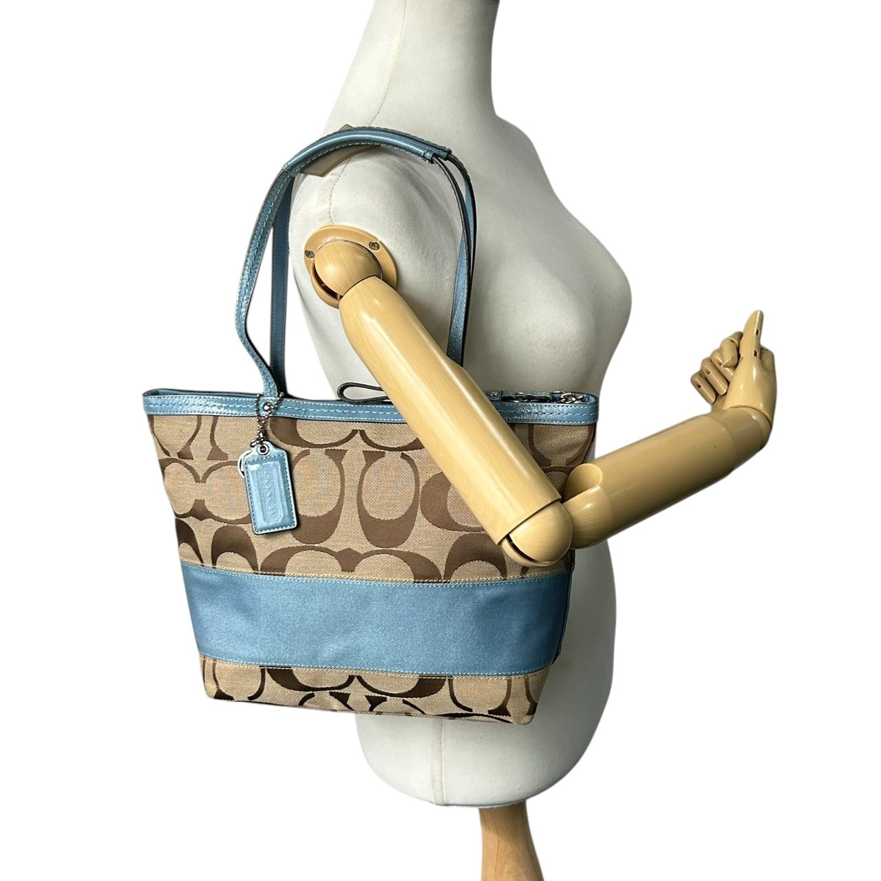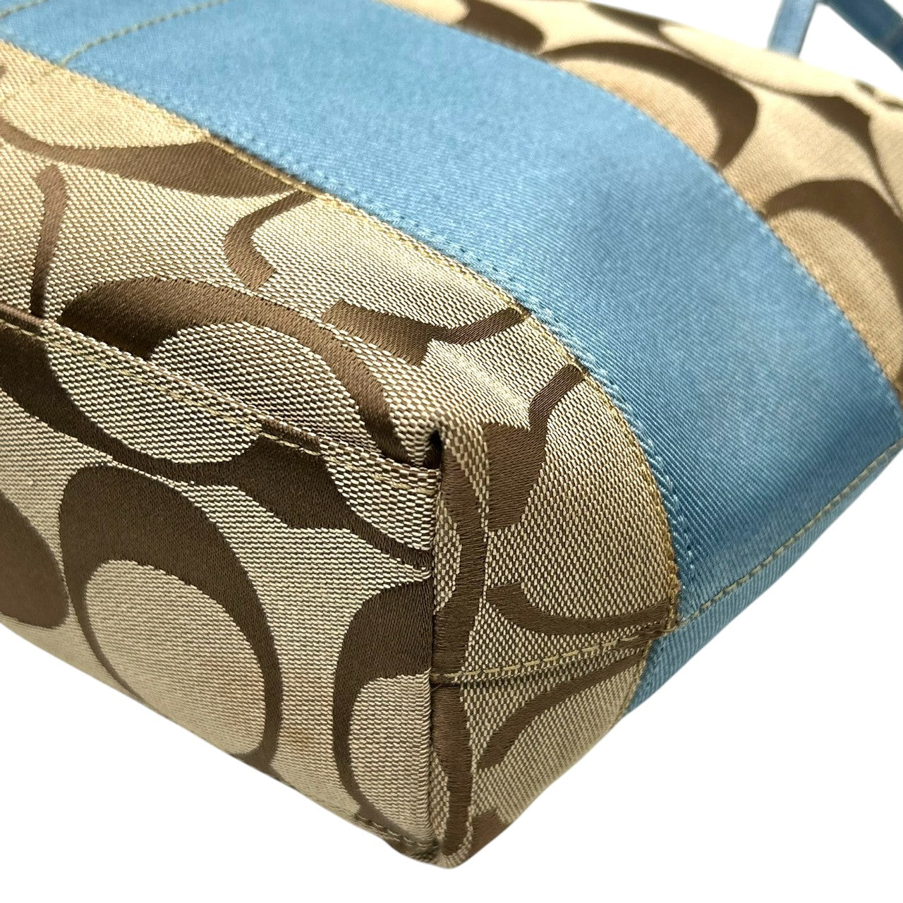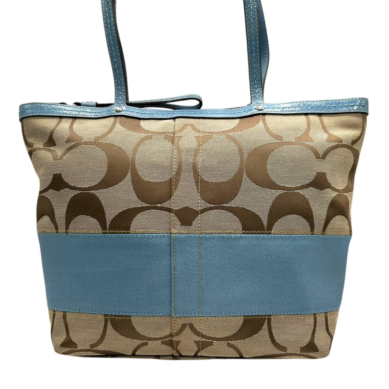 美品 コーチ COACH ヘリテージ ストライプ F14443 トートバッグ ショルダーバッグ 肩掛け キャンバス レザー シグネチャー 水色 ライトブルー 白 ホワイト A4収納可 レディース チャーム付 爽やか 通勤 通学 鞄 カバン s22