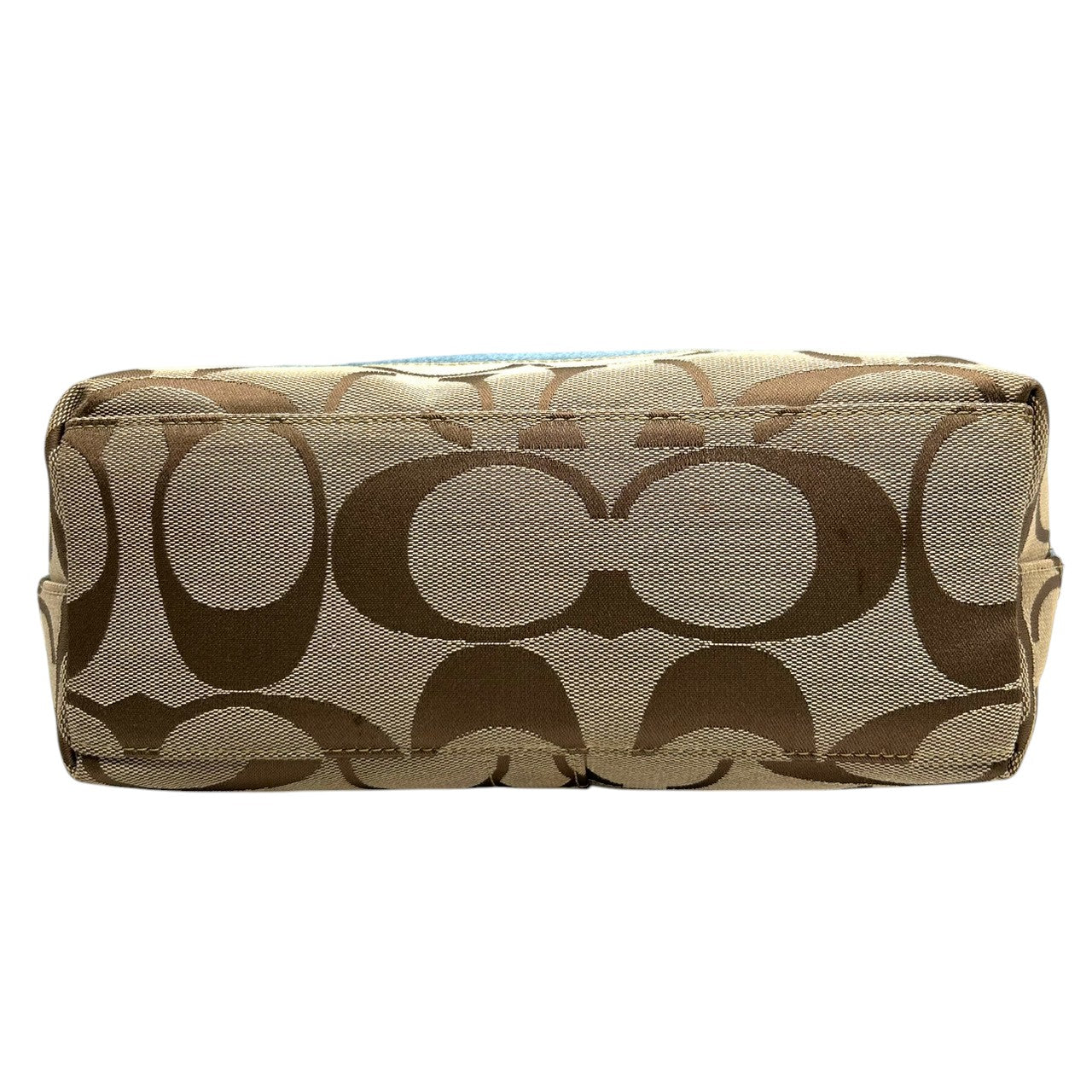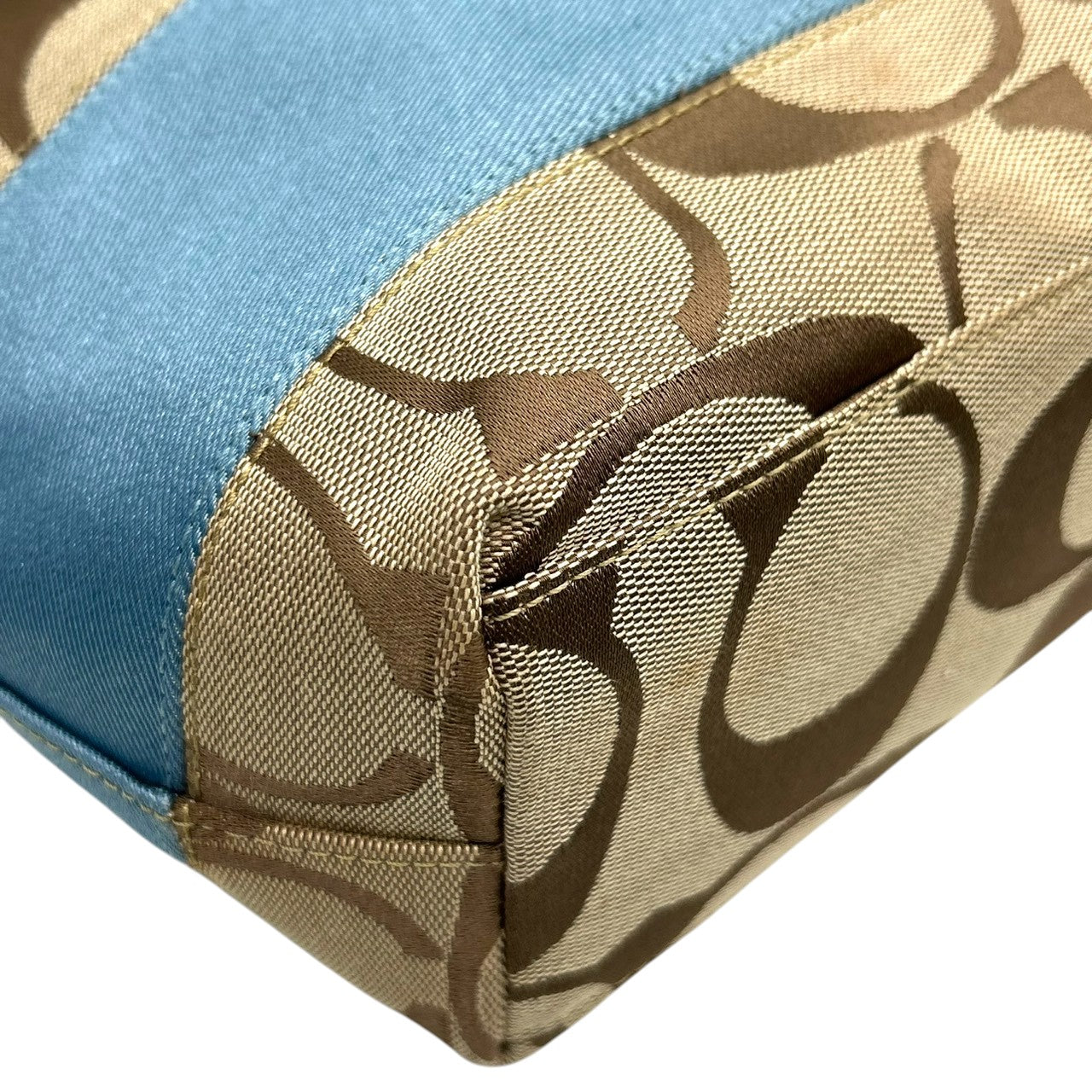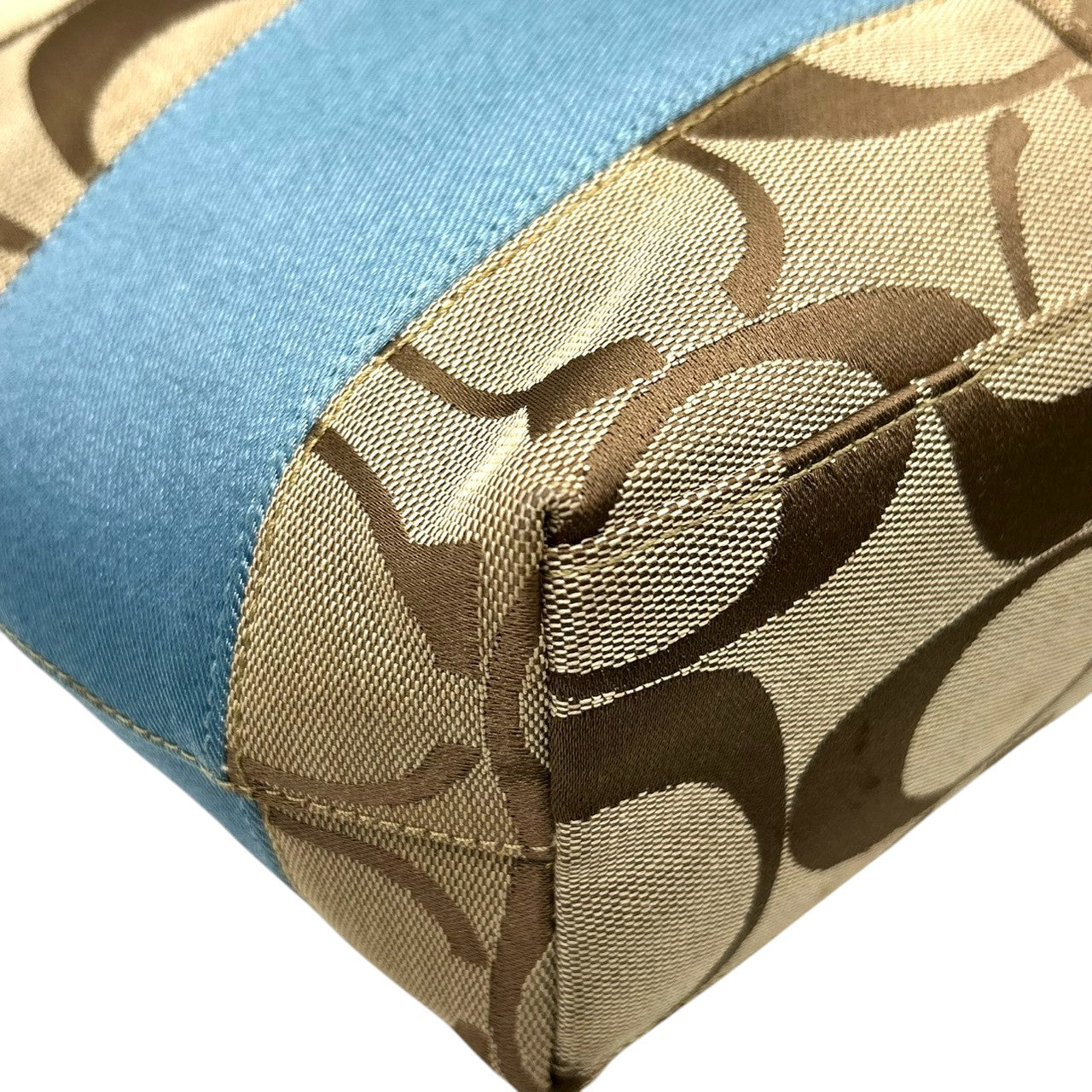 美品 コーチ COACH ヘリテージ ストライプ F14443 トートバッグ ショルダーバッグ 肩掛け キャンバス レザー シグネチャー 水色 ライトブルー 白 ホワイト A4収納可 レディース チャーム付 爽やか 通勤 通学 鞄 カバン s22