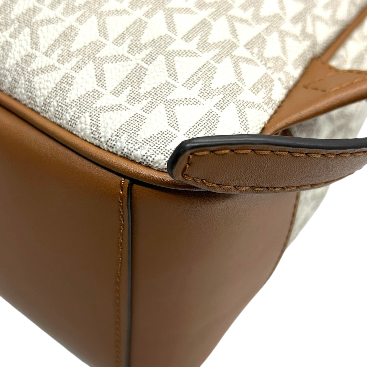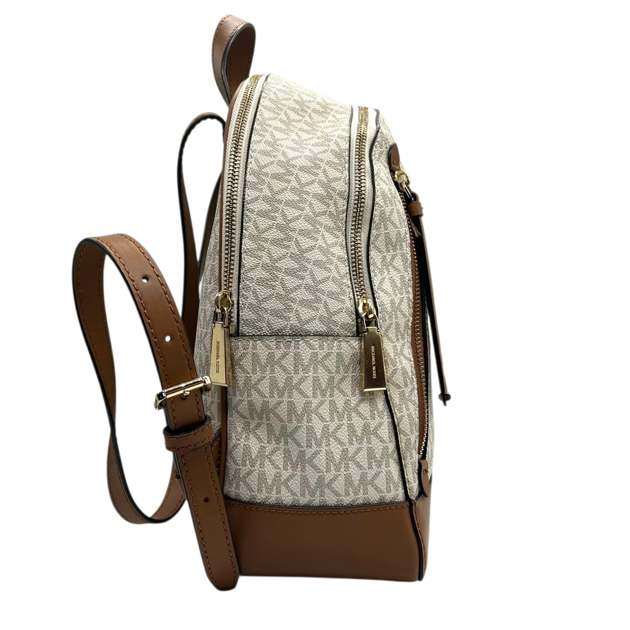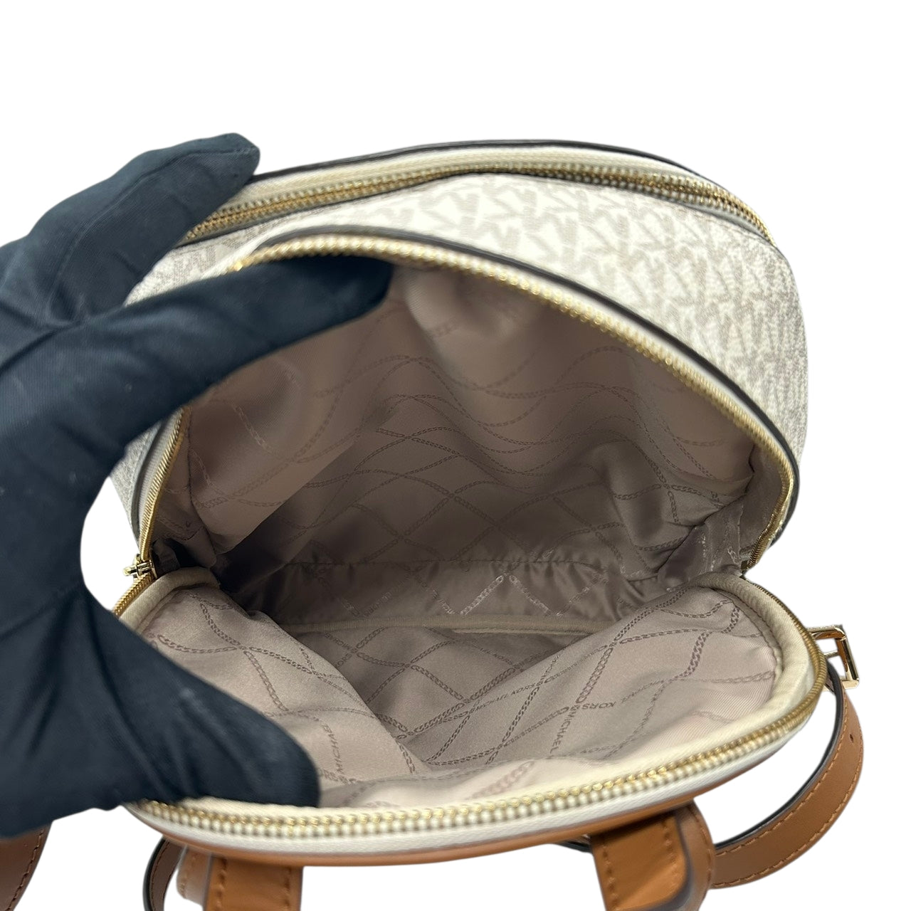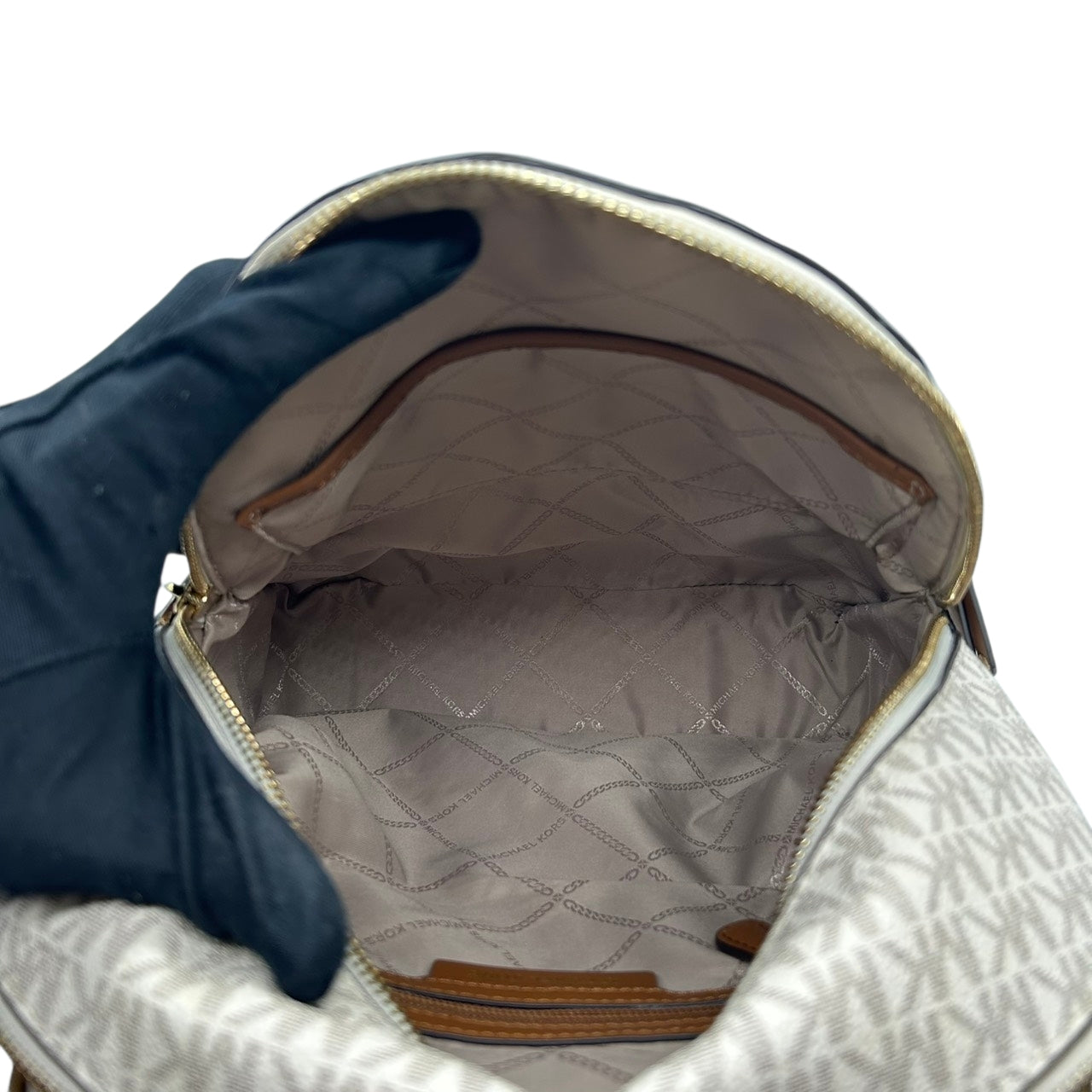 【美品】 マイケルコース MICHAEL KORS リュックサック バックパック シグネチャー MKロゴ 総柄 PVC レザー ブラウン ホワイト ゴールド金具 レディース エレガント カジュアル 通勤 通学 自立可 s94