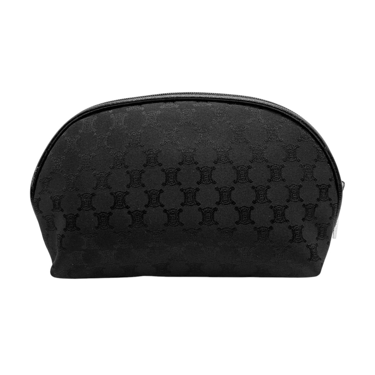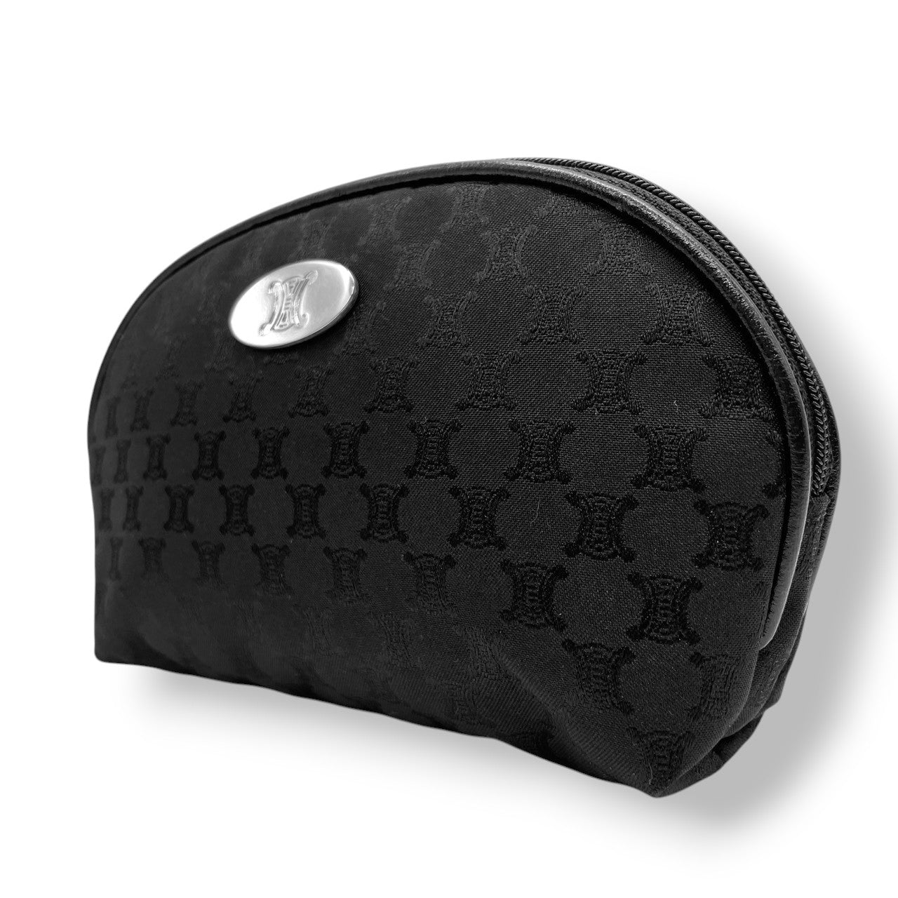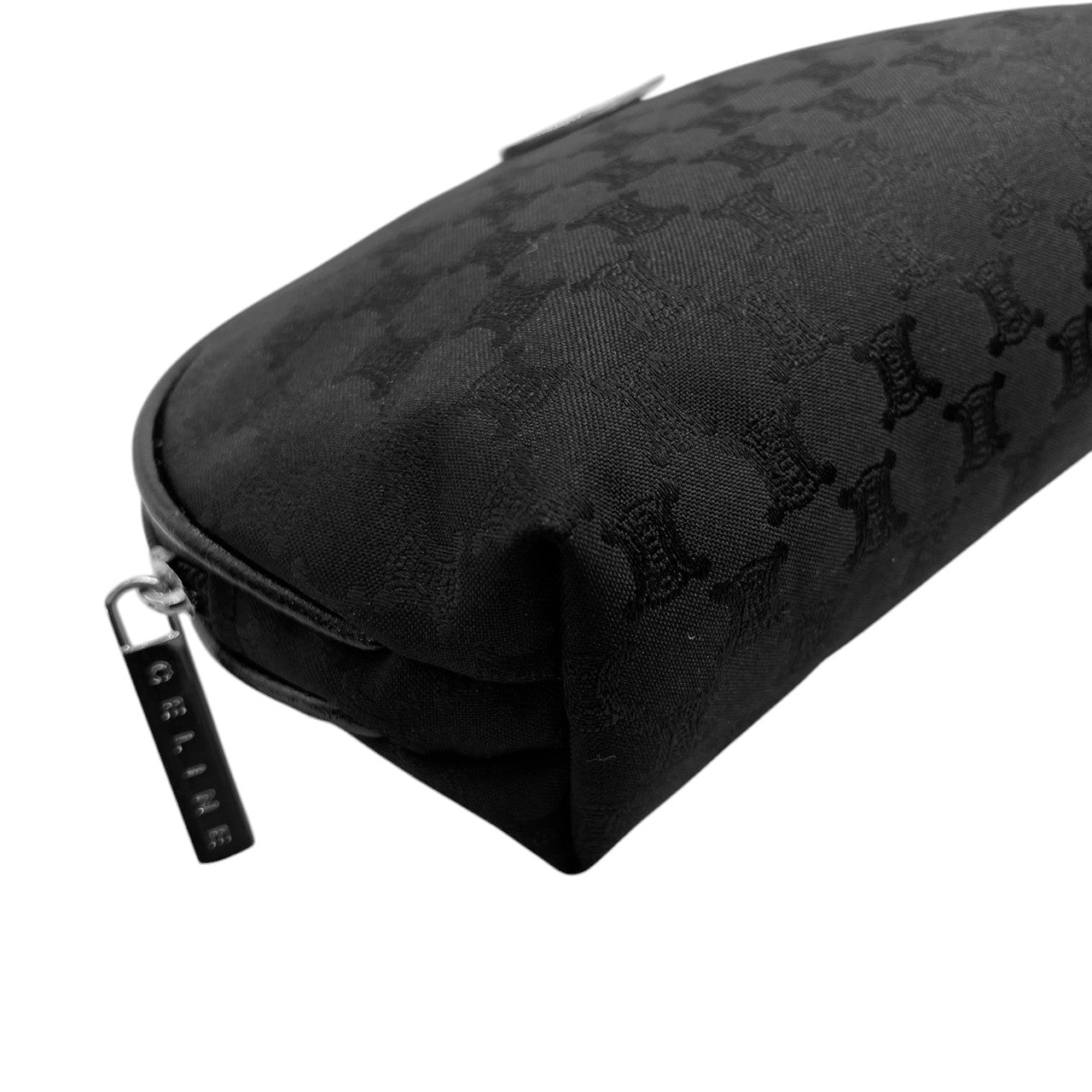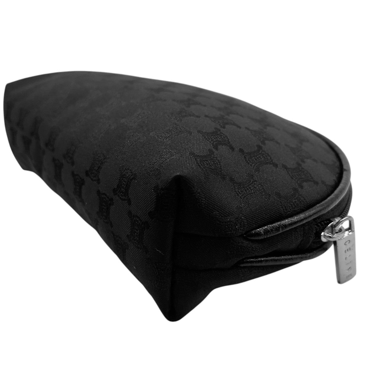 【未使用級】セリーヌ CELINE ポーチ 化粧ポーチ コスメポーチ 小物入れ トリオンフ マカダム 総柄 ロゴプレート ナイロン ブラック 黒 シルバー金具 レディース ノベルティ パルファム メイクポーチ トラベル 旅行 軽量 上品 エレガント 美品 m5