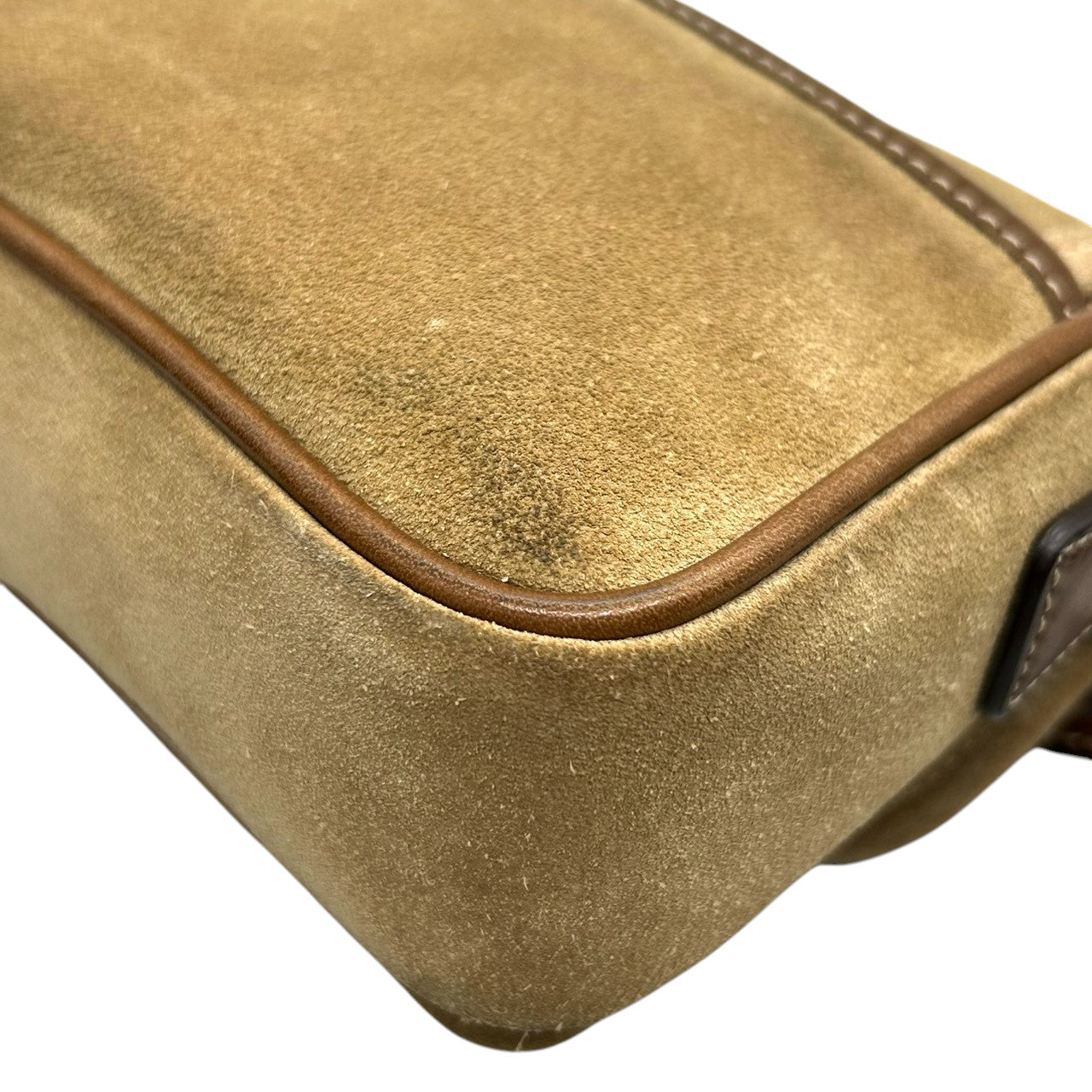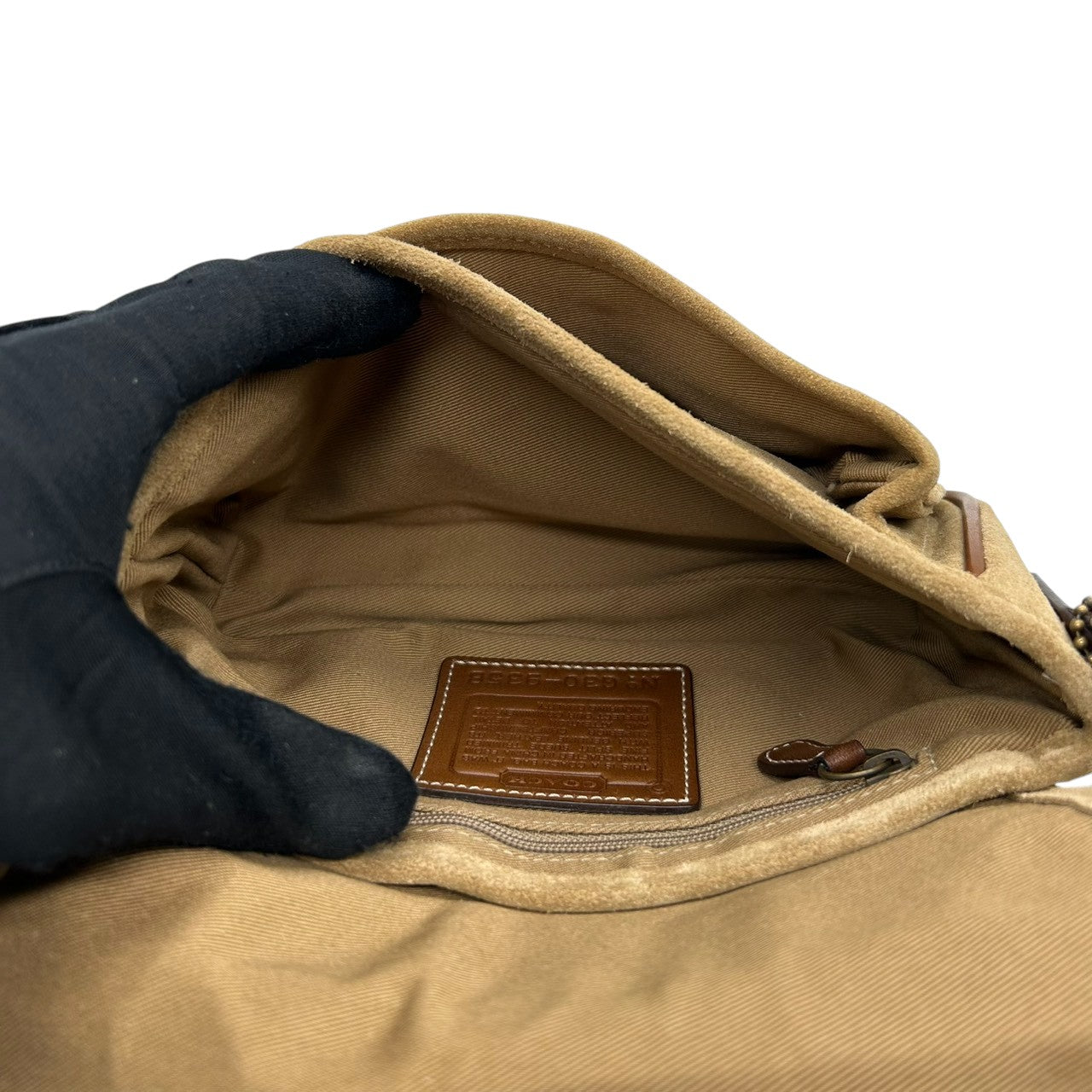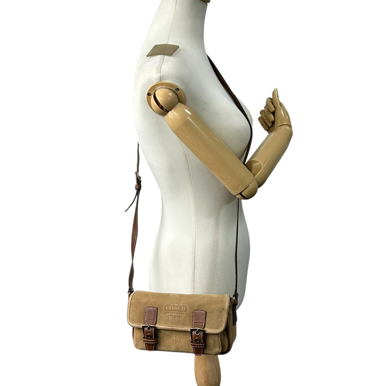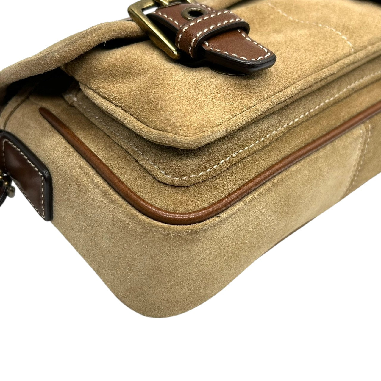 美品 コーチ COACH 9358 スウェード レザー ショルダーバッグ ポシェット 斜め掛け可 クロスボディ ベージュ キャメル ブラウン 茶 ダブルバックル ベルトデザイン エンボスロゴ ポケット レディース カジュアル お出かけ 鞄 カバン s88