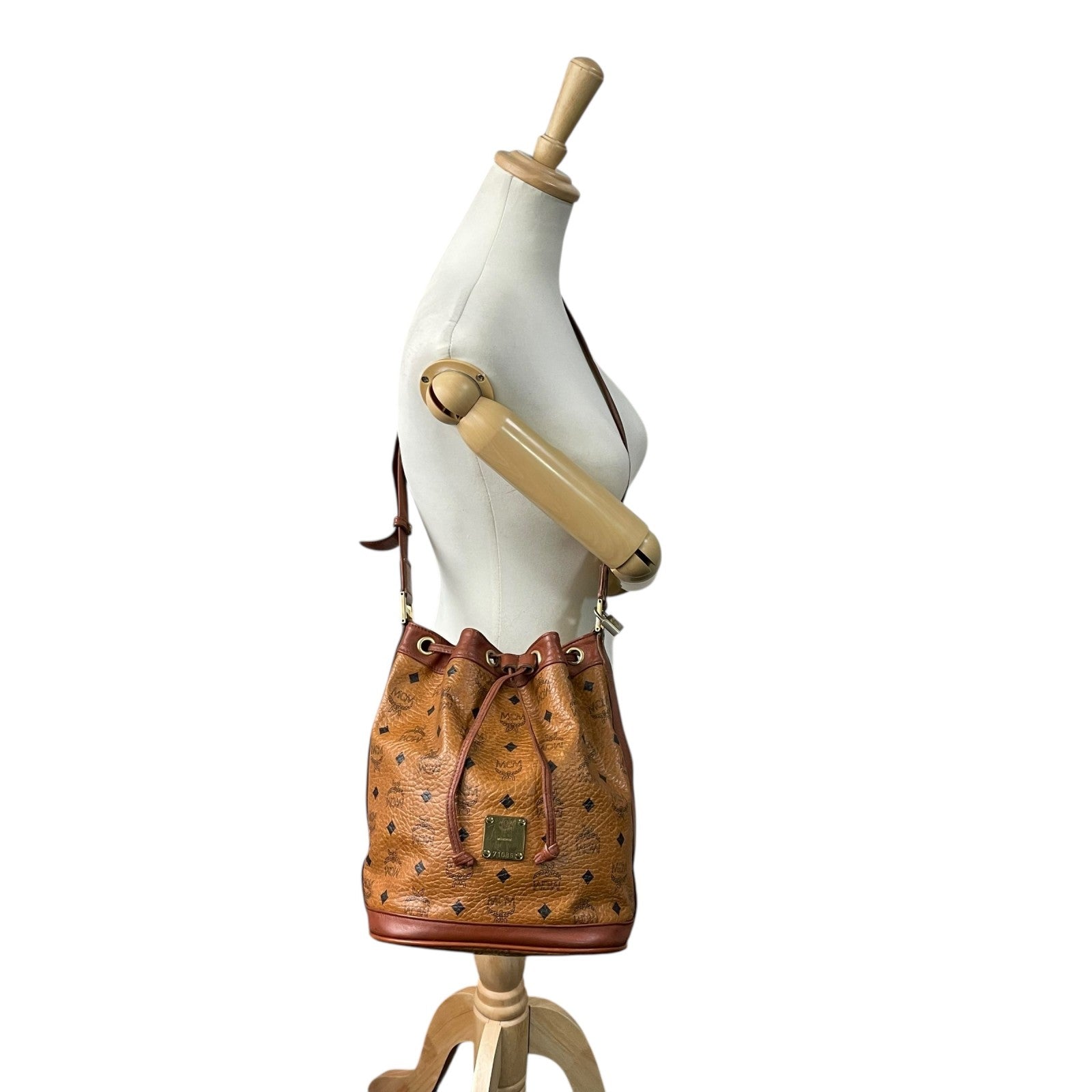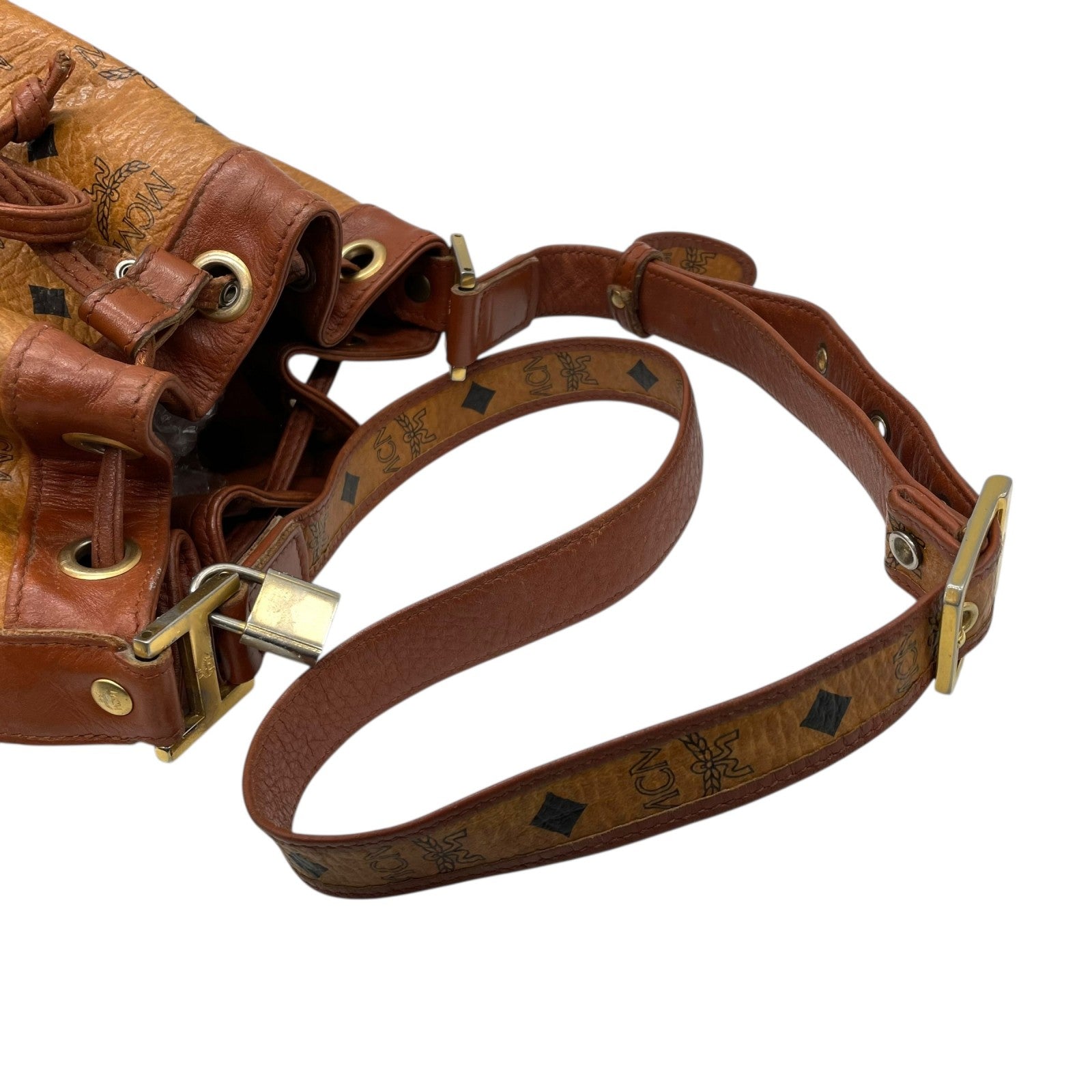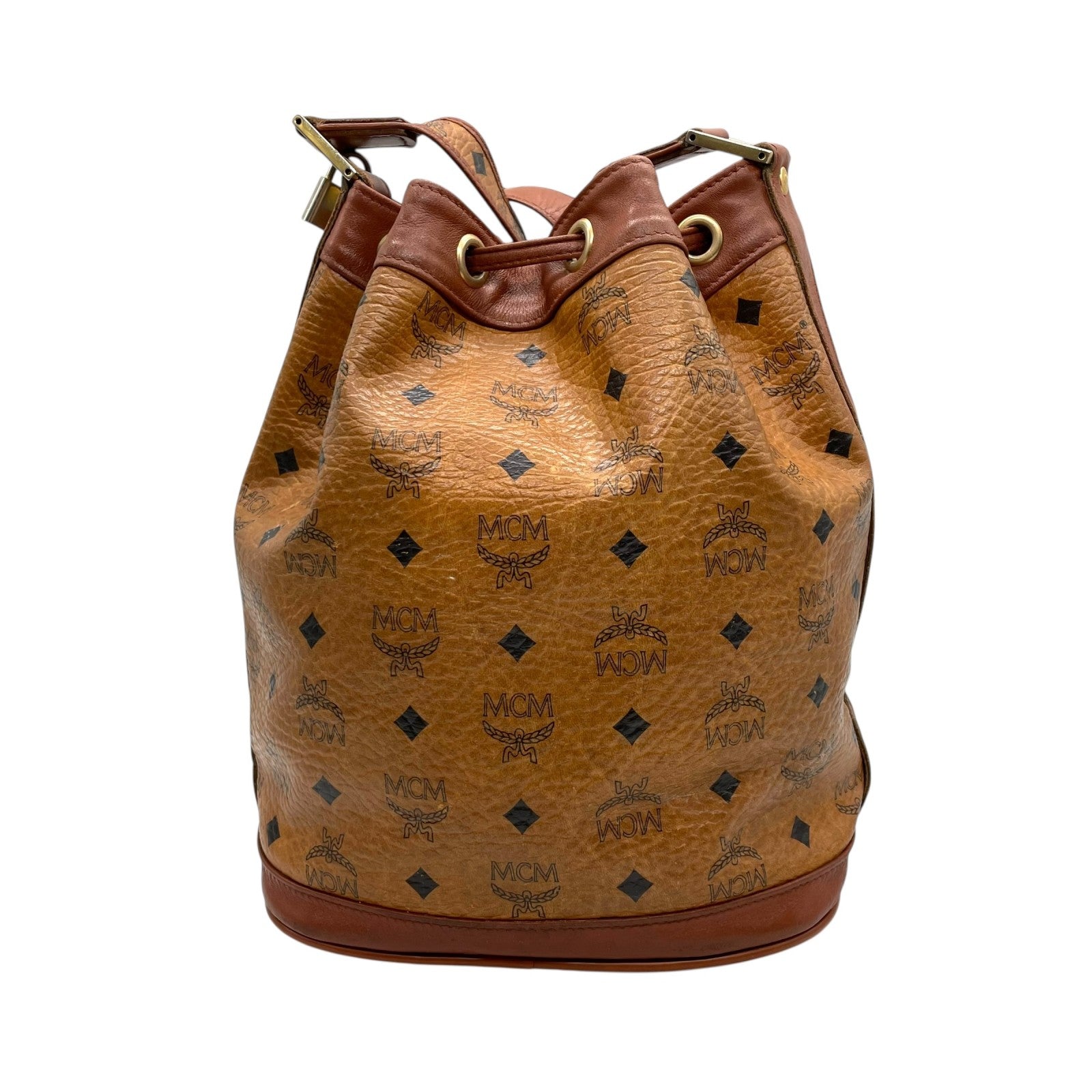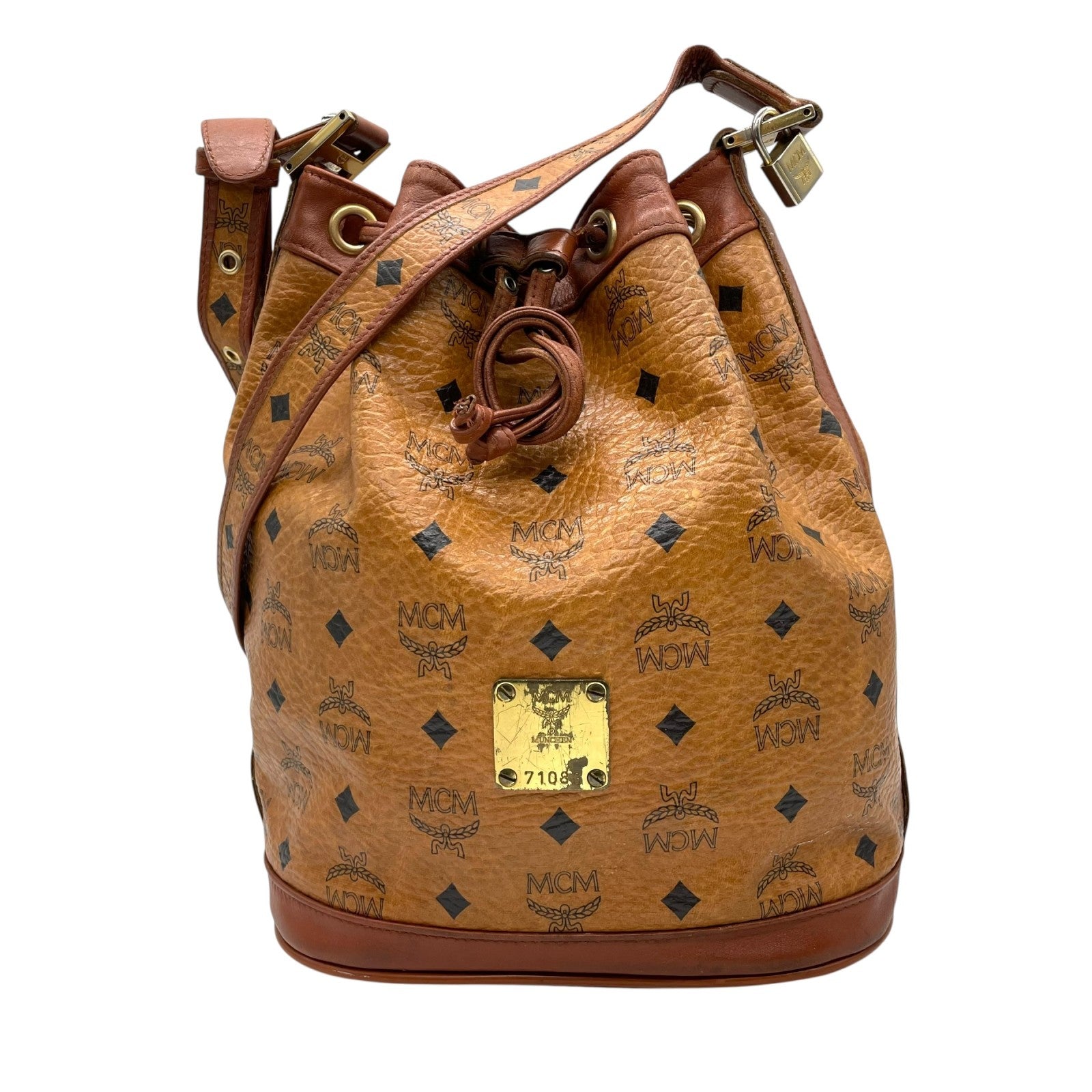 MCM ヴィンテージ ヴィセトス 巾着 ショルダーバッグ ドローストリング バケットバッグ ブラウン レザー切替 ゴールド金具 レディース D6