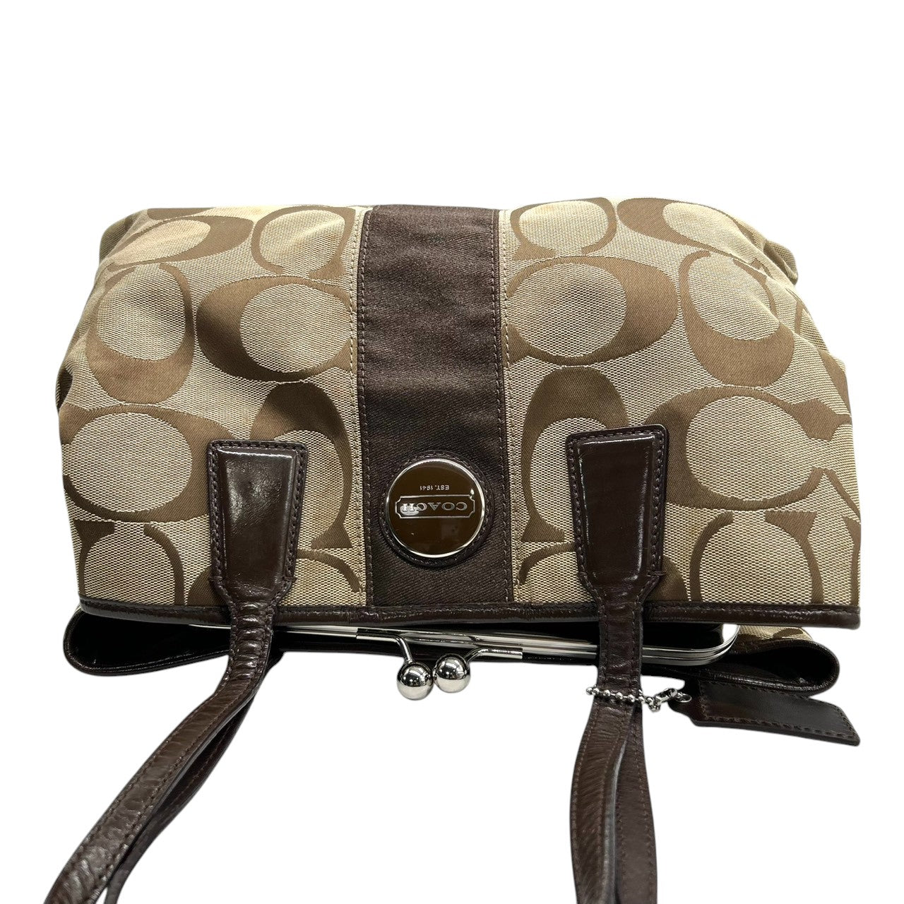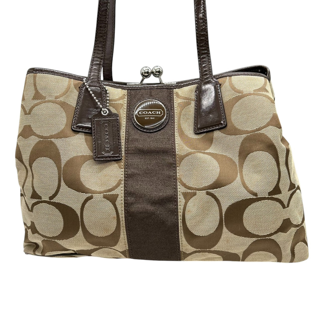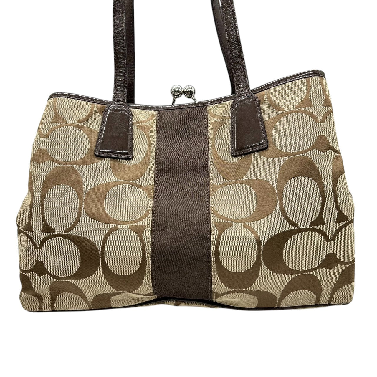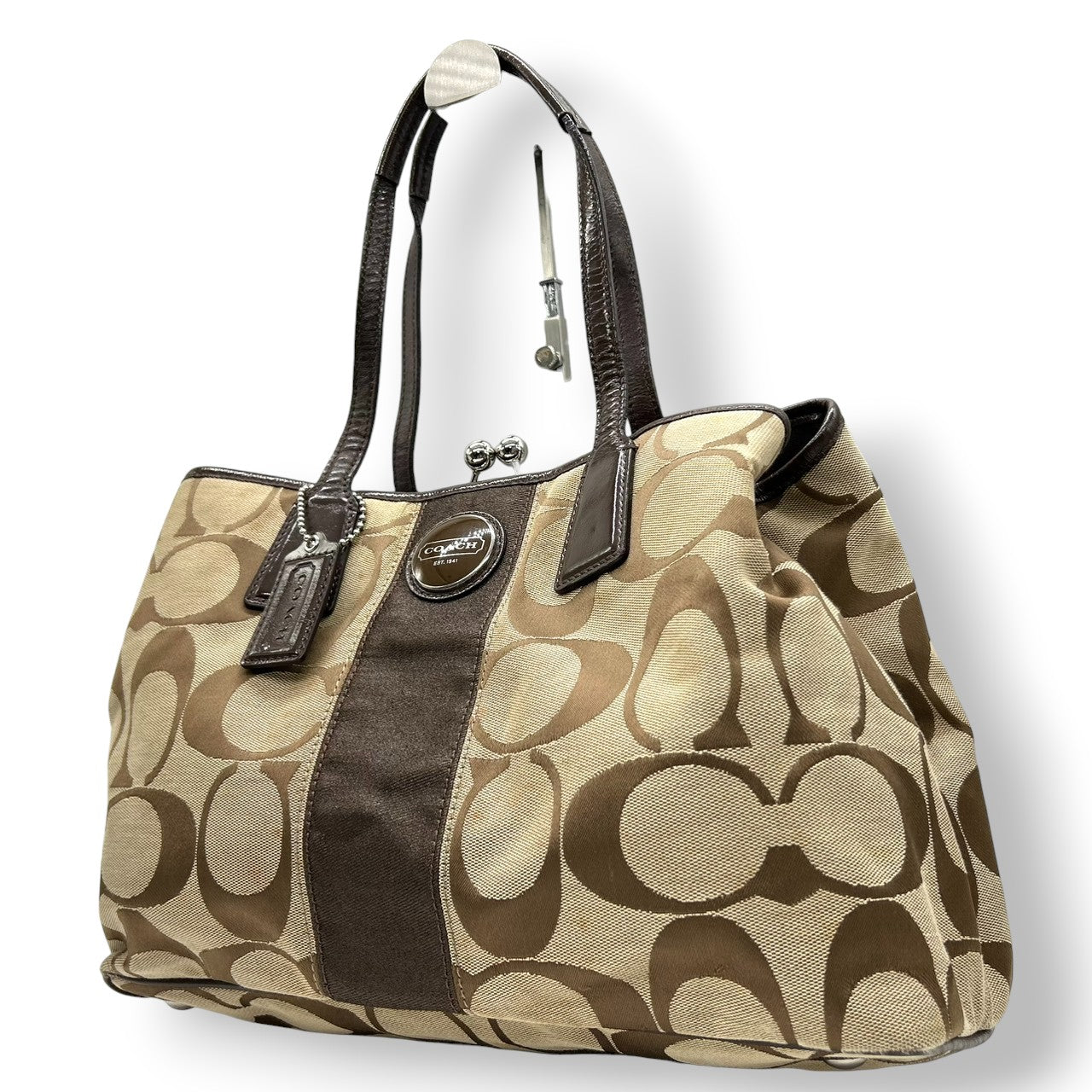 コーチ COACH パーカー シグネチャー トートバッグ ハンドバッグ キャリーオール F13533 キャンバス レザー 本革 ベージュ ブラウン 茶色 ガマ口 キスロック 3室構造 肩掛け ワンショルダー レディース 鞄 カバン 通勤 カジュアル s81